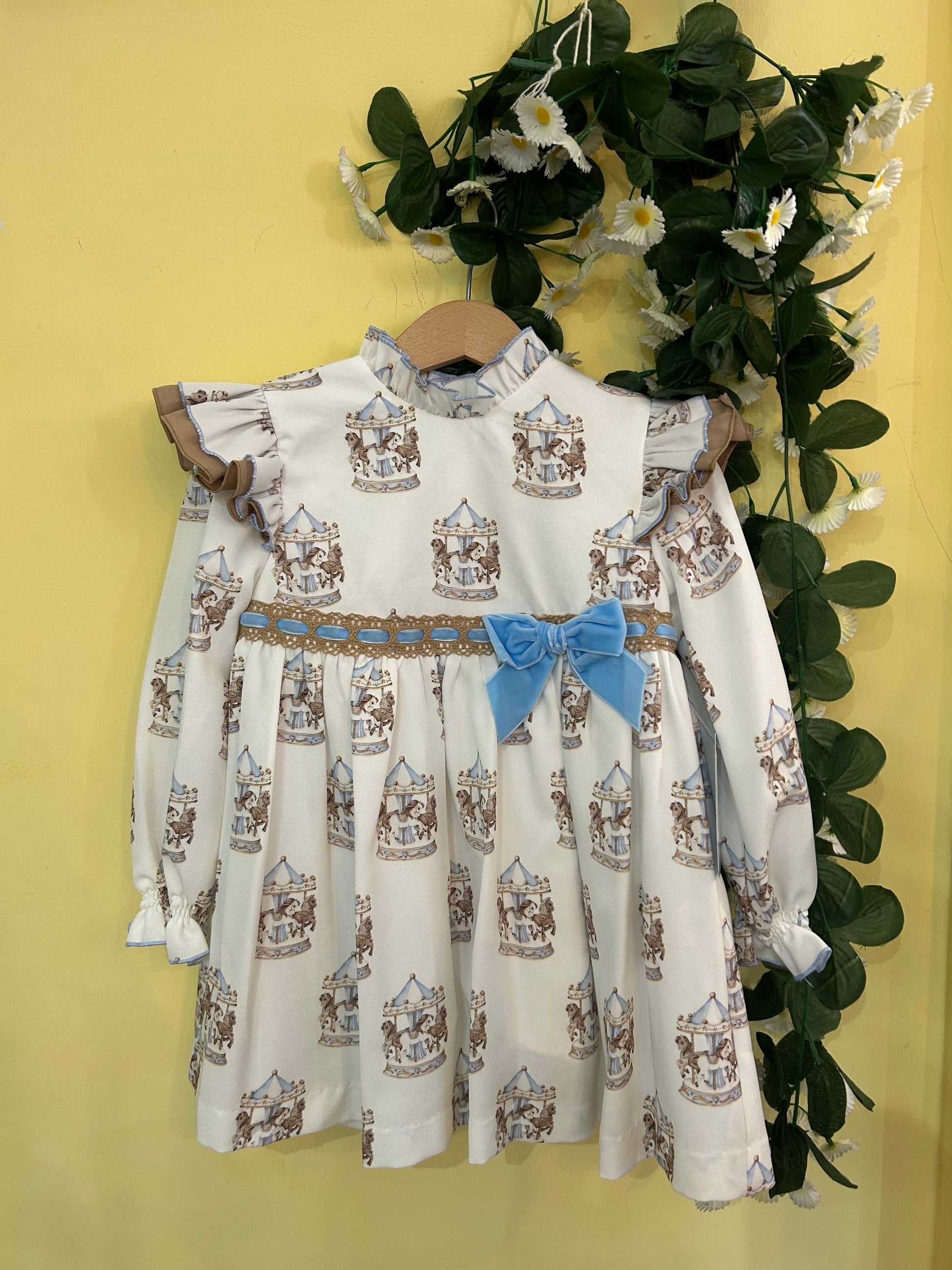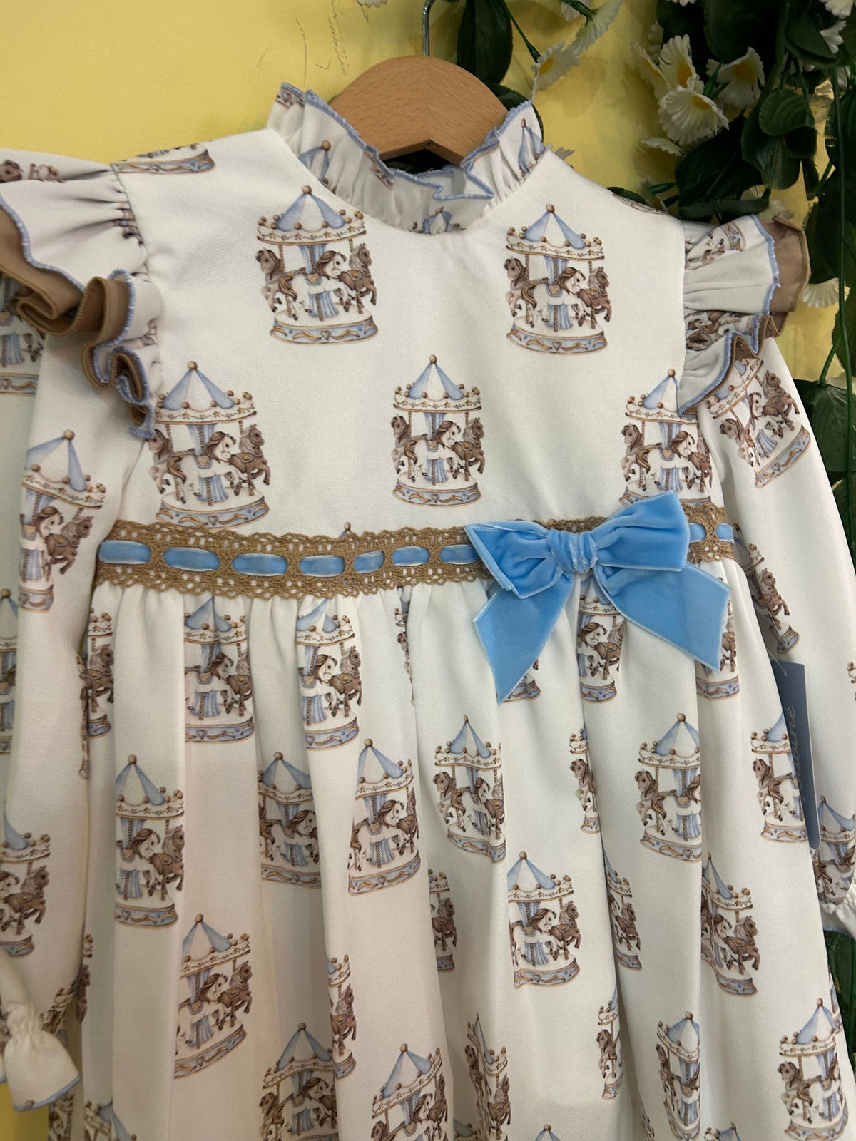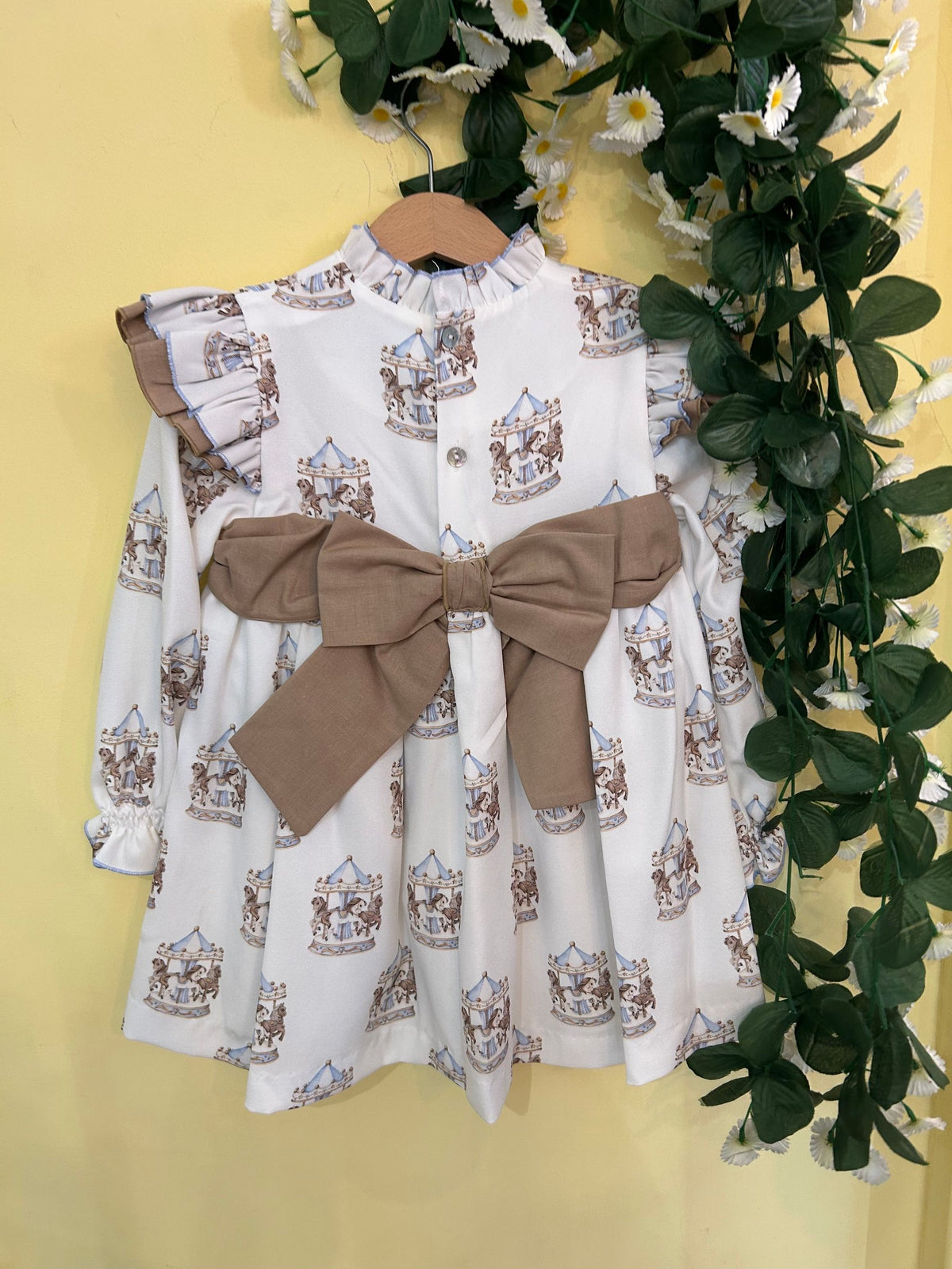 abito con colletto rouches e volant sulle spalle e nastrino in velluto in vita, sul retro un bellissimo fiocco rigido strutturato per regolare la larghezza dell'abito