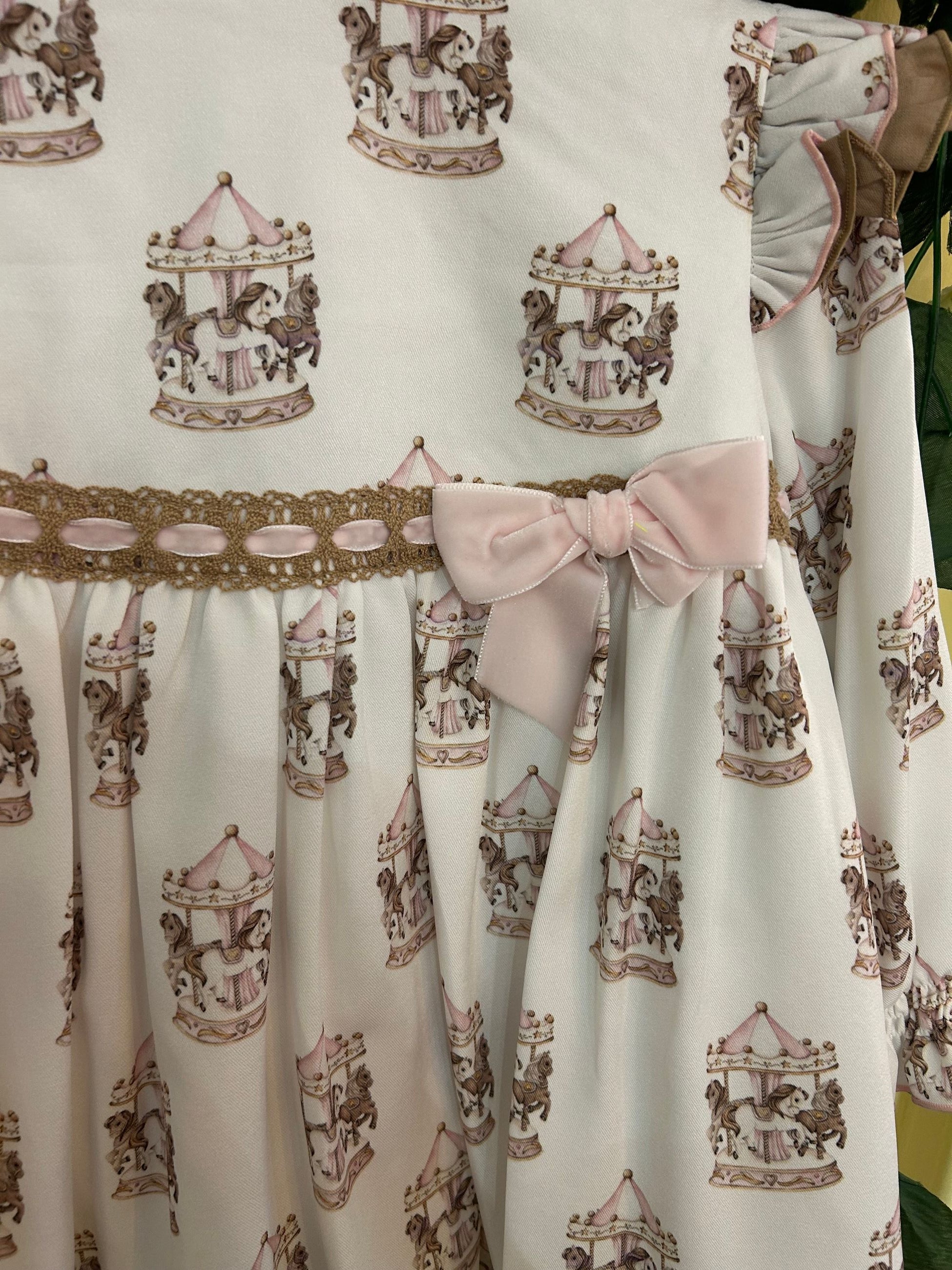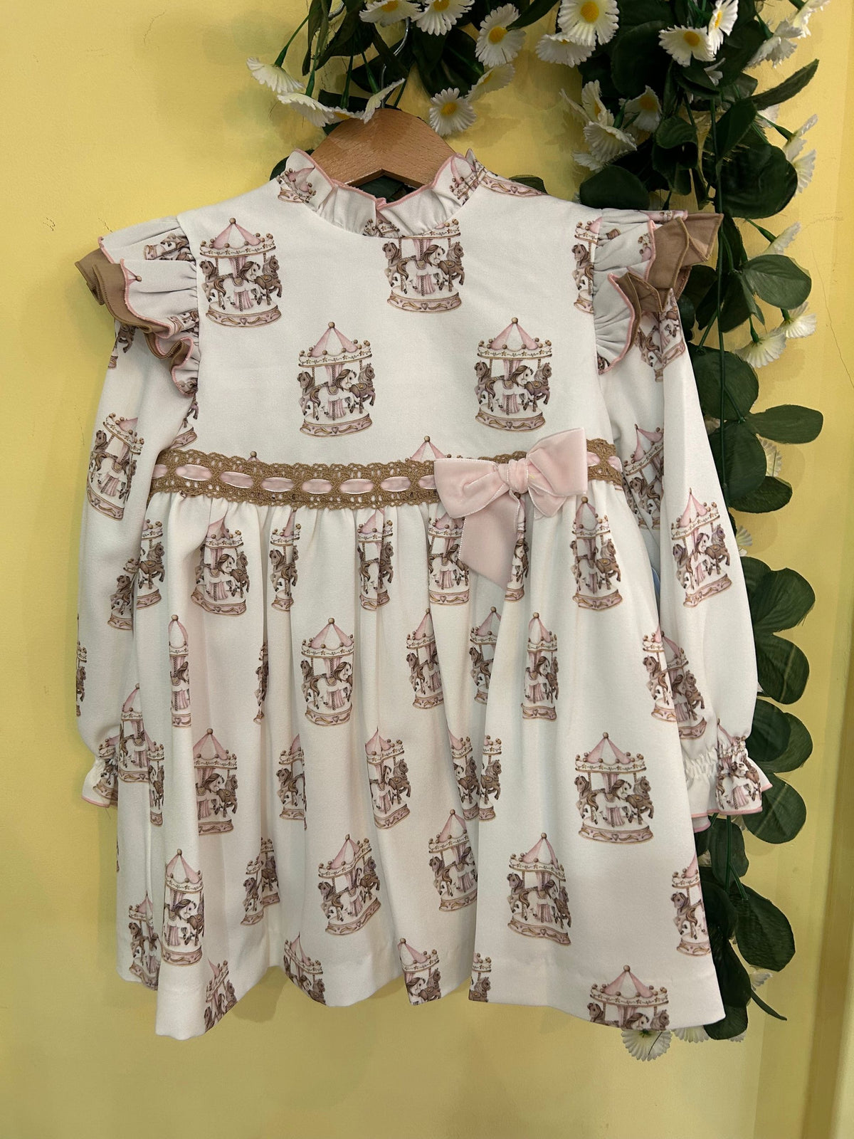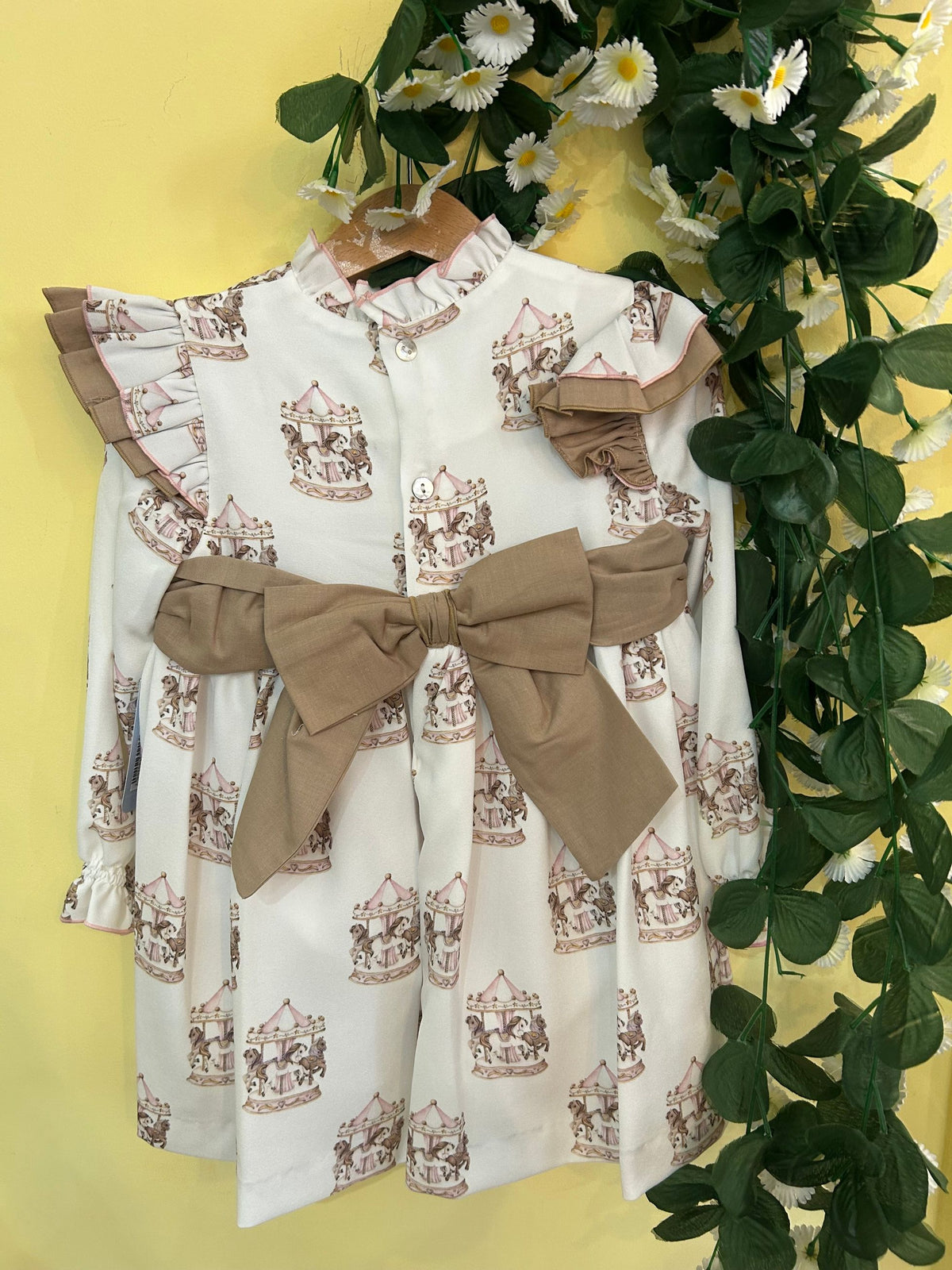 abito con colletto rouches e volant sulle spalle e nastrino in velluto in vita, sul retro un bellissimo fiocco rigido strutturato per regolare la larghezza dell'abito