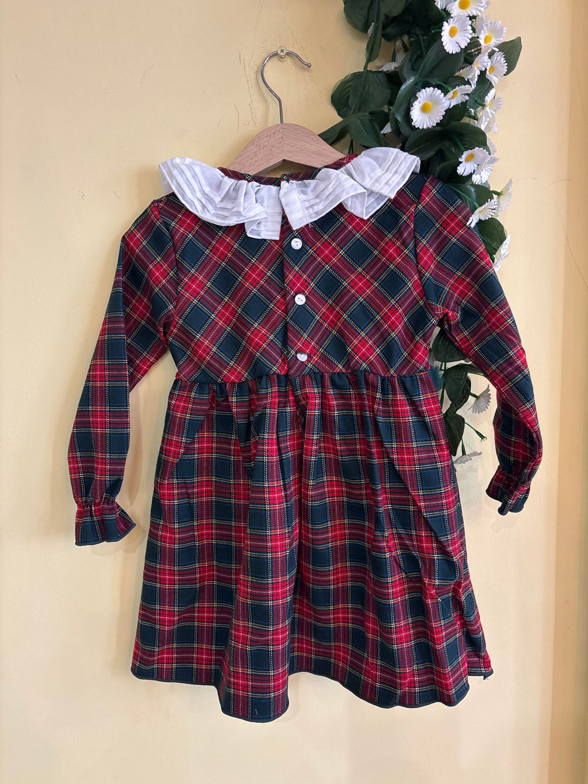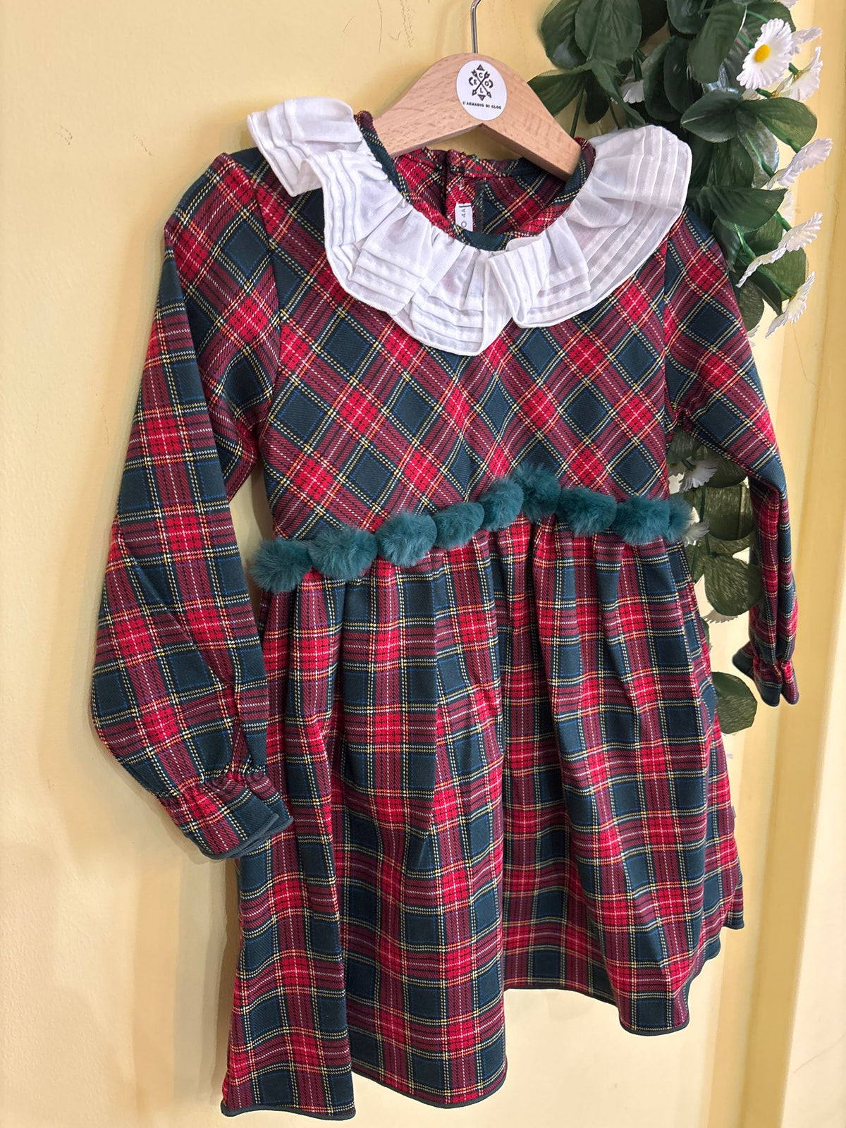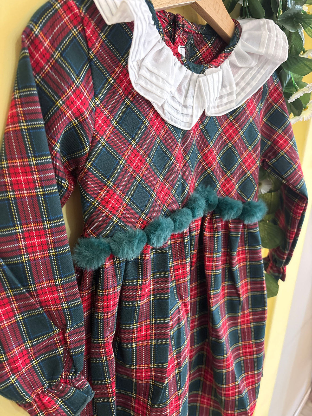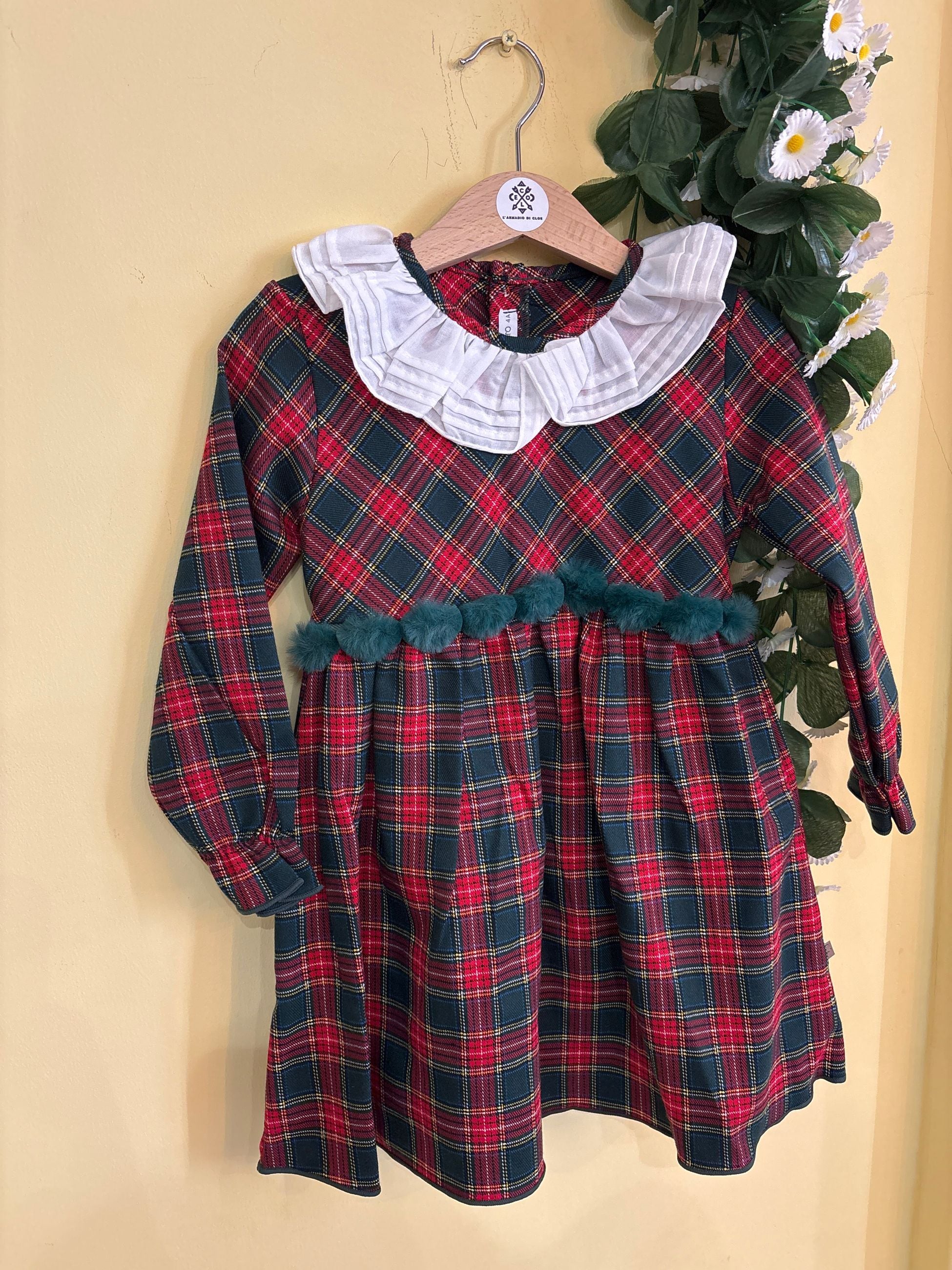 abito con fondo tartan e collo rouches bianco, sotto al corpetto porta una fila di pon pon in pelliccia, perfetto per il periodo natalizio per le più piccole e le più grandi