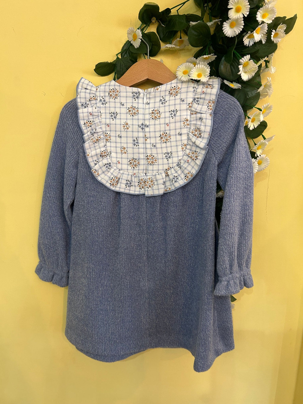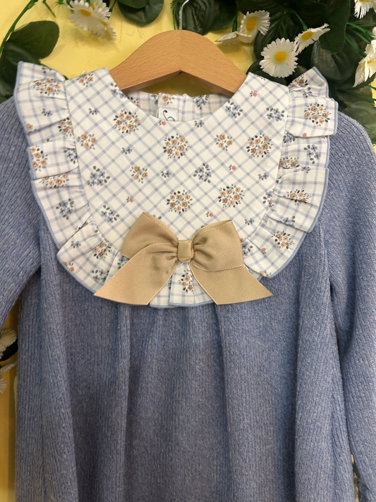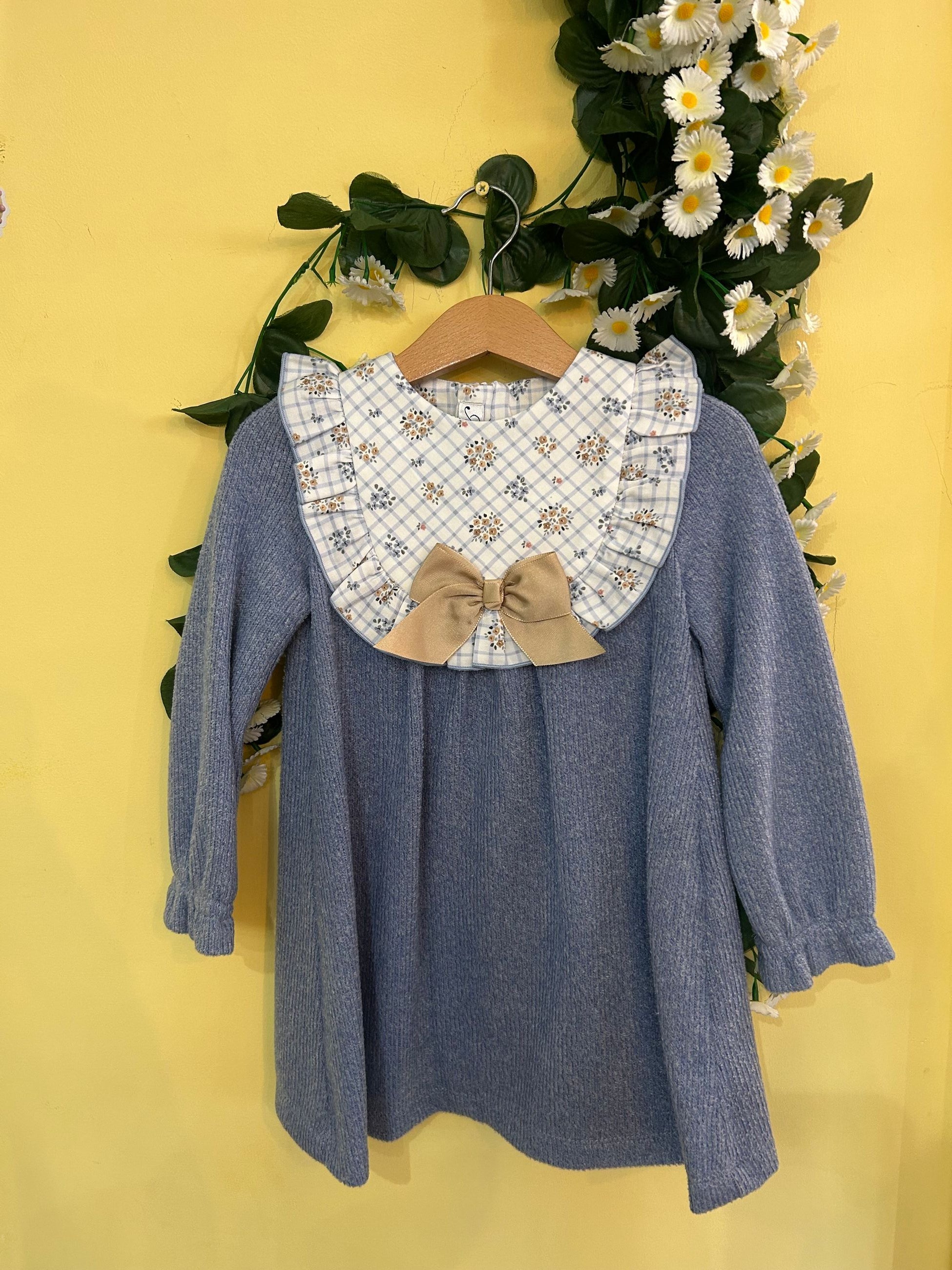 abito in morbida maglia. con collo fantasia in cotone e fiocco beige centrale