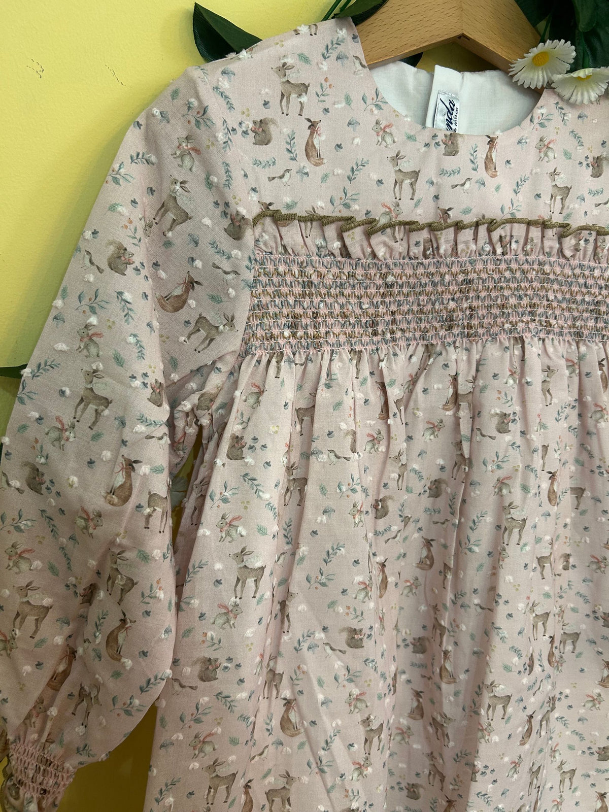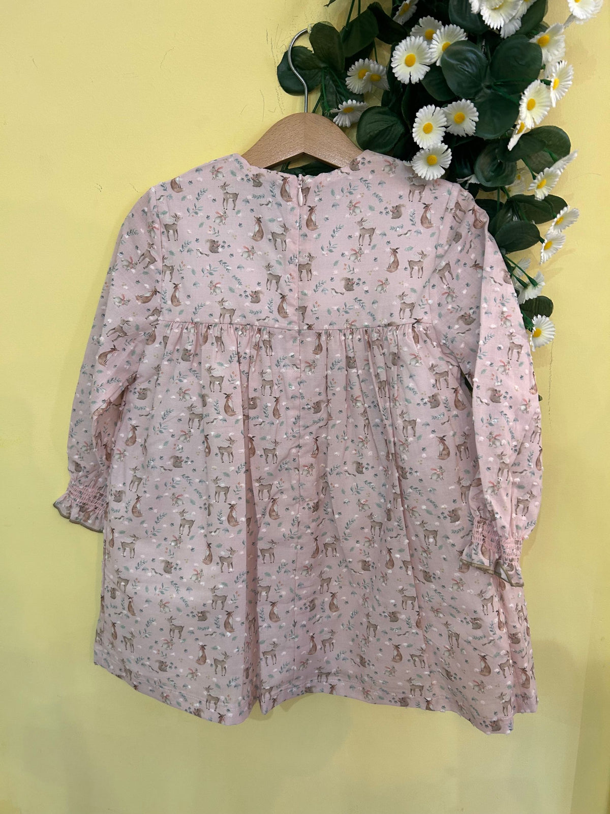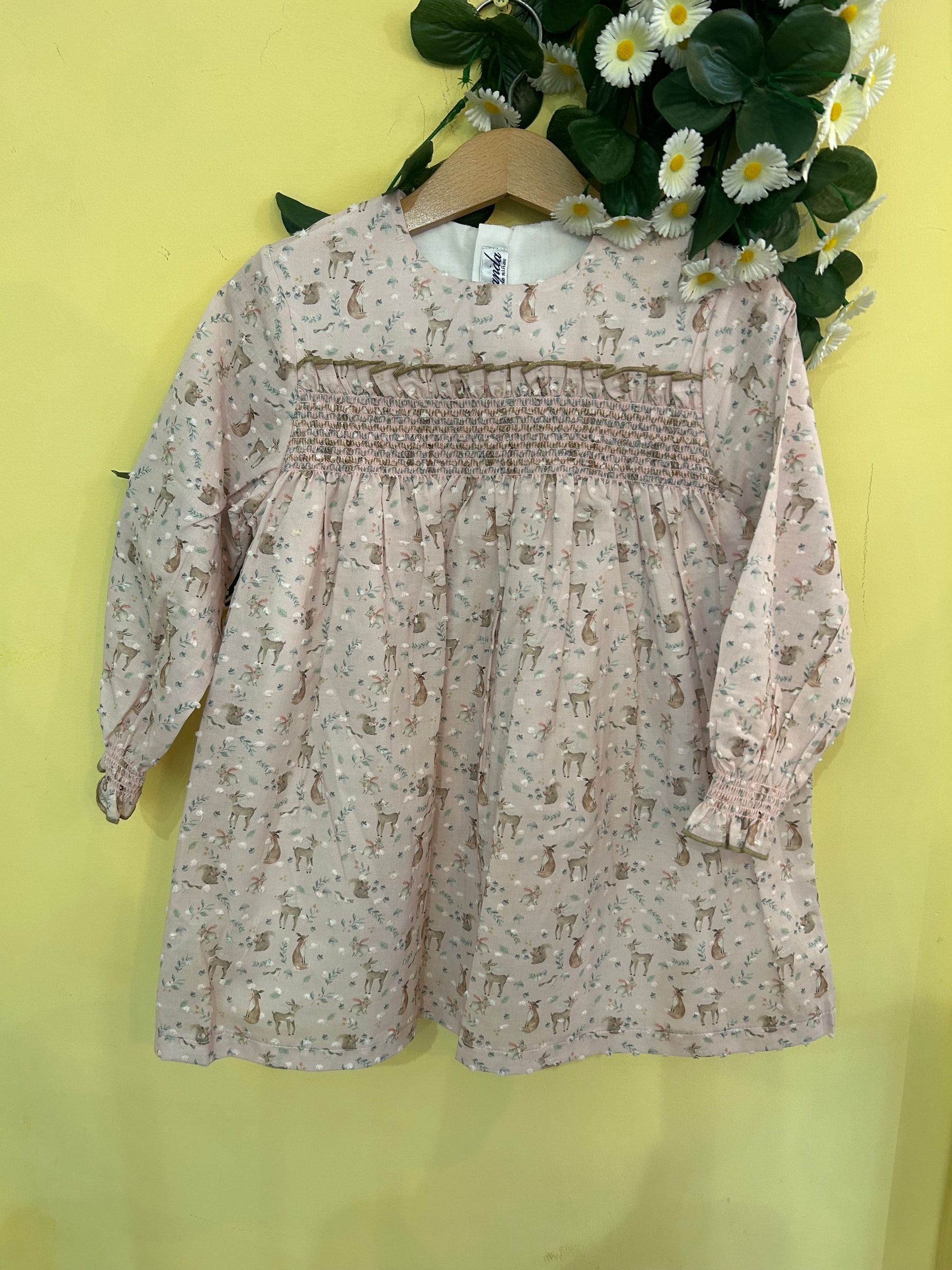 abitogirocollo con punto smock richiamato anche ai polsini e fantasia con animaletti