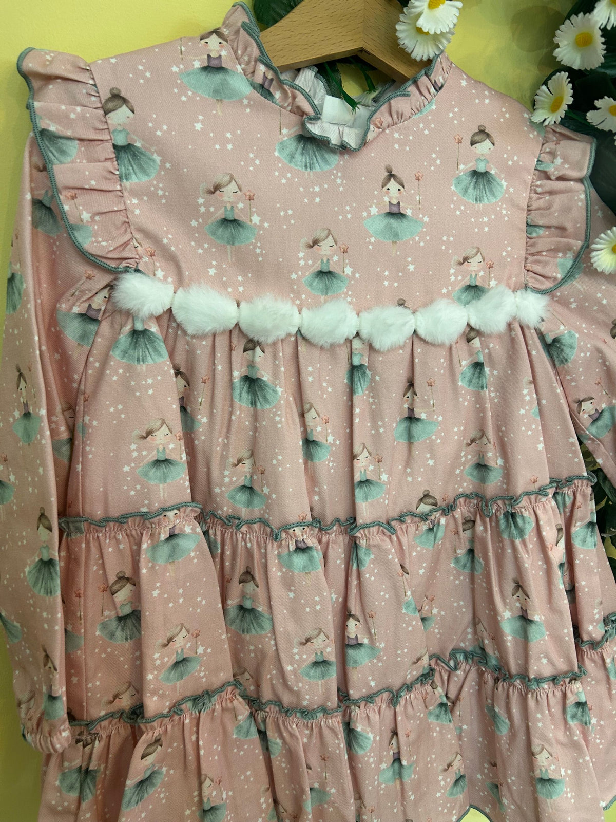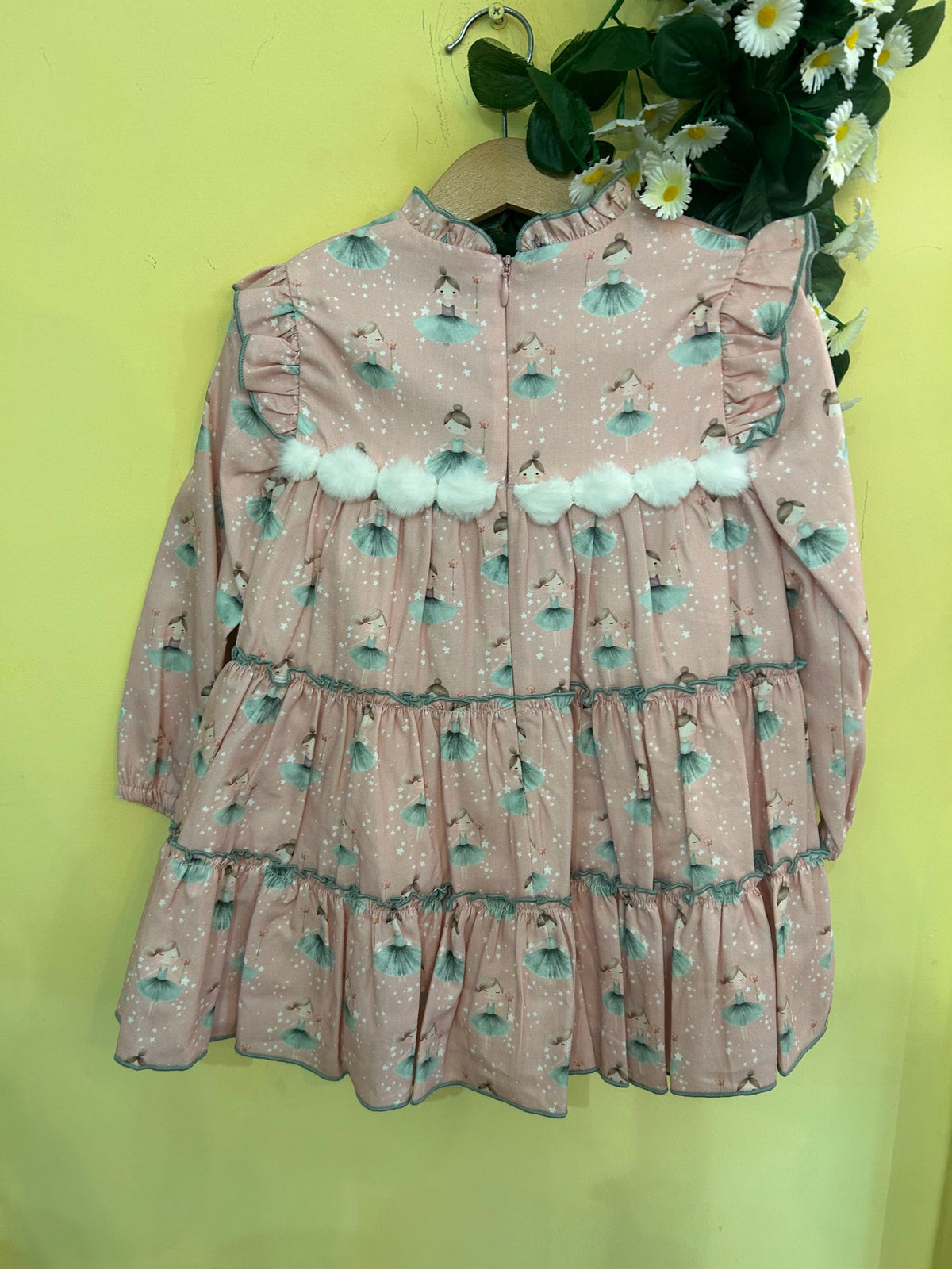 abito fantasia ballerine con collo con rouches balze, l'abito porta in vita un fila di pon pon in pelliccia bianchi a contrasto con la tinta dell'abito