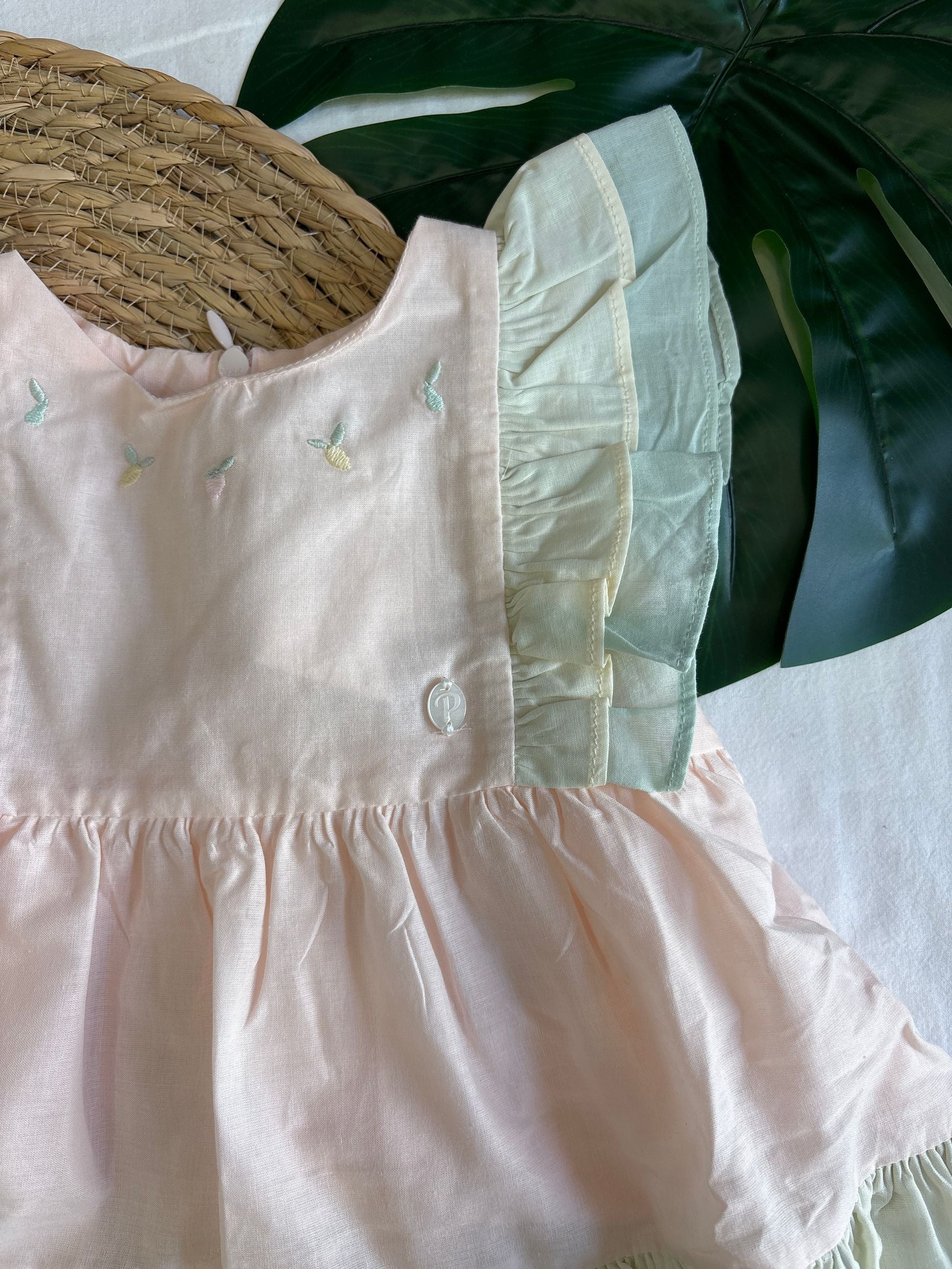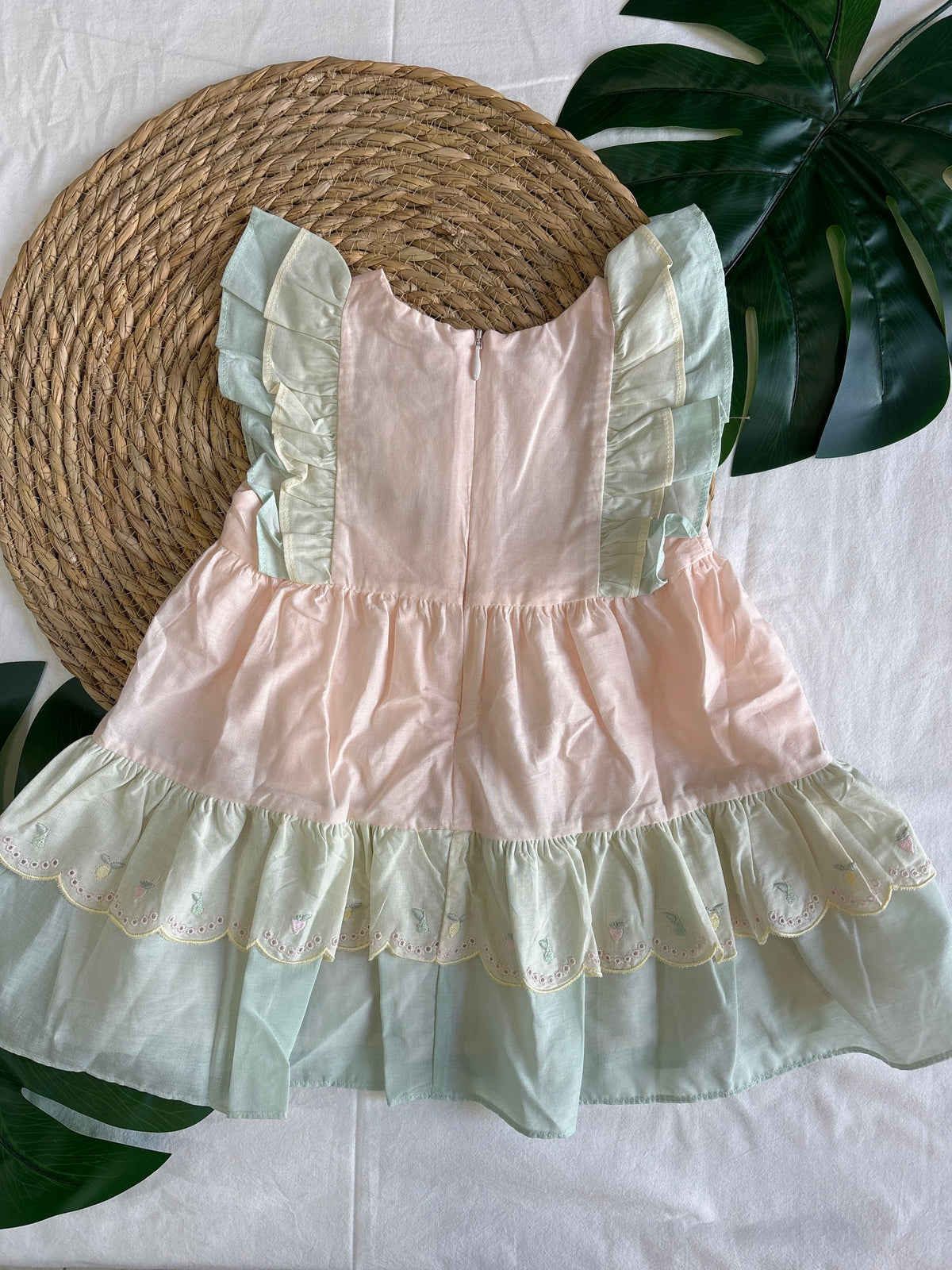 abito giromanica e girocollo, con rouches sulle spalle e ricami al collo e sulla prima balza della gonna, in tonalità pastello perfetto per eventi e compleanni, un abito in cotone fresco ed elegante