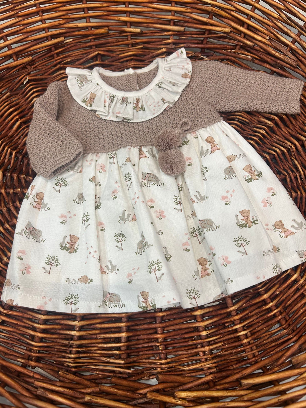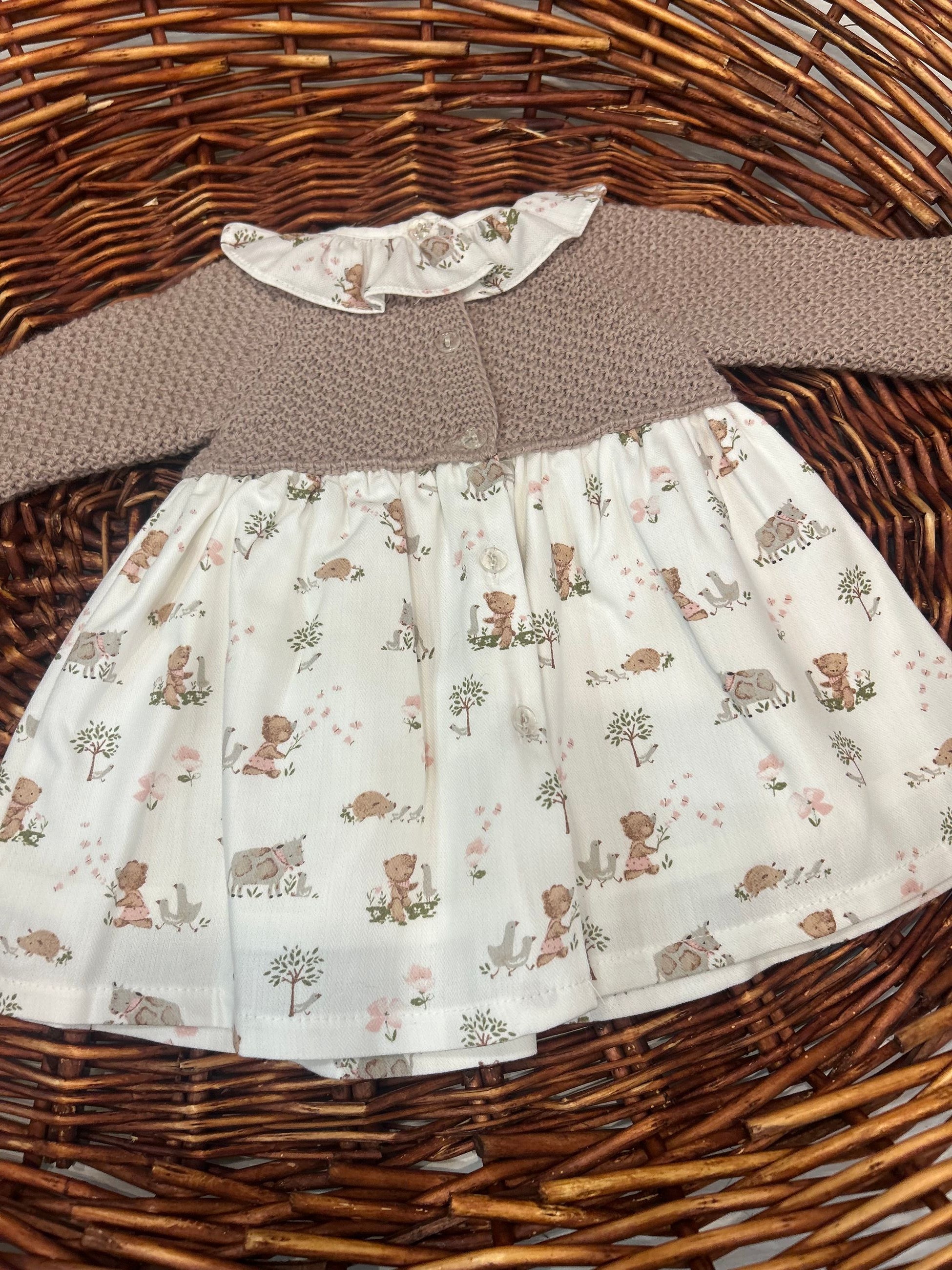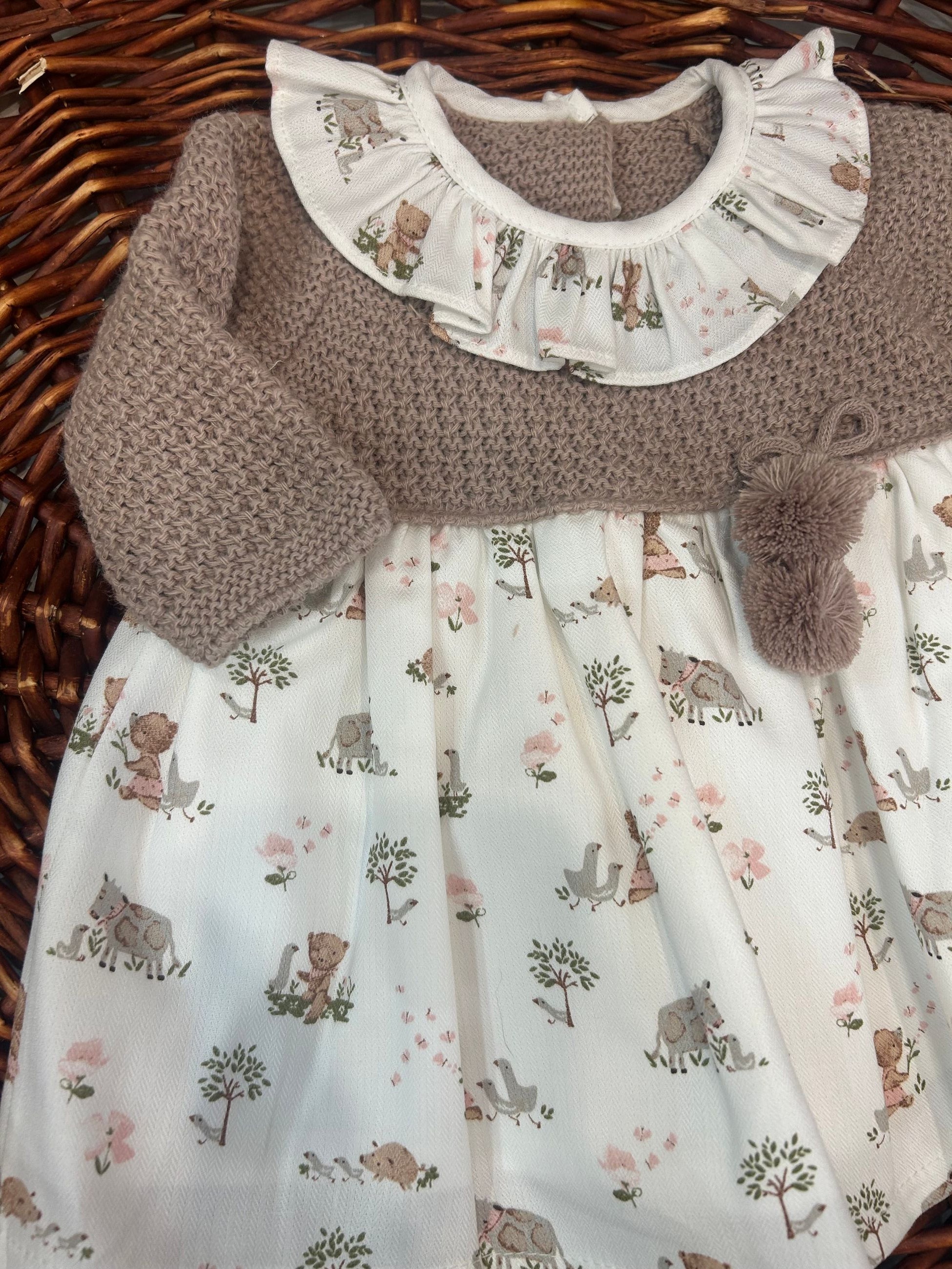 abito con corpetto in maglia e gonna in tessuto fantasia bosco,l'abbottonatura sul retro lo rende comodo e versatile e il collo rouches a contrasto gli da un tono bonton,i pon pon sono puramente decorativi