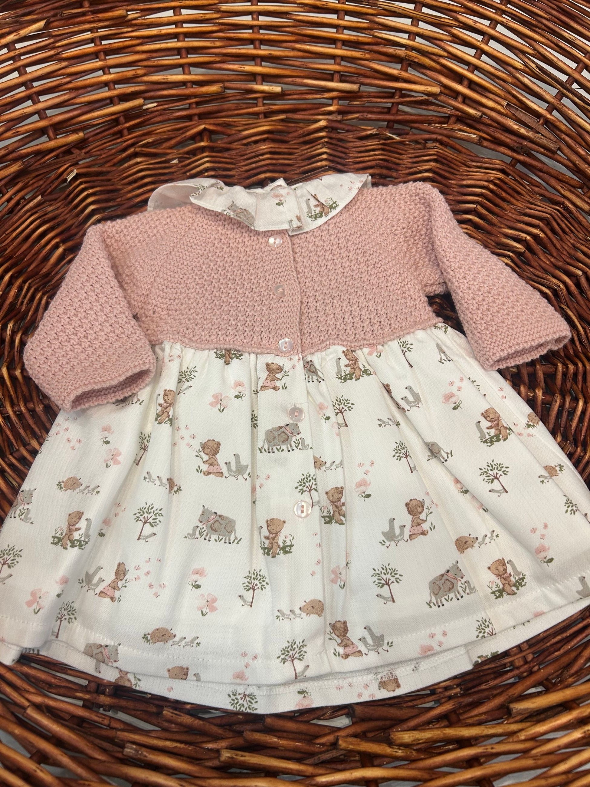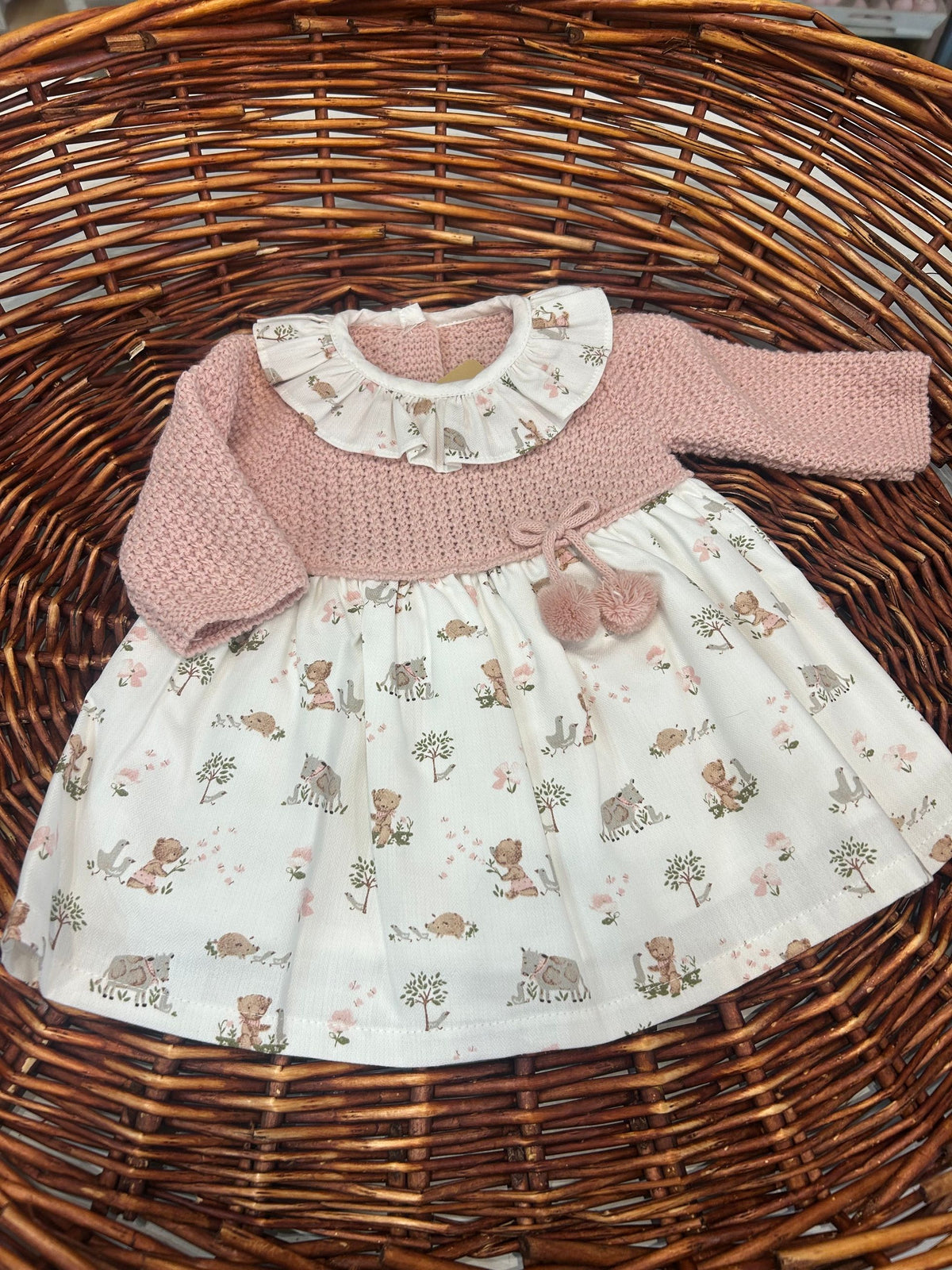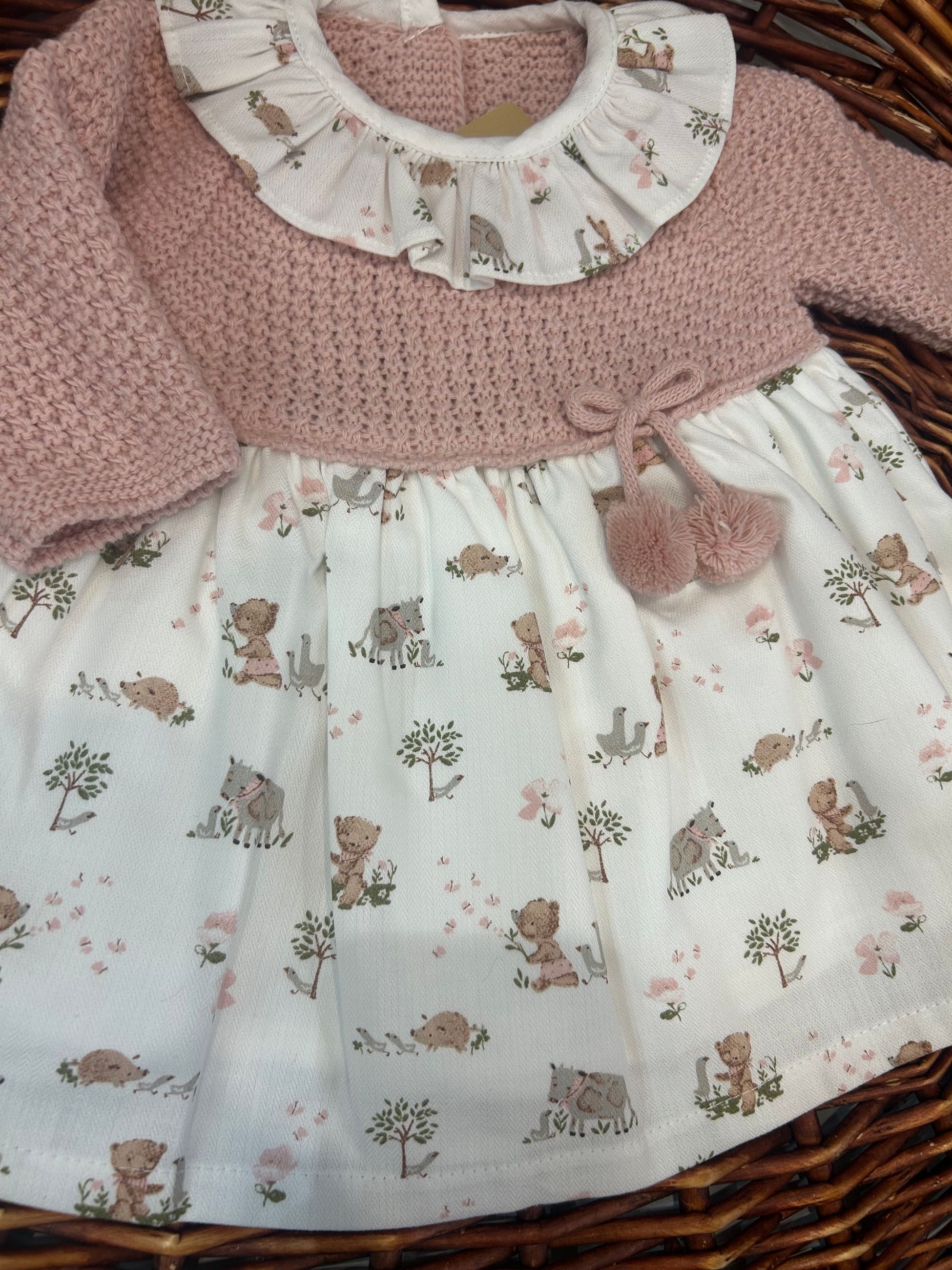 abito con corpetto in maglia e gonna in tessuto fantasia bosco,l'abbottonatura sul retro lo rende comodo e versatile e il collo rouches a contrasto gli da un tono bonton,i pon pon sono puramente decorativi