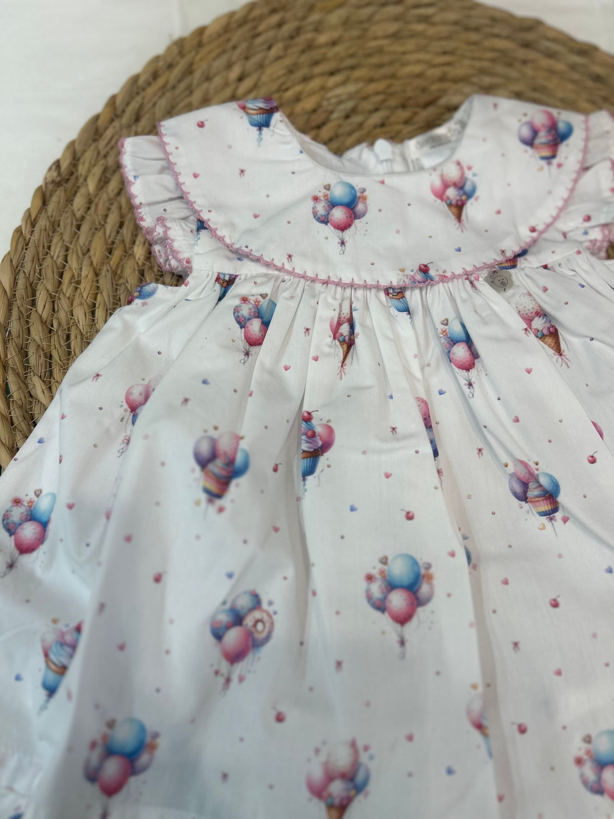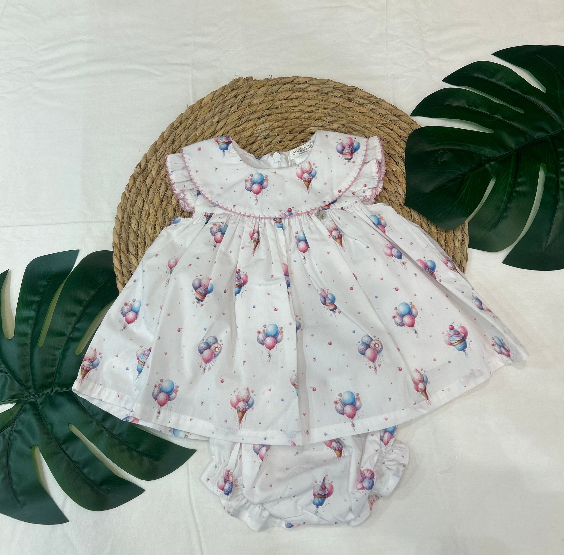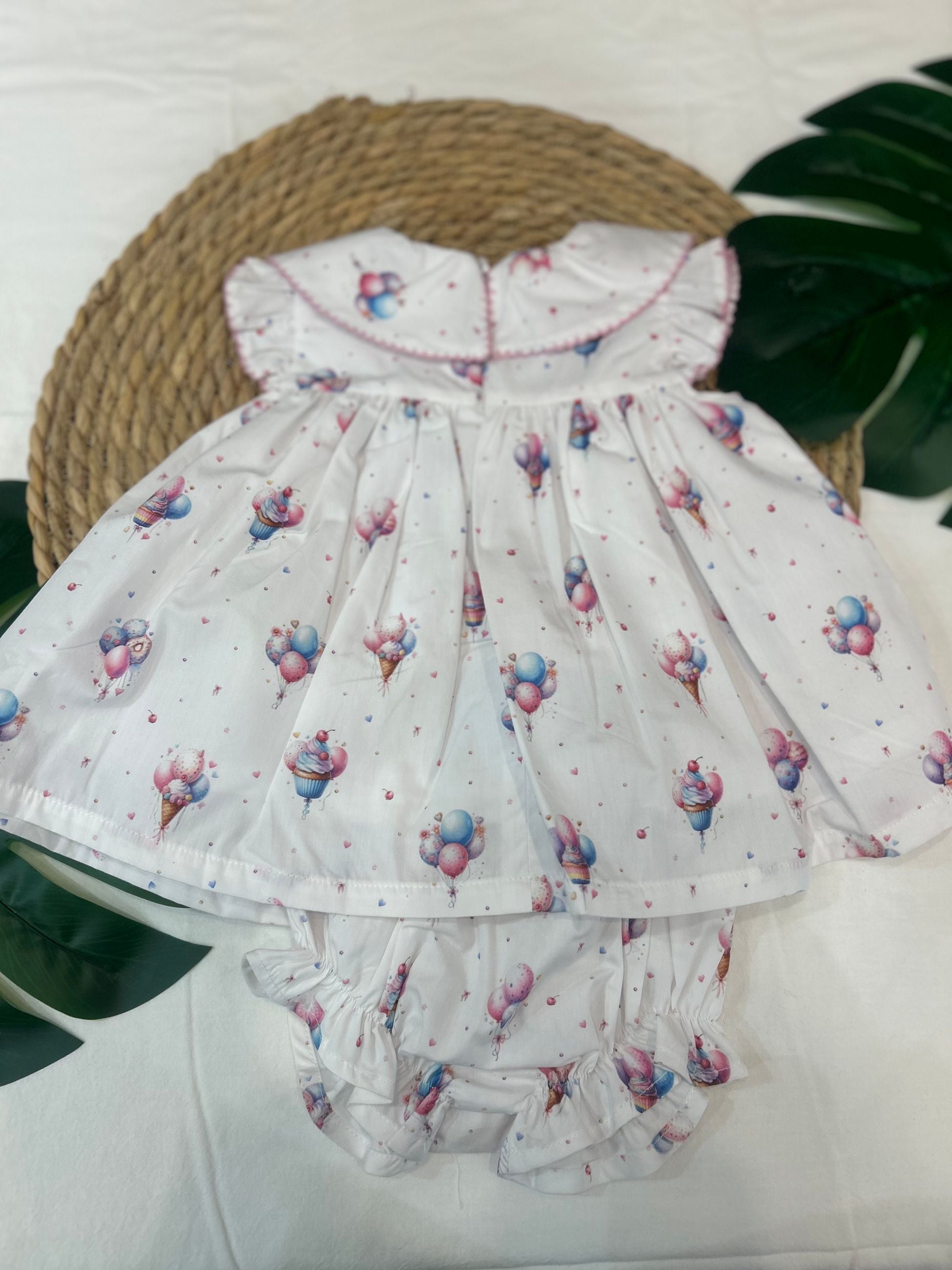 abito giromanica con collo tondo, la particolare fantasia con palloncini, gelatini e dolcini lo rende unico per compleanni e feste, la manichetta rouches crea una simpatica spallina il tutto completato dalla coulotte