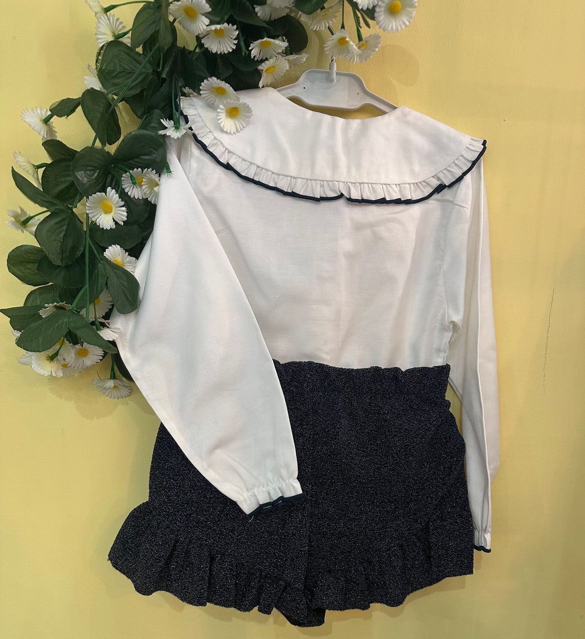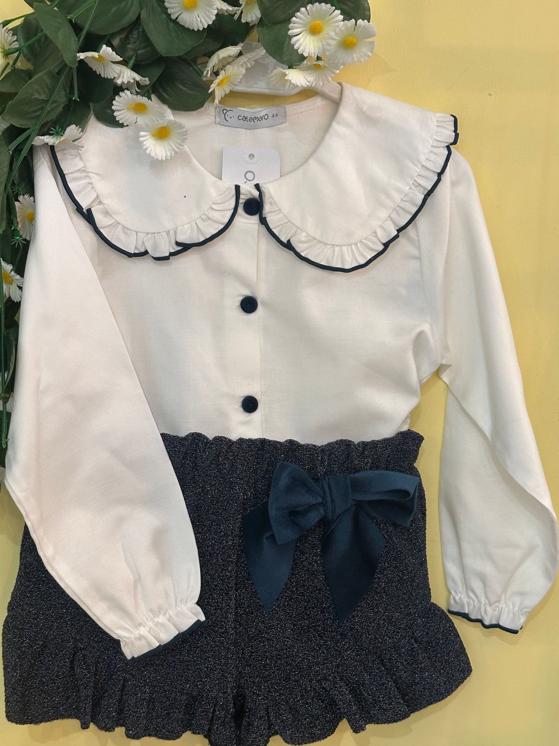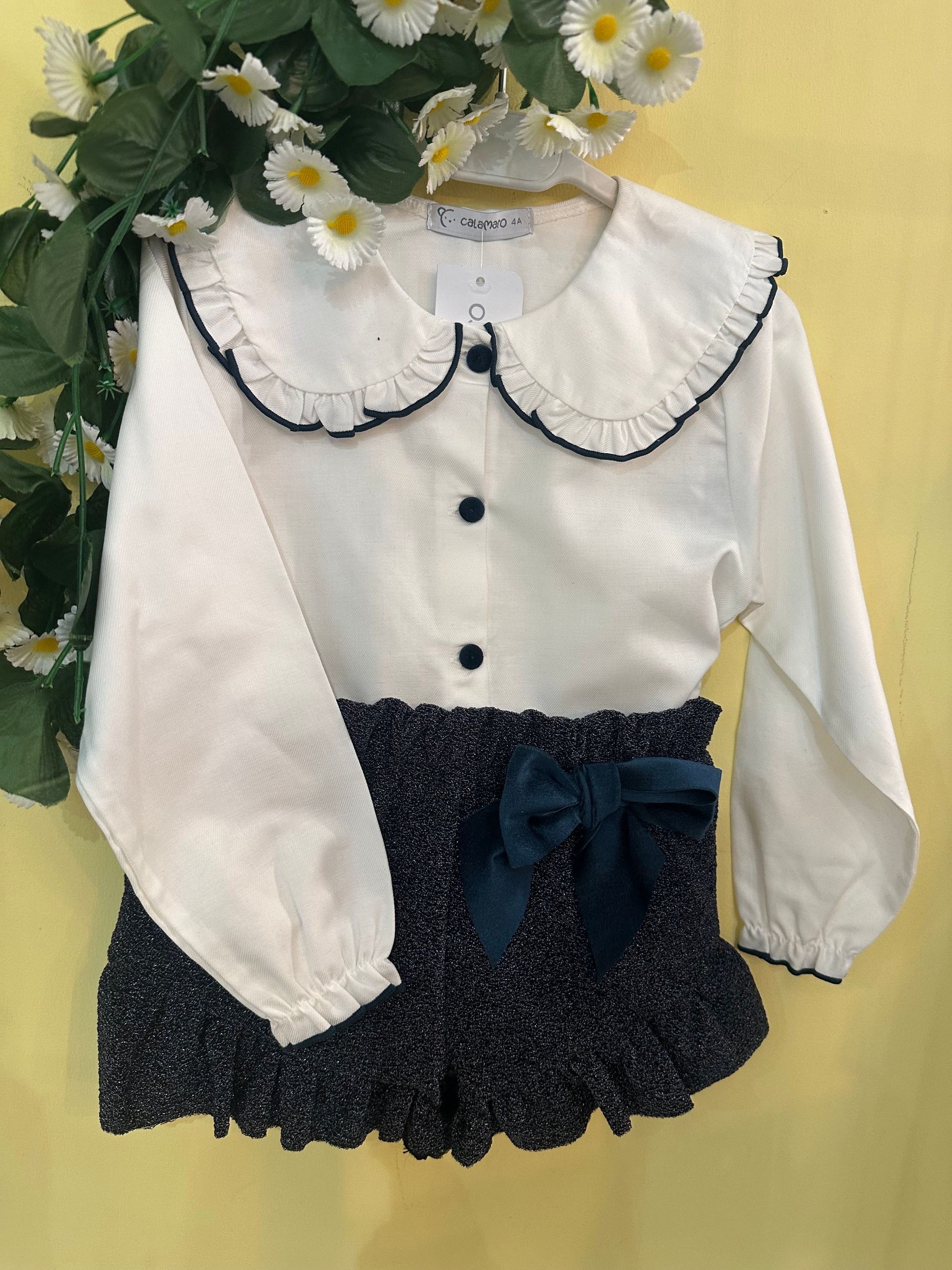 completo con camicia con collo tondo con profilo in velluto che richiama i bottoncini rivestiti e il profilo dei polsini, abbinata ad uno short laminato con rouches sulla gamba e un fiocco in velluto laterale