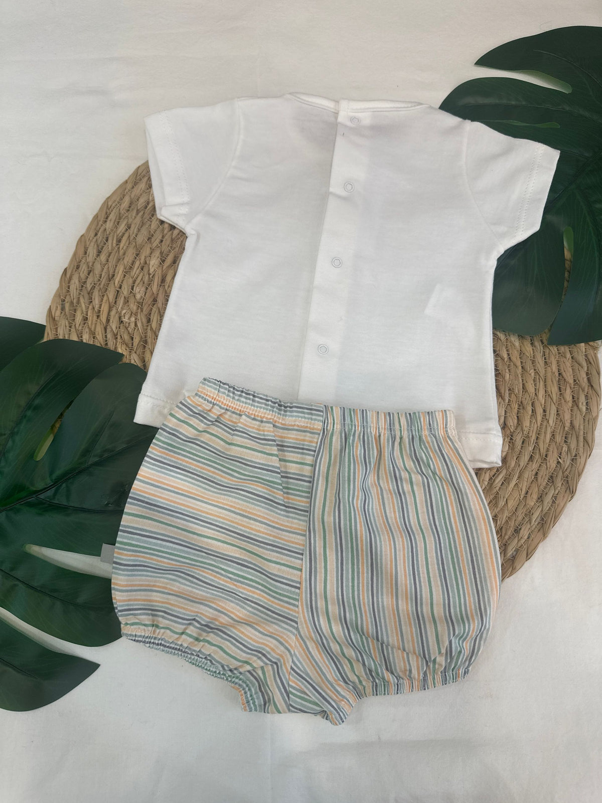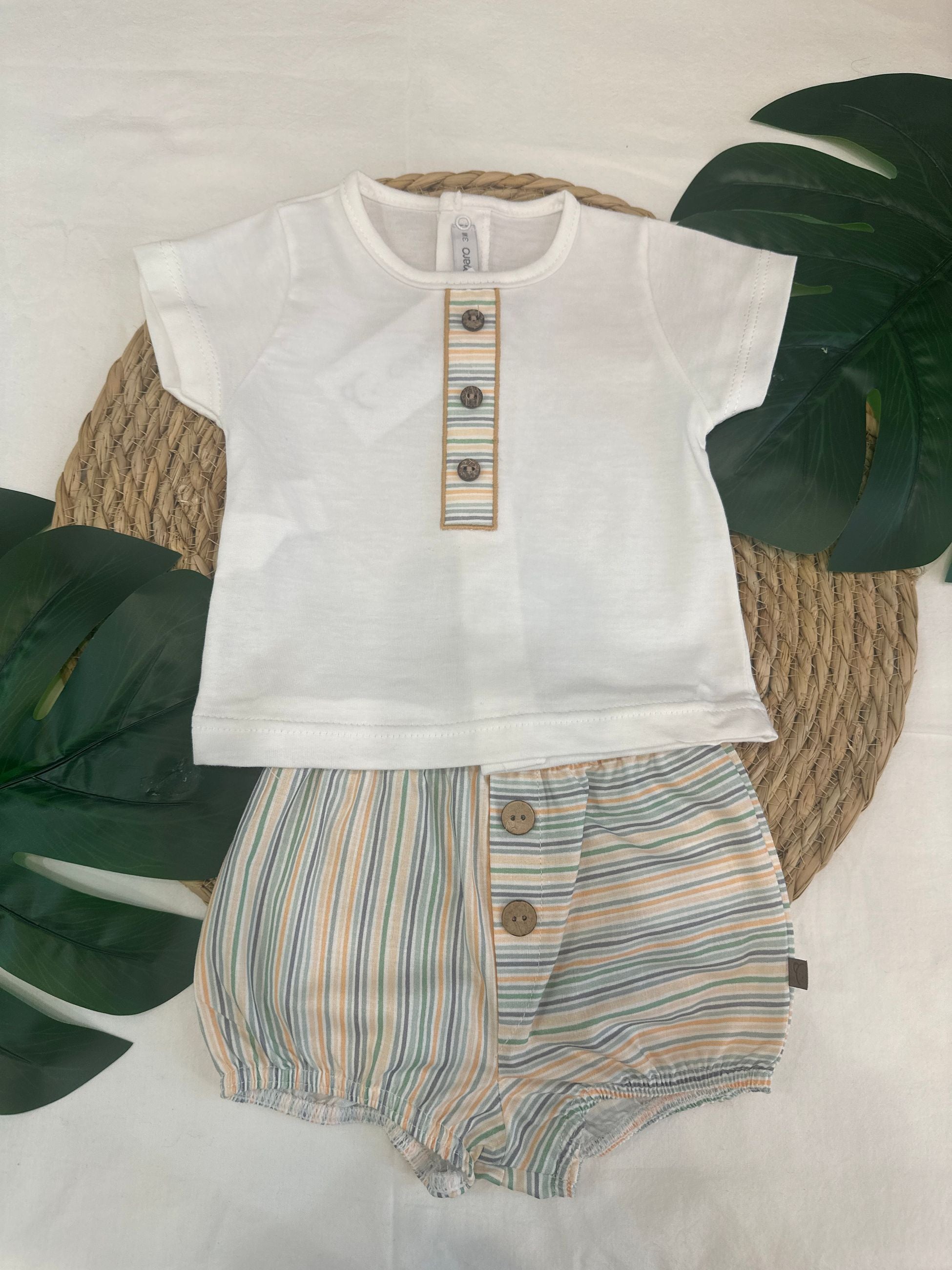 completo maglia e coulotte, la shirt ha tre bottoni in legno avanti ed è abbinata ad una coulotte con fantasia righe come gli inserti sulla maglia. un look in cotone, versatile e pratico per i più piccoli anche situazioni in cui è richiesta comodità