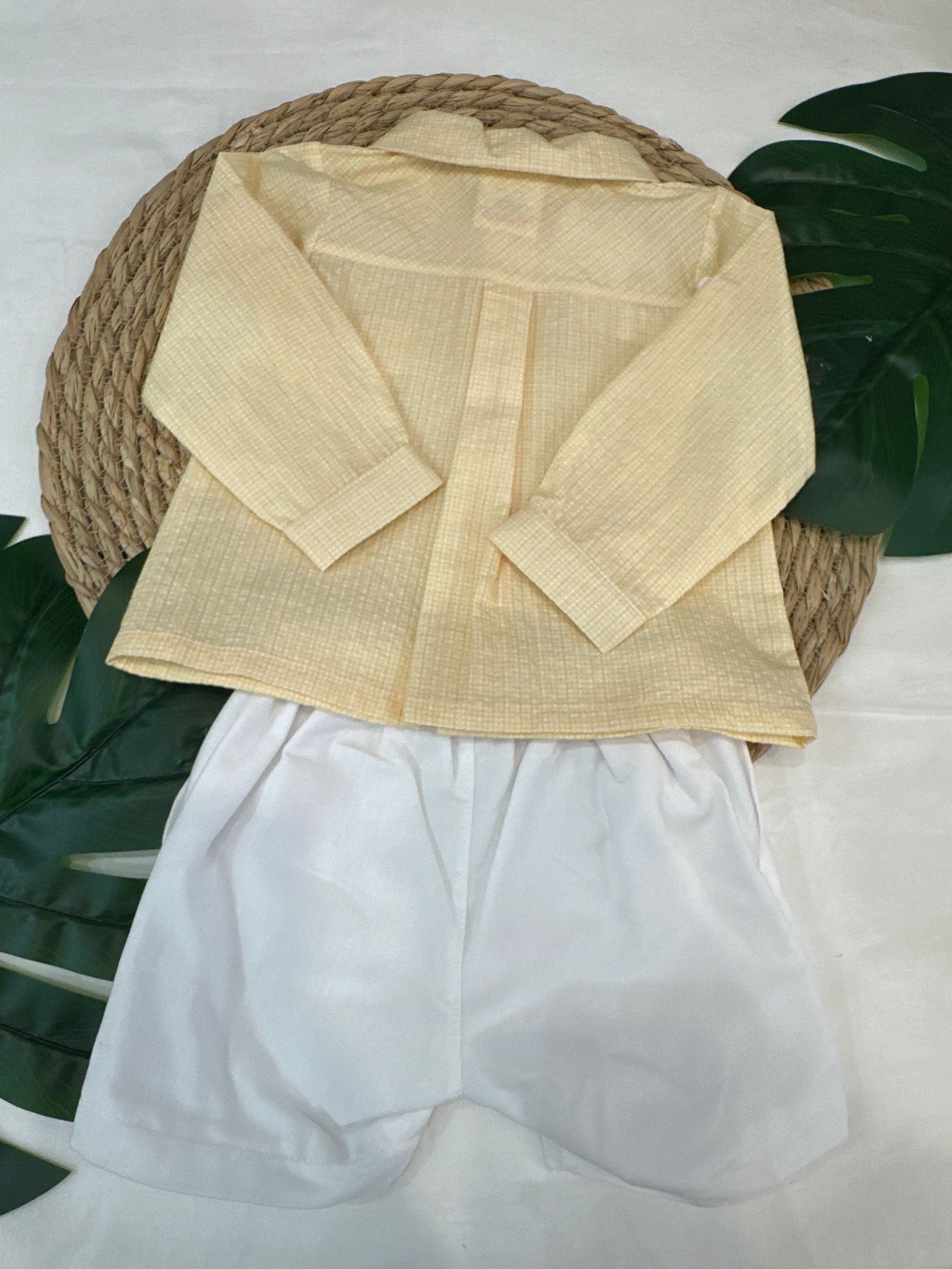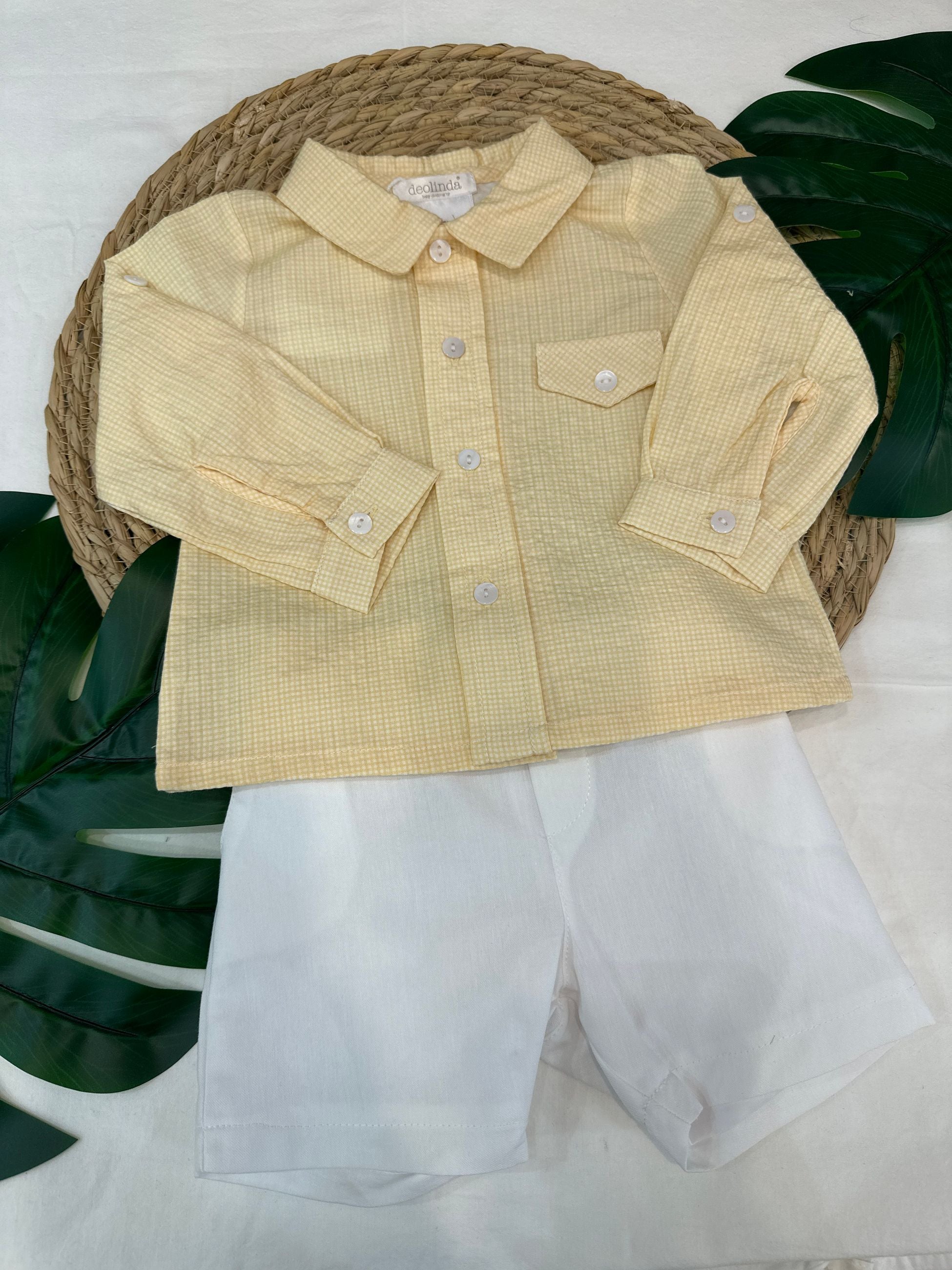 completo in cotone con camicia fantasia quadratini e taschino, abbinata ad un bermuda in cotone bianco, semplice ed elegante