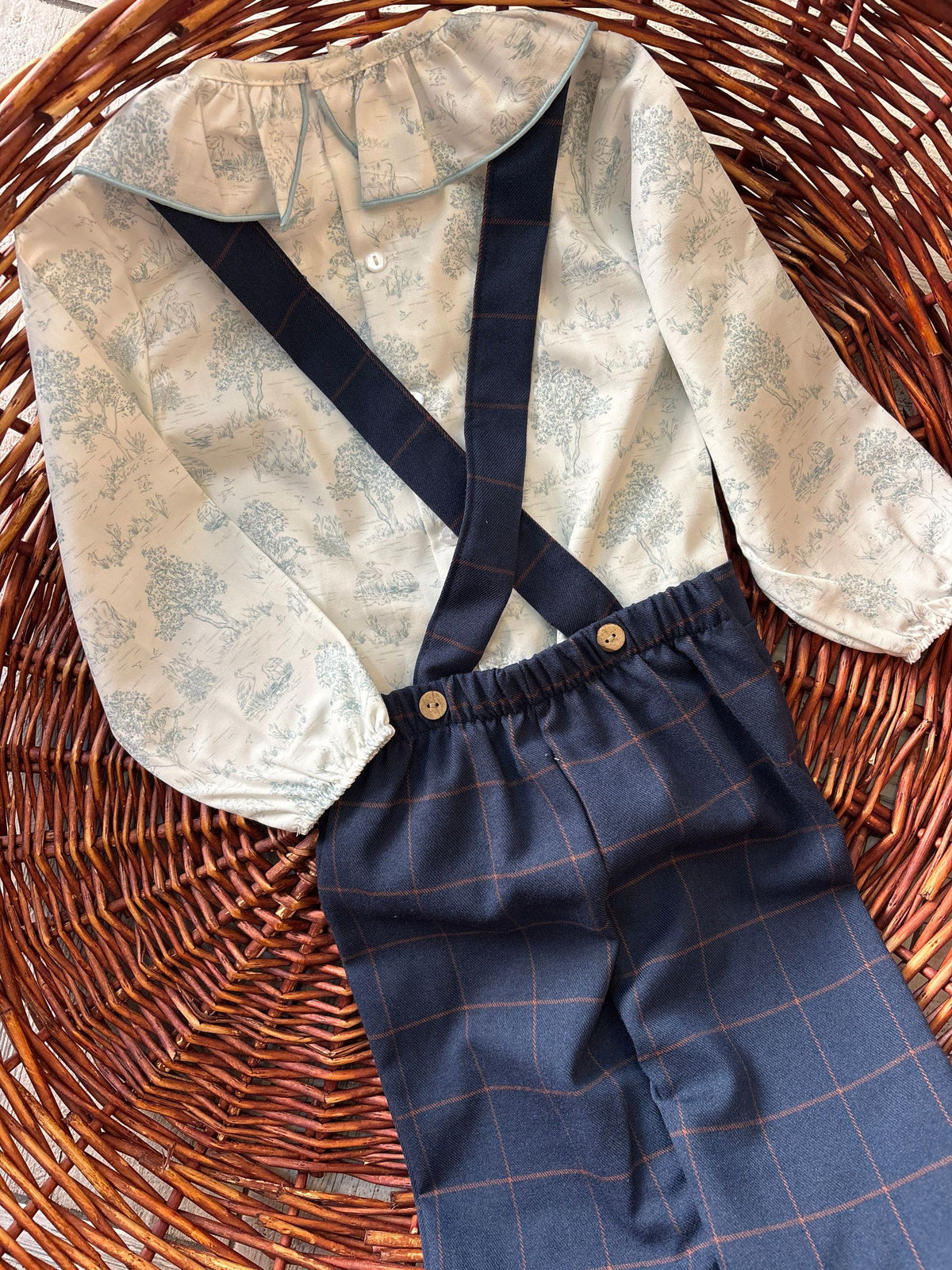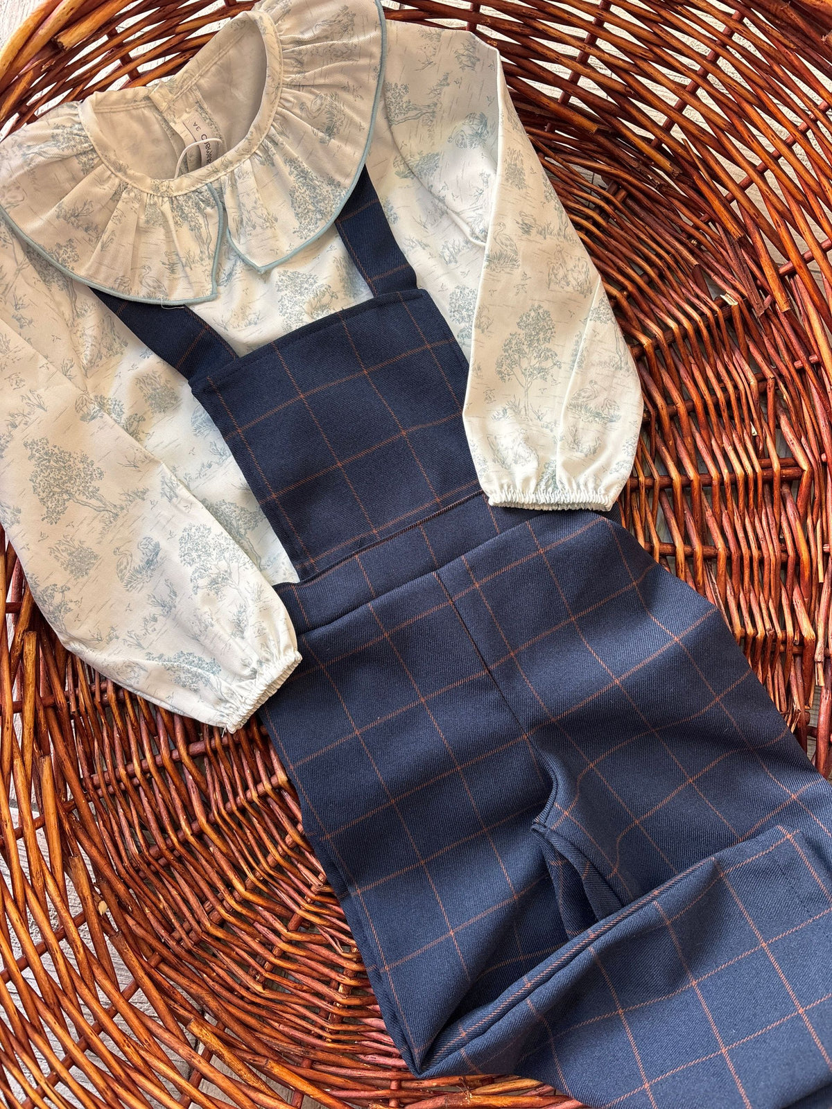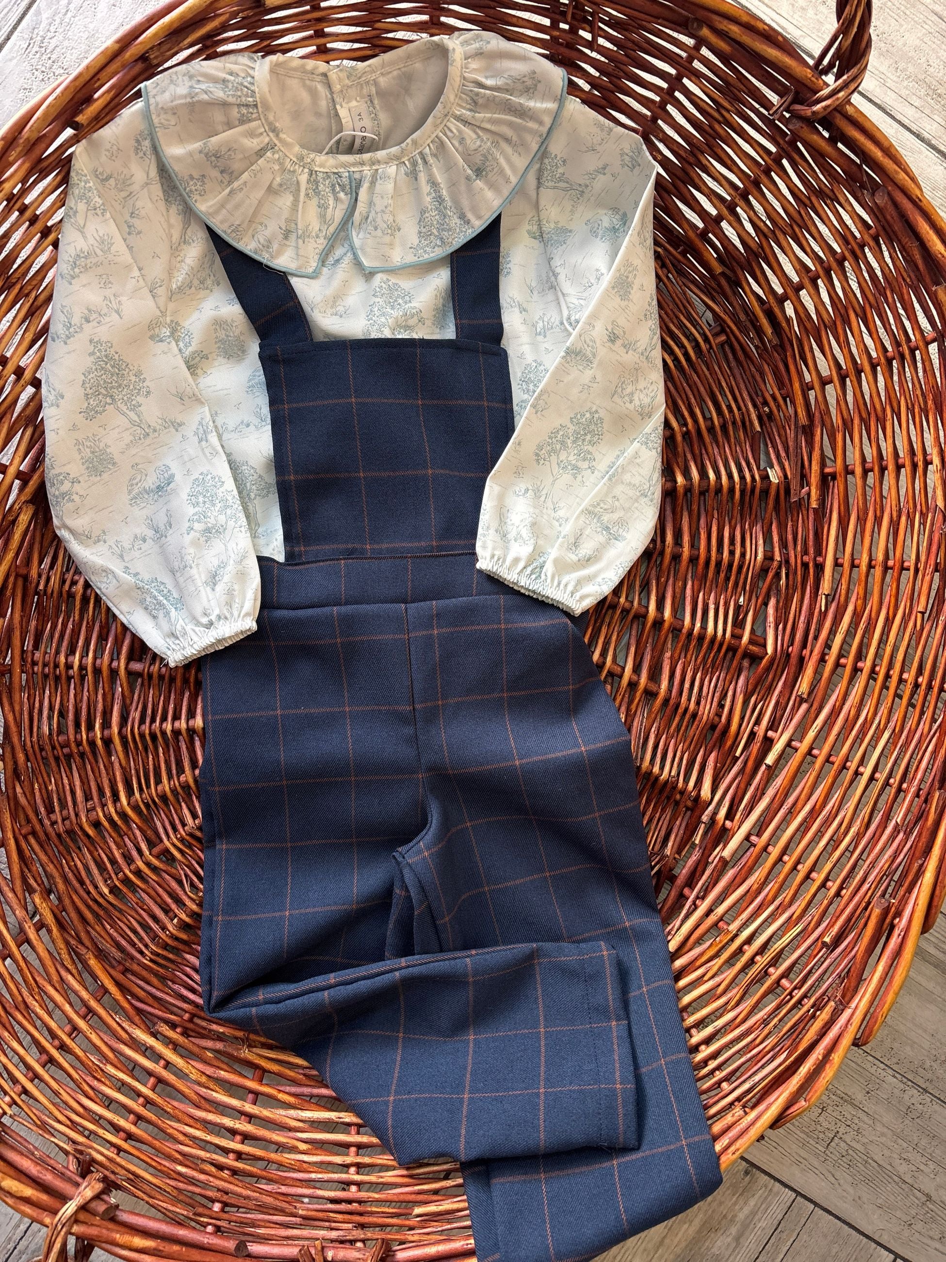 completo con camicia con collo rouches con fantasia provenzale e salopette su fondo blu con quadri di colore a contrasto