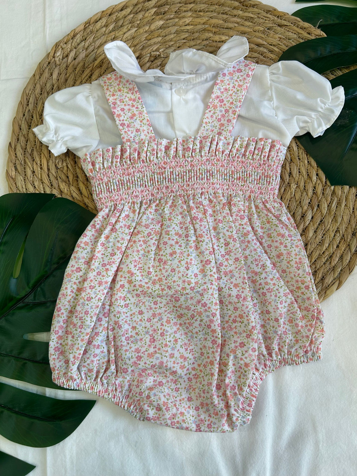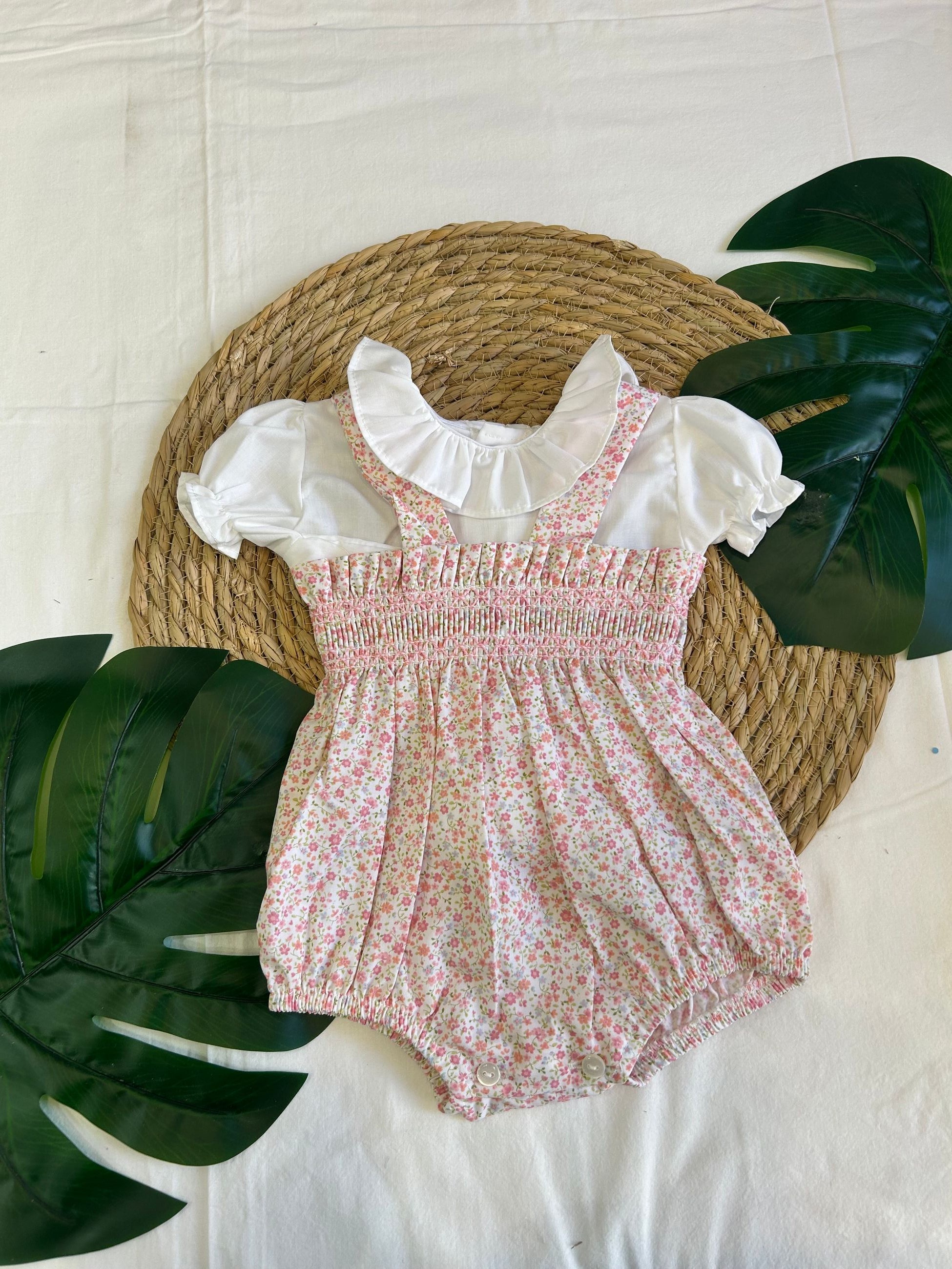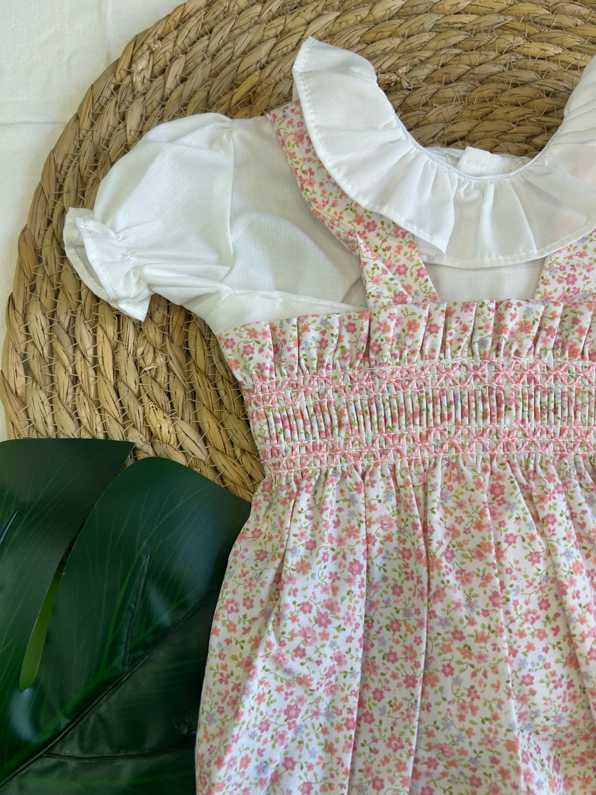 completo con camicia collo rouches mezza manica tinta unita abbinata a pagliaccetto con bretelle, fantasia liberty e punto smock