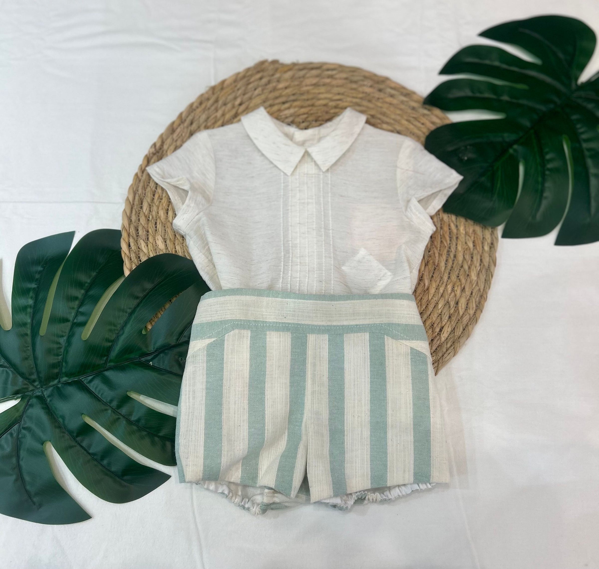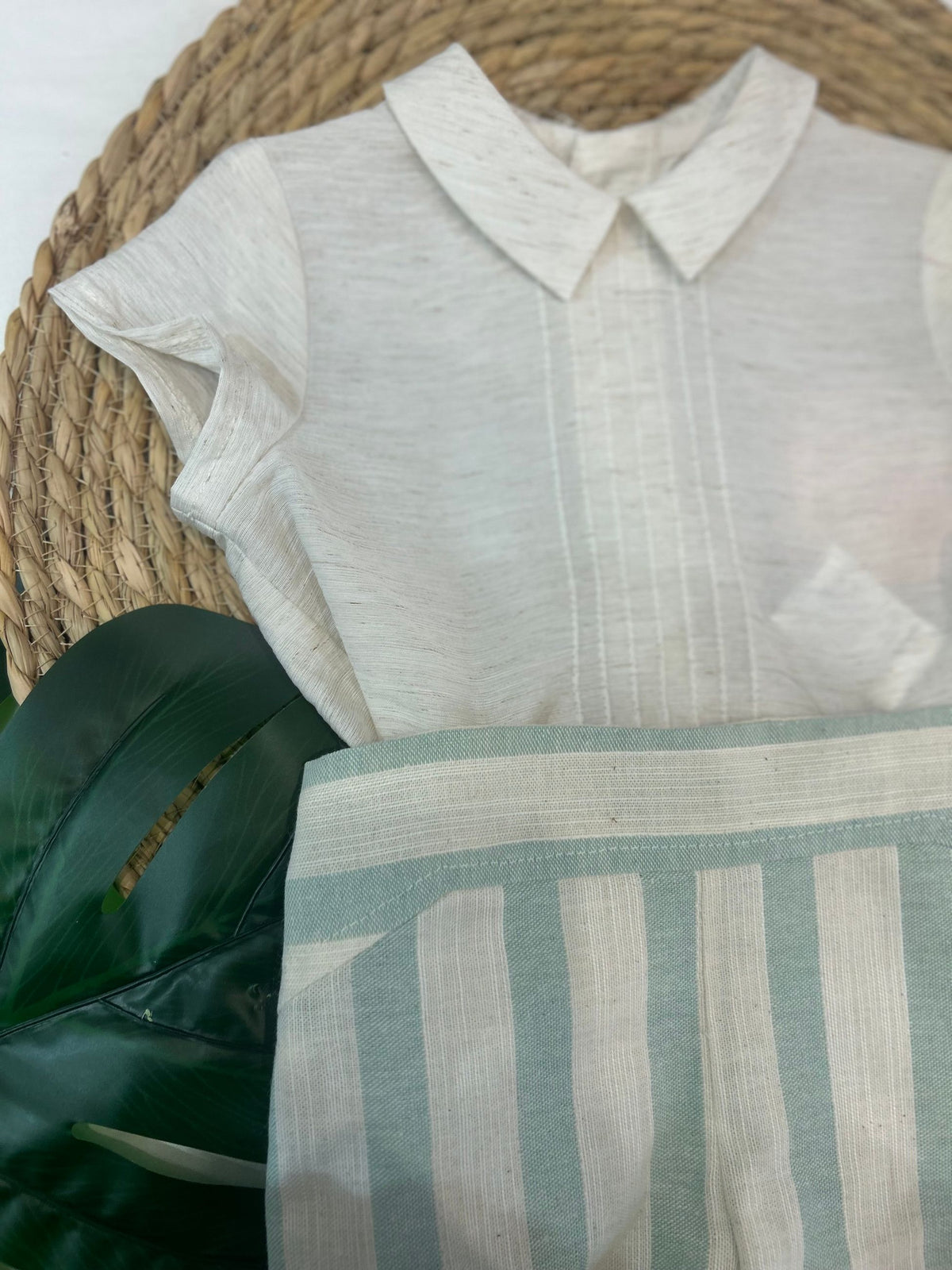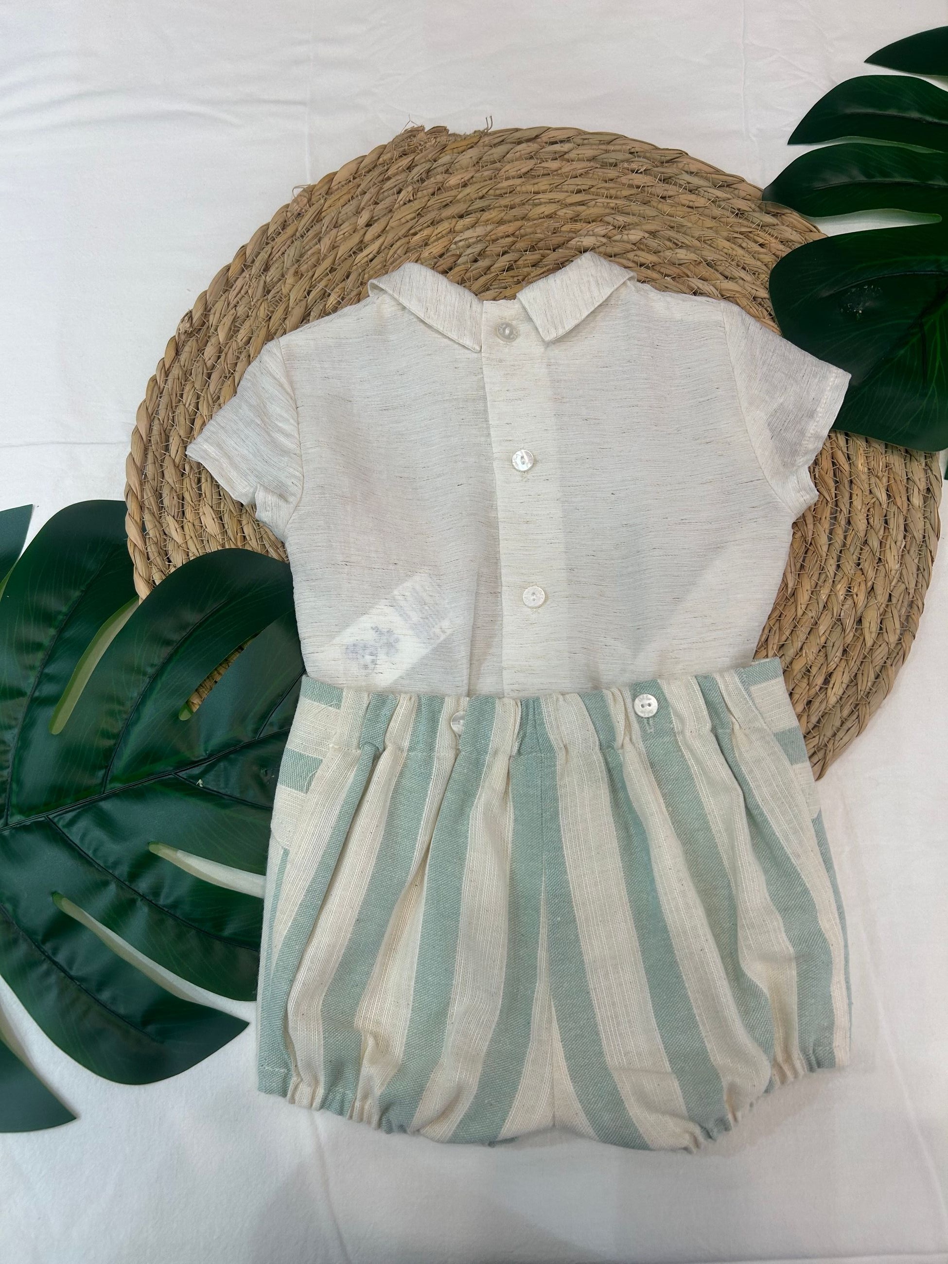 completo camicia mezzamanica con collo a punta, abbinato a bermuda legato con bottoncini a righe, un look elegante e fine per tutti gli eventi