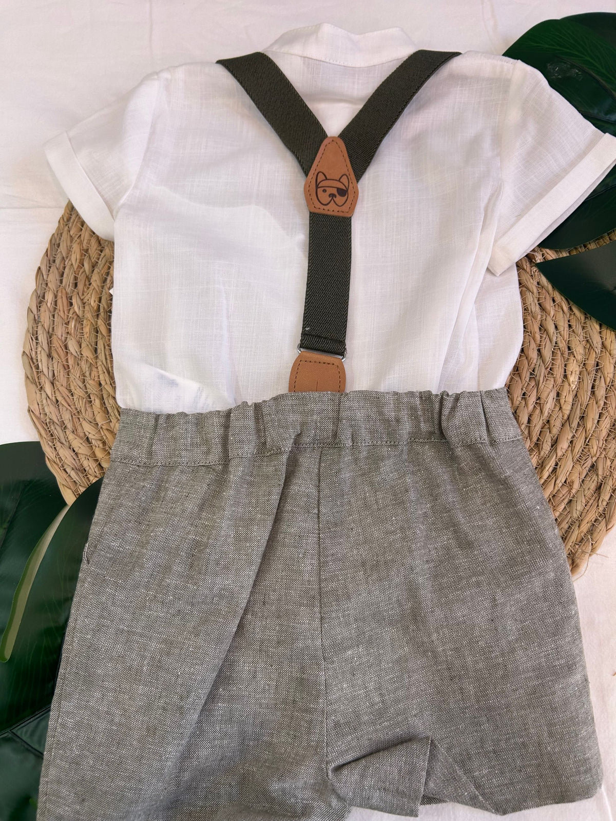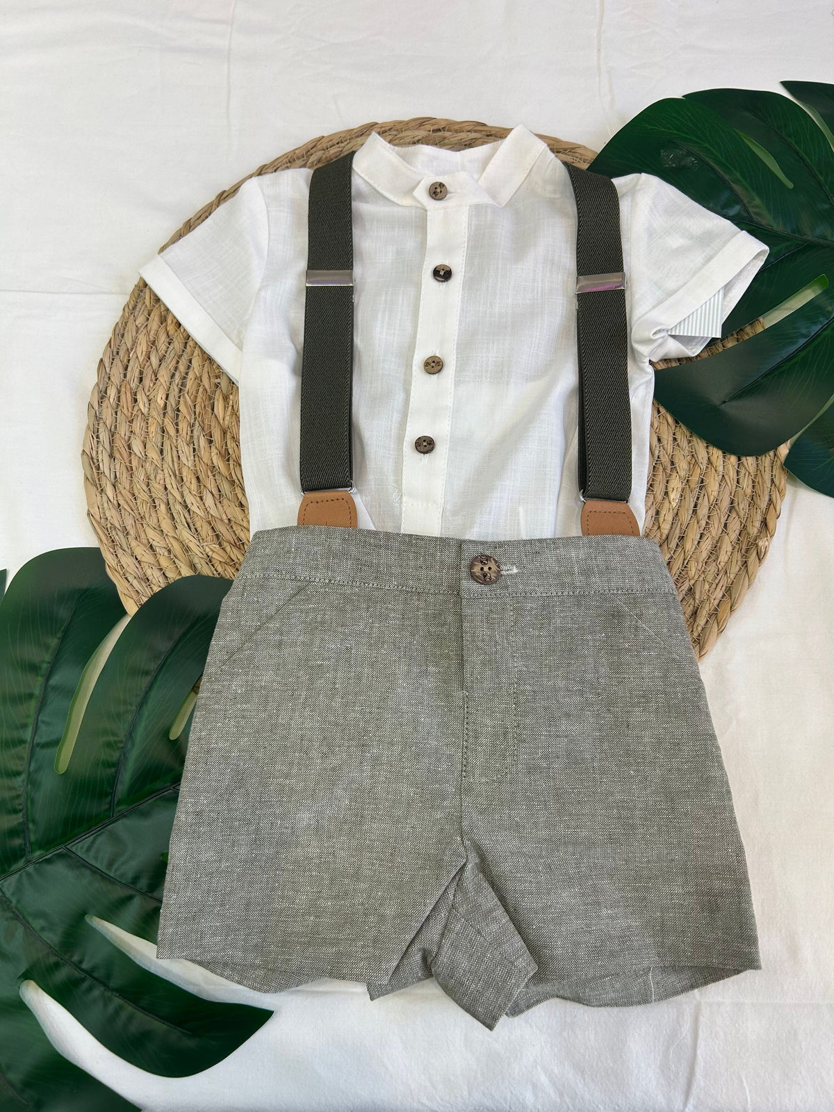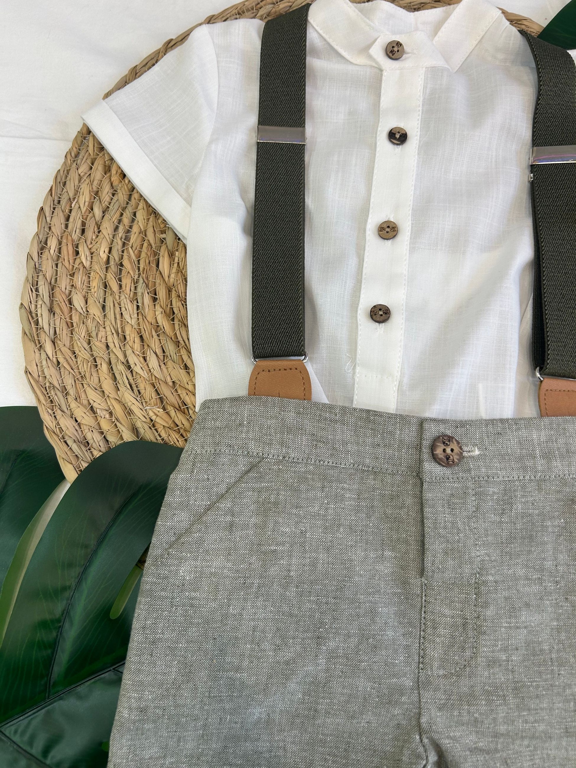 completo camicia e bermuda con bretelle e bottoncini in legno. un look alla moda per i maschietti per tutte le occasioni