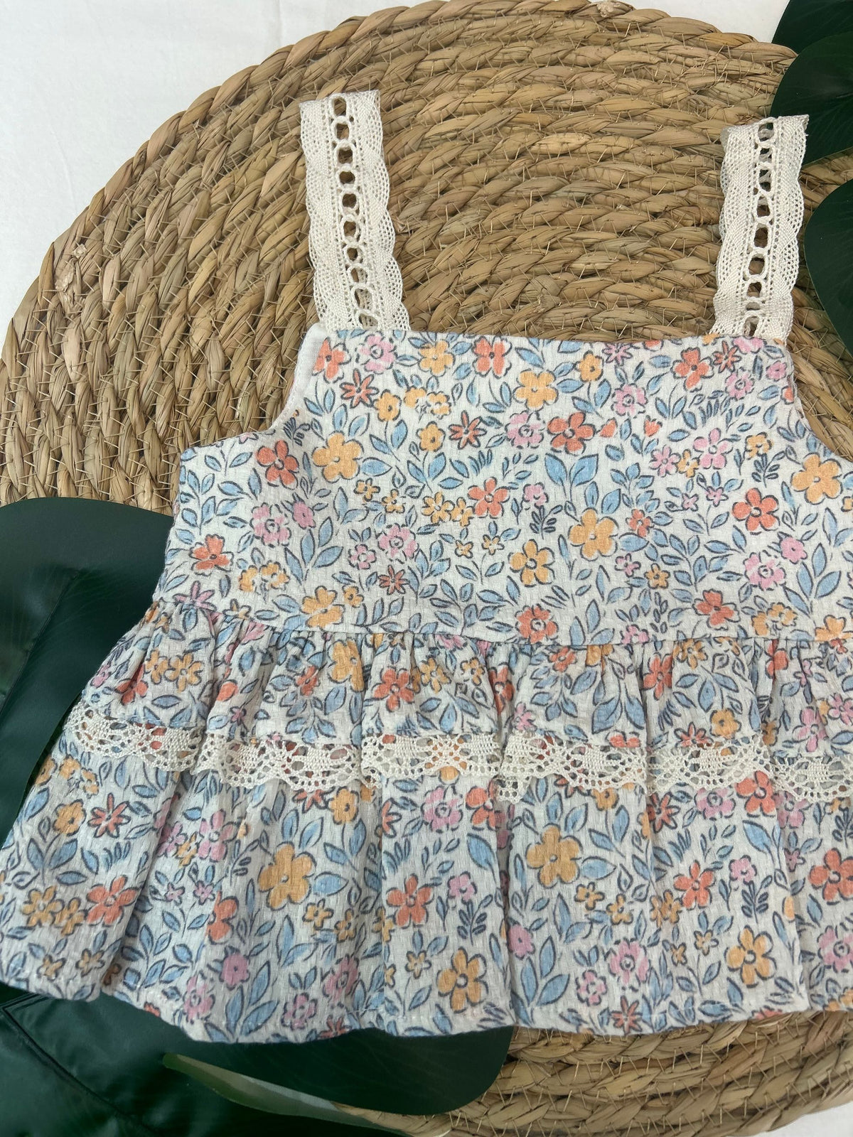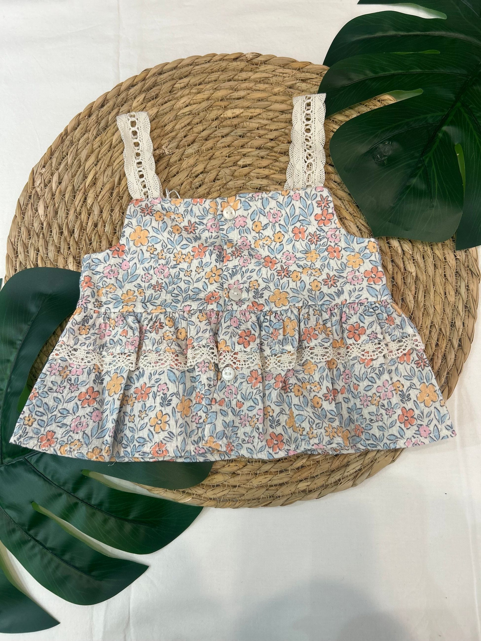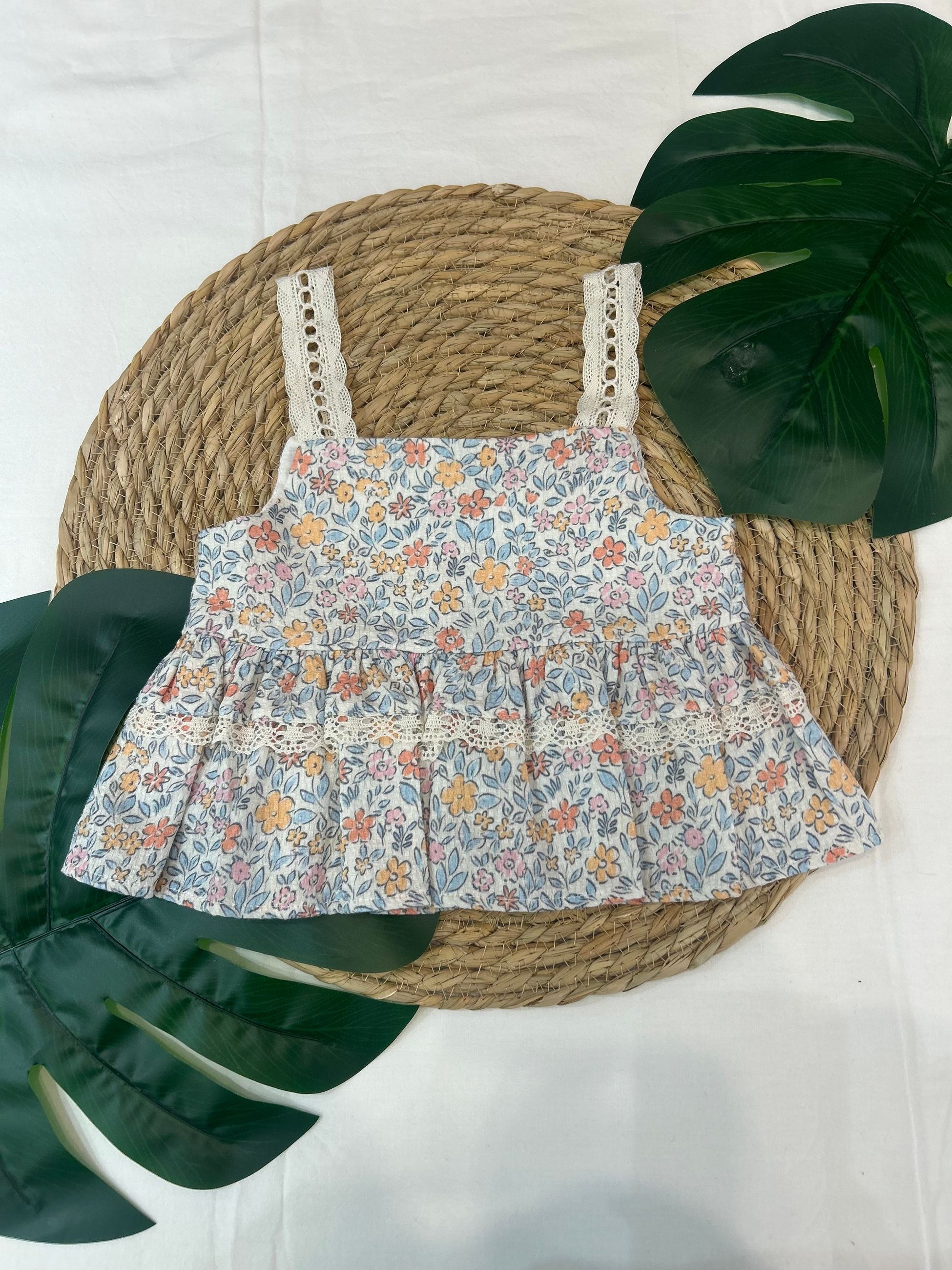 top con bretelle in merletto che richiamano il bordino delle balze su fondo fantasia fiori stilizzati in tonalità pastello