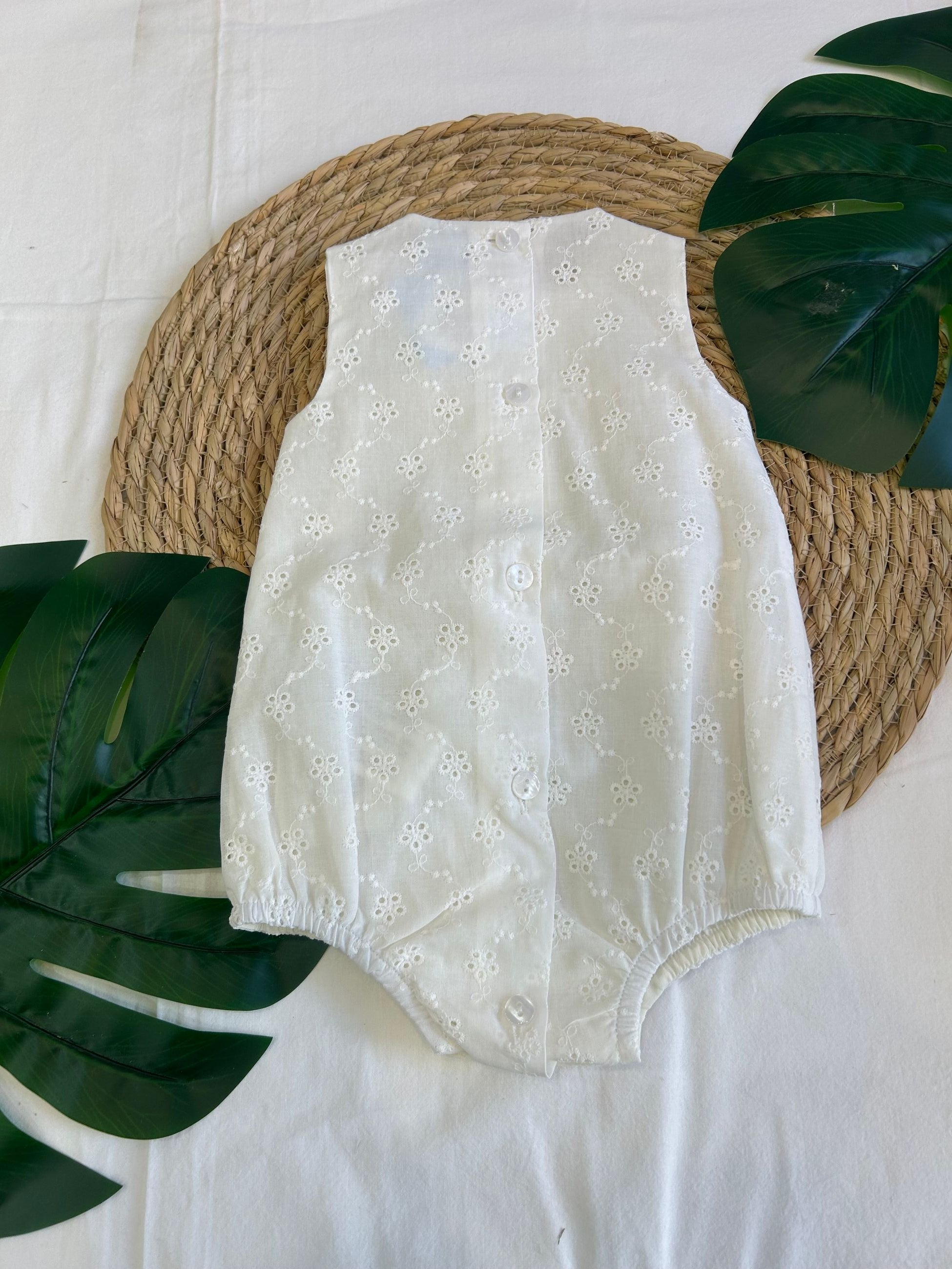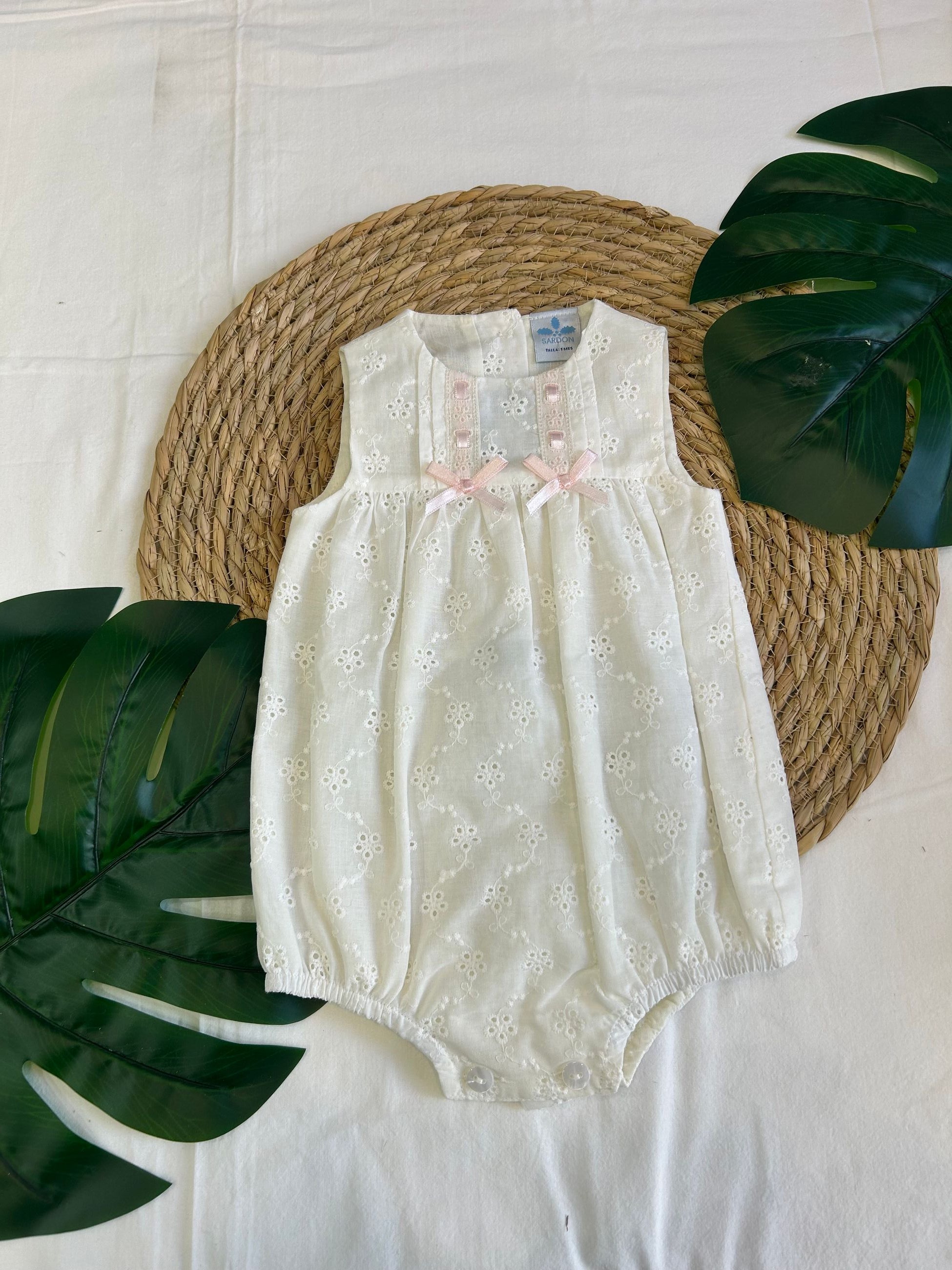 pagliaccetto girocollo , giromanica in san gallo, con fiocchetti rosa e bottoni sul fondo per rendere comodo il cambio