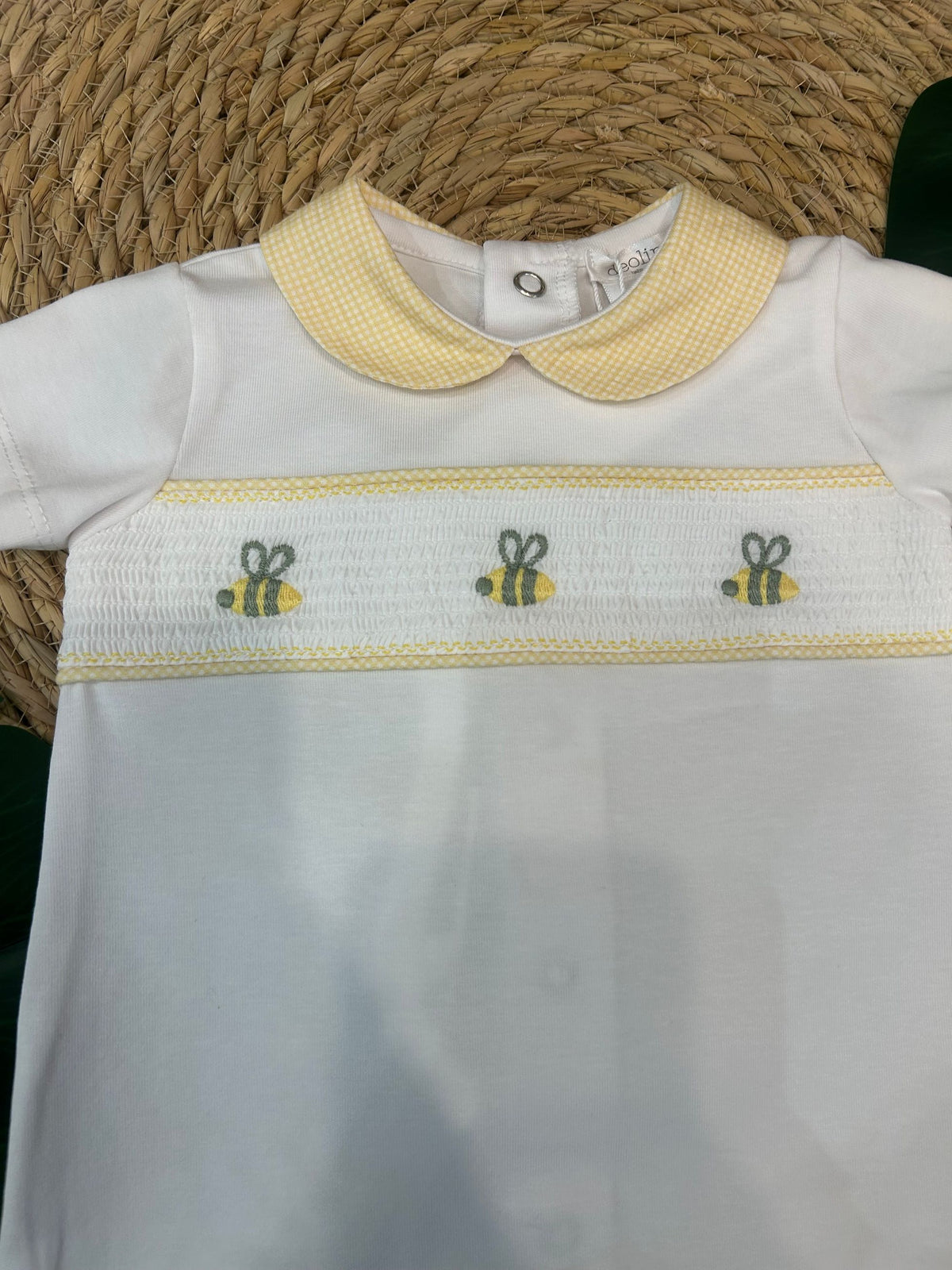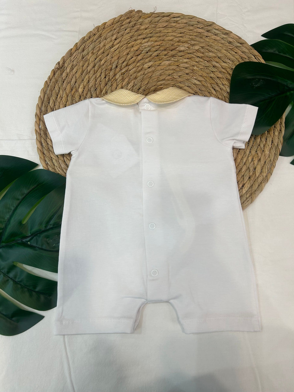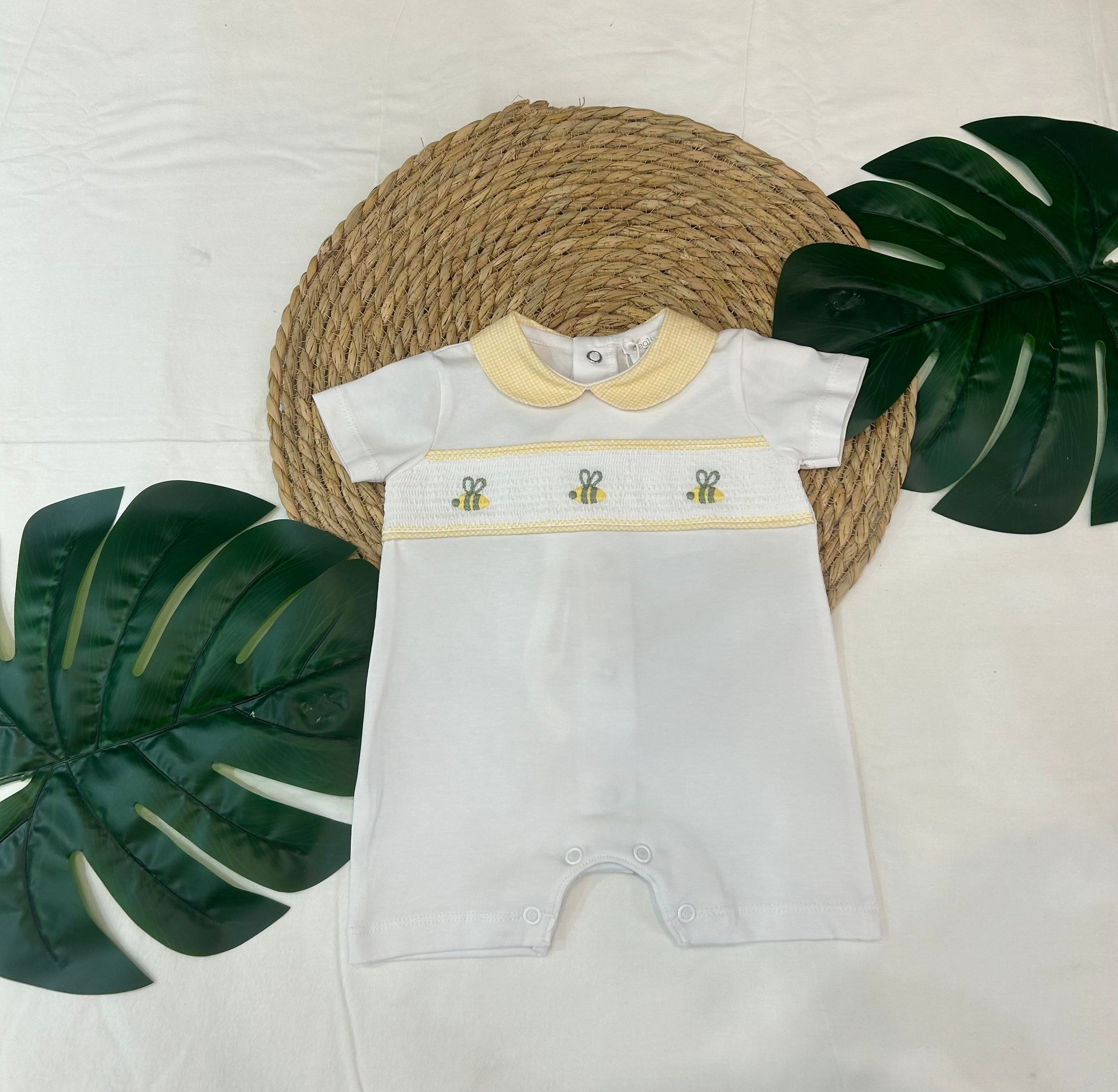 pagliaccetto mezza manica con collo tondo e arriccia sul petto ricamato con apine. un look perfetto, fresco e comodo anche per i più piccoli