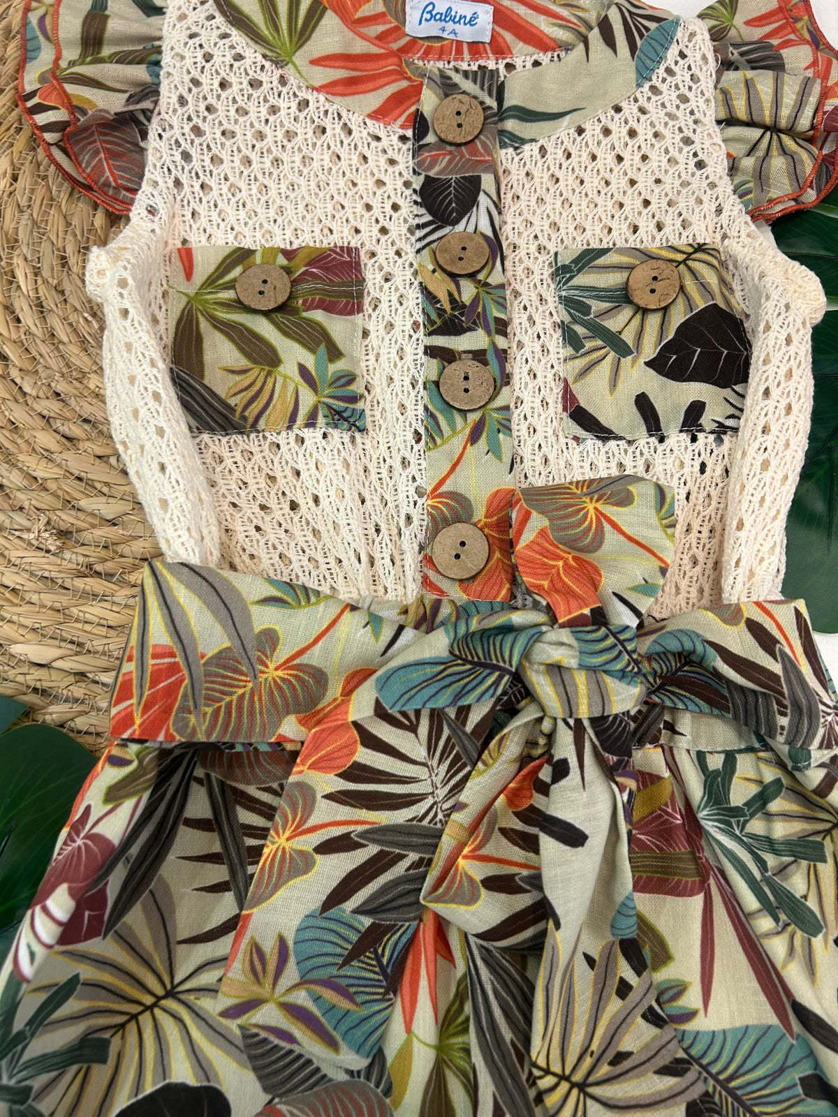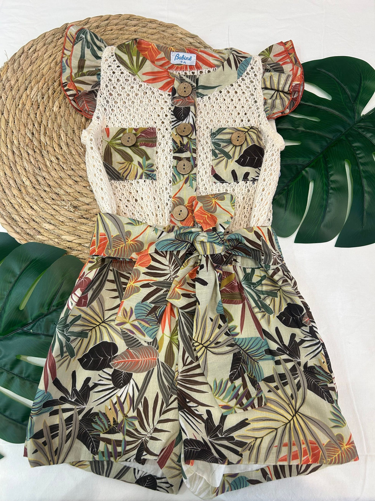 tutina scollo tondo con bottoni in legno e rouches sulla manica accompagnata da pizzo macrame sul petto, cinturina in vita e fantasia strong per essere eleganti anche nelle situazioni più casual