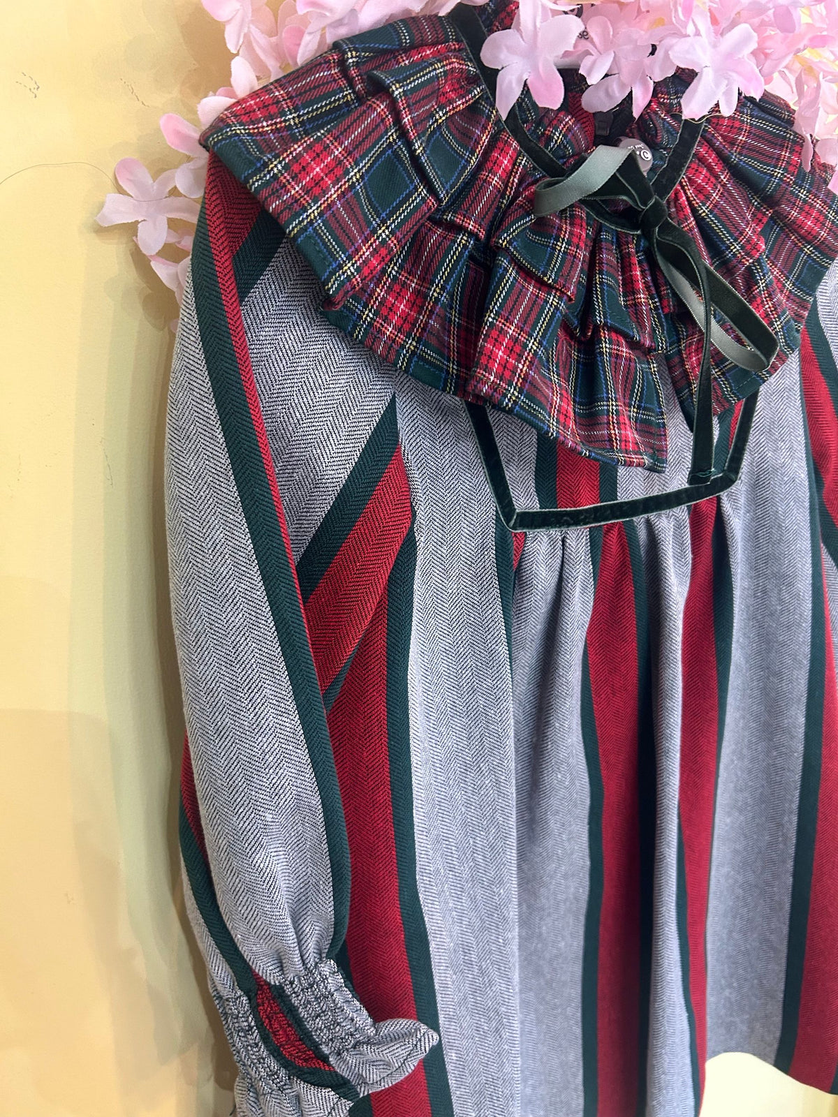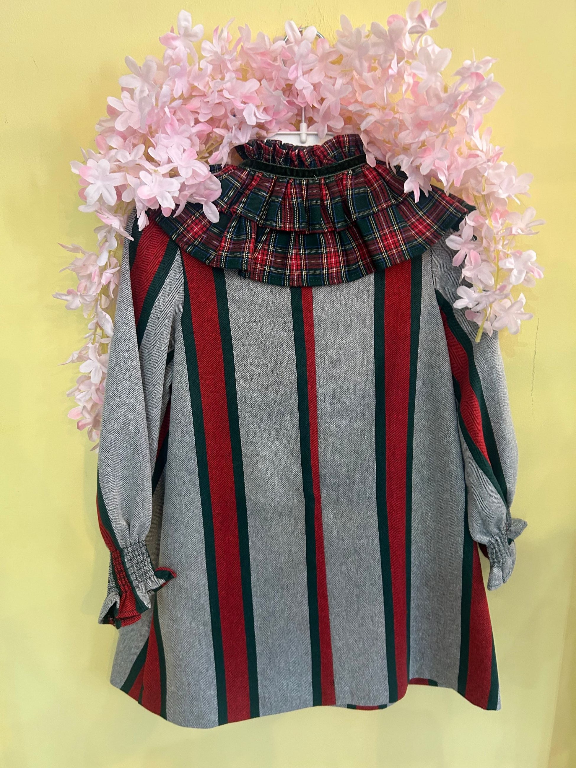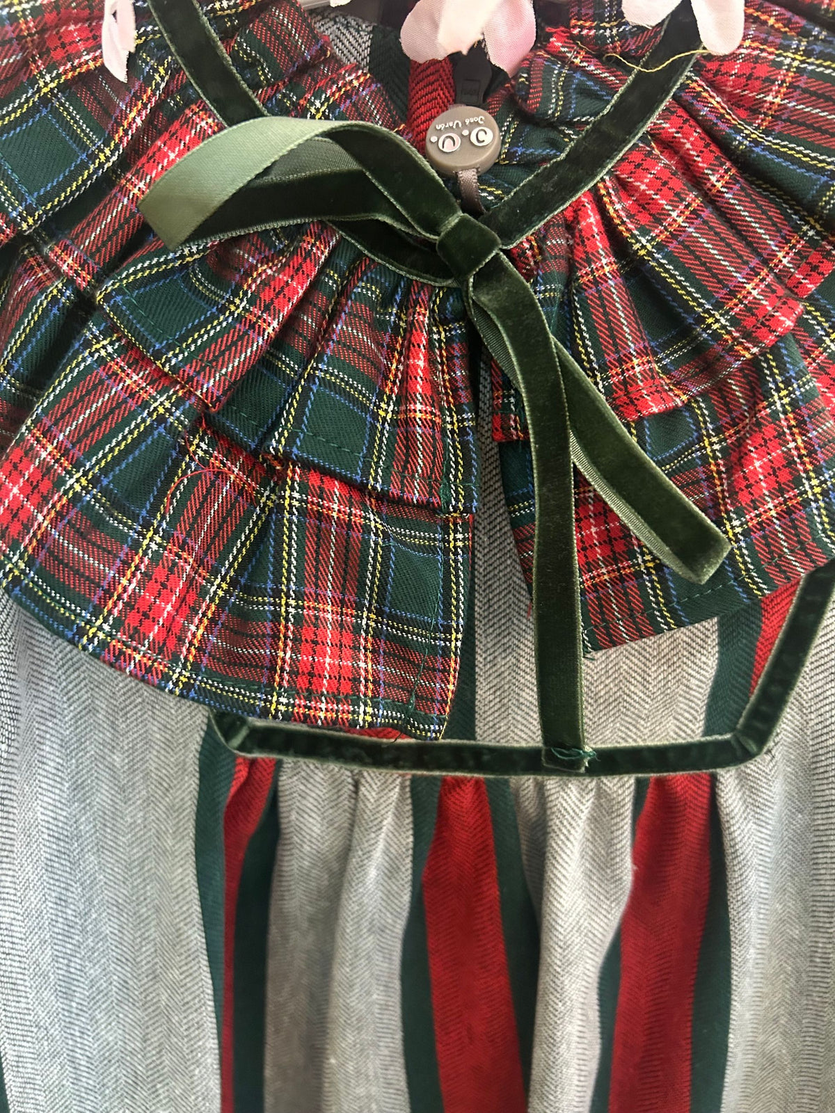 abito girocollo con manica lunga e zip al retro,l'abito porta un collo applicabile in tessuto tatrtan perfetto per rendere moderno il suo natale,il tessutp di fondo e rigato nei toni del grigio bordeaux e verde