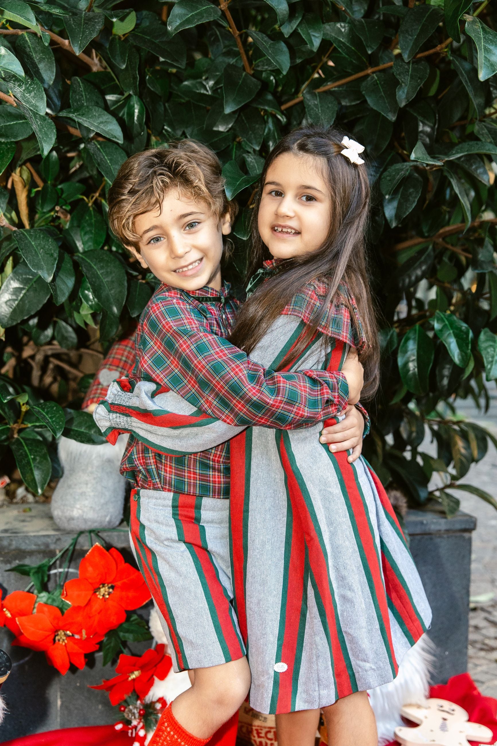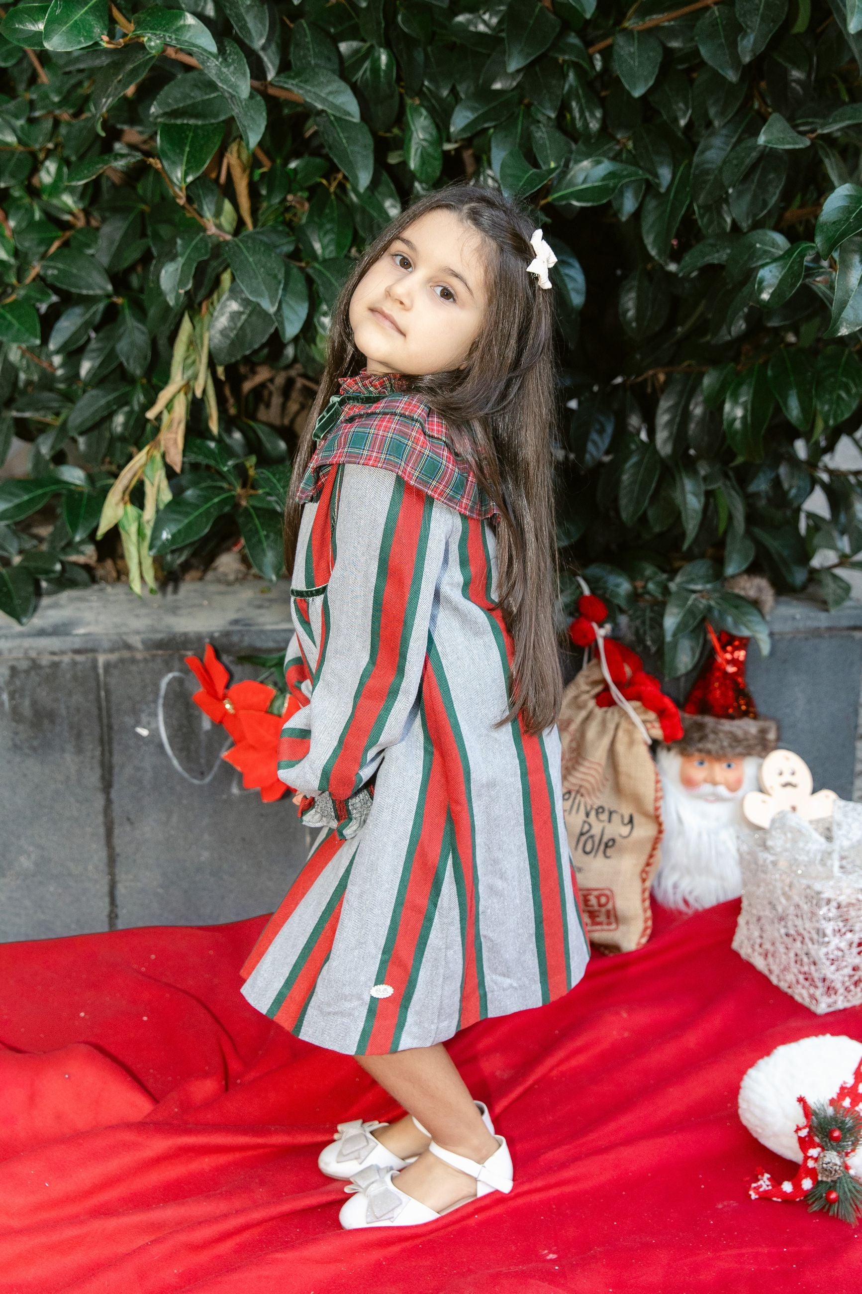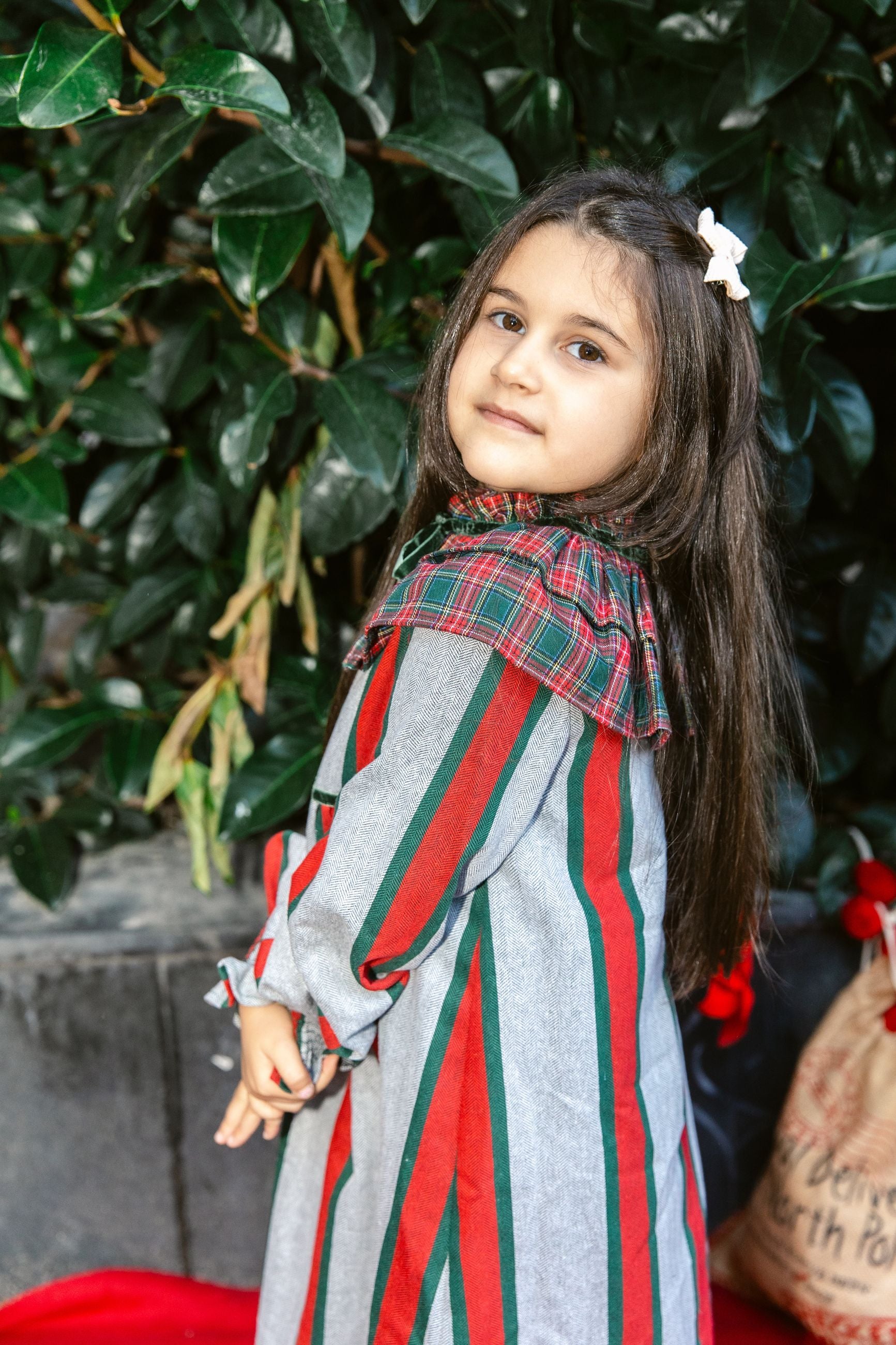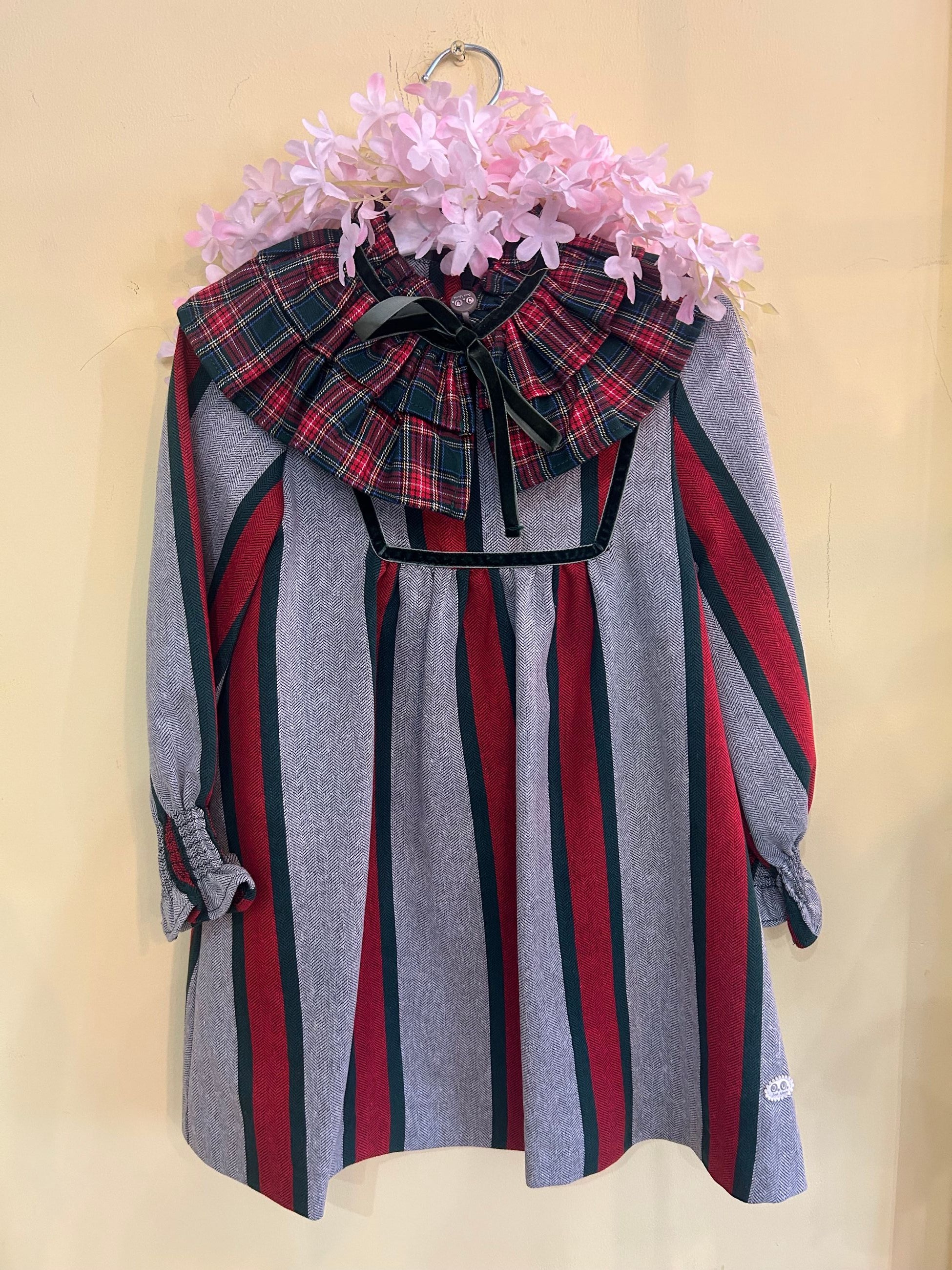 abito girocollo con manica lunga e zip al retro,l'abito porta un collo applicabile in tessuto tatrtan perfetto per rendere moderno il suo natale,il tessutp di fondo e rigato nei toni del grigio bordeaux e verde