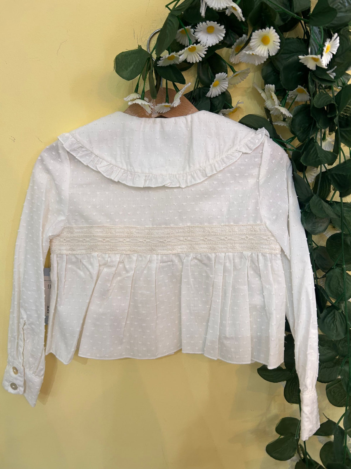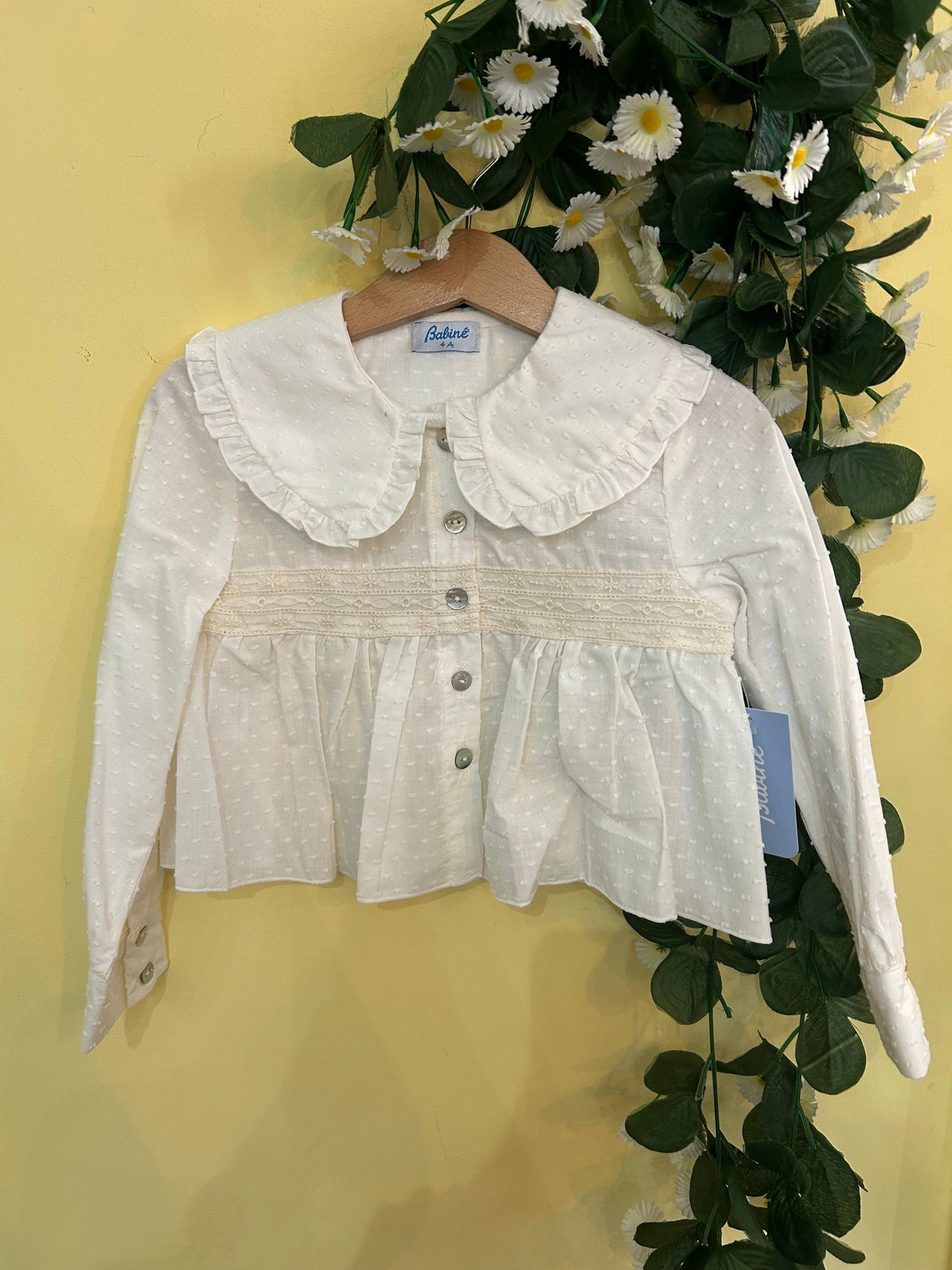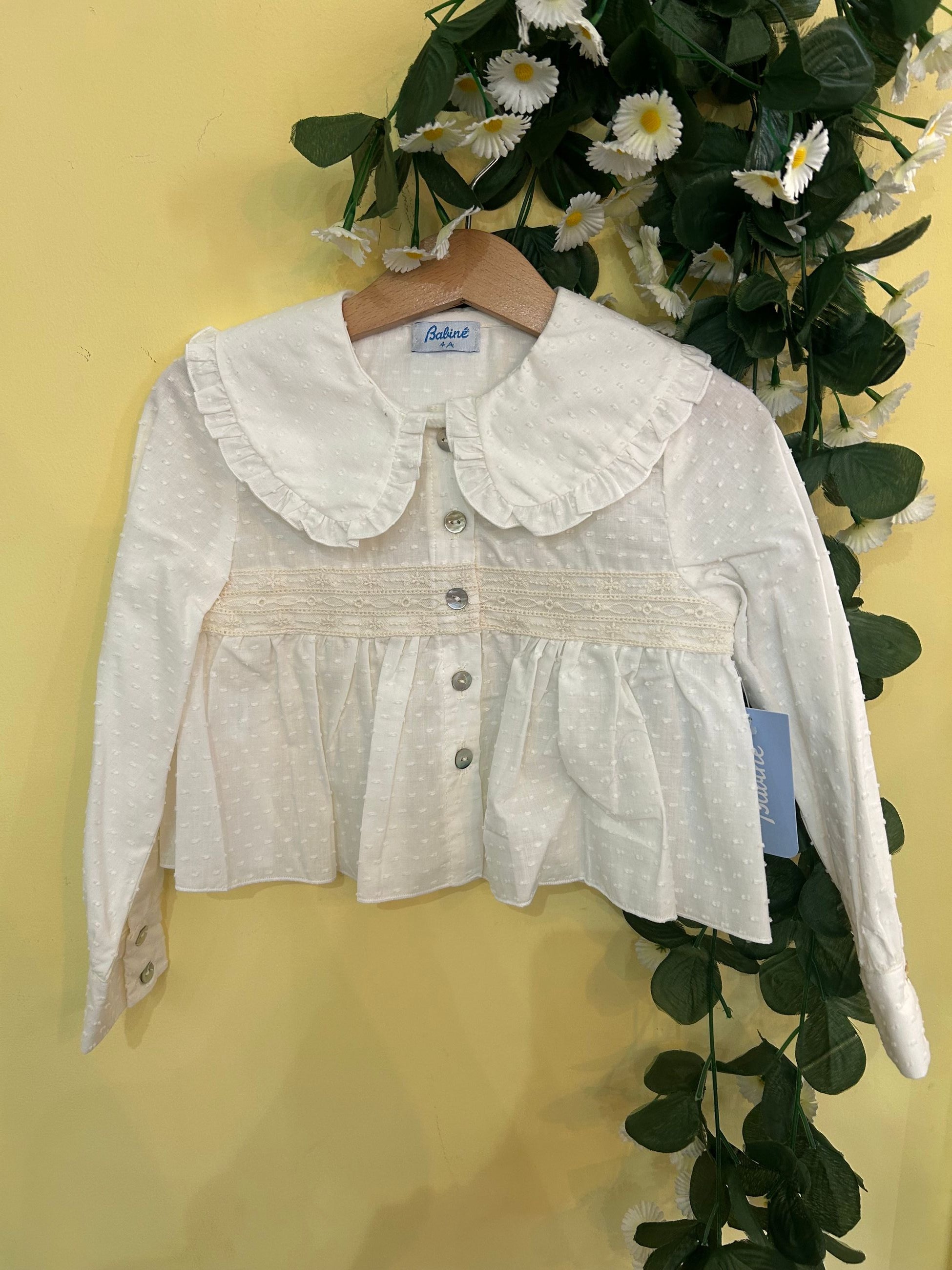camicia collo tondo, plumetie con fascia in merletto in vita e bottoncini in madreperla. colore super neutro perfetto da abbinare a look casual o più eleganti