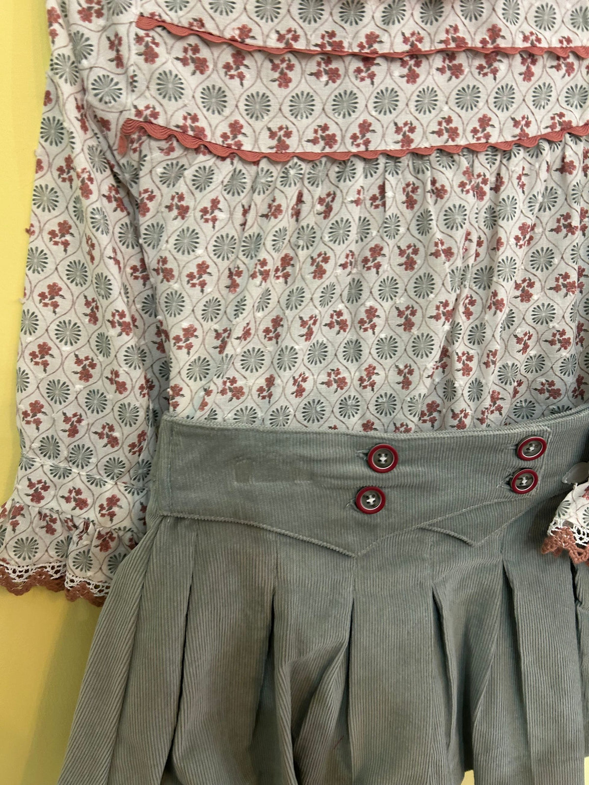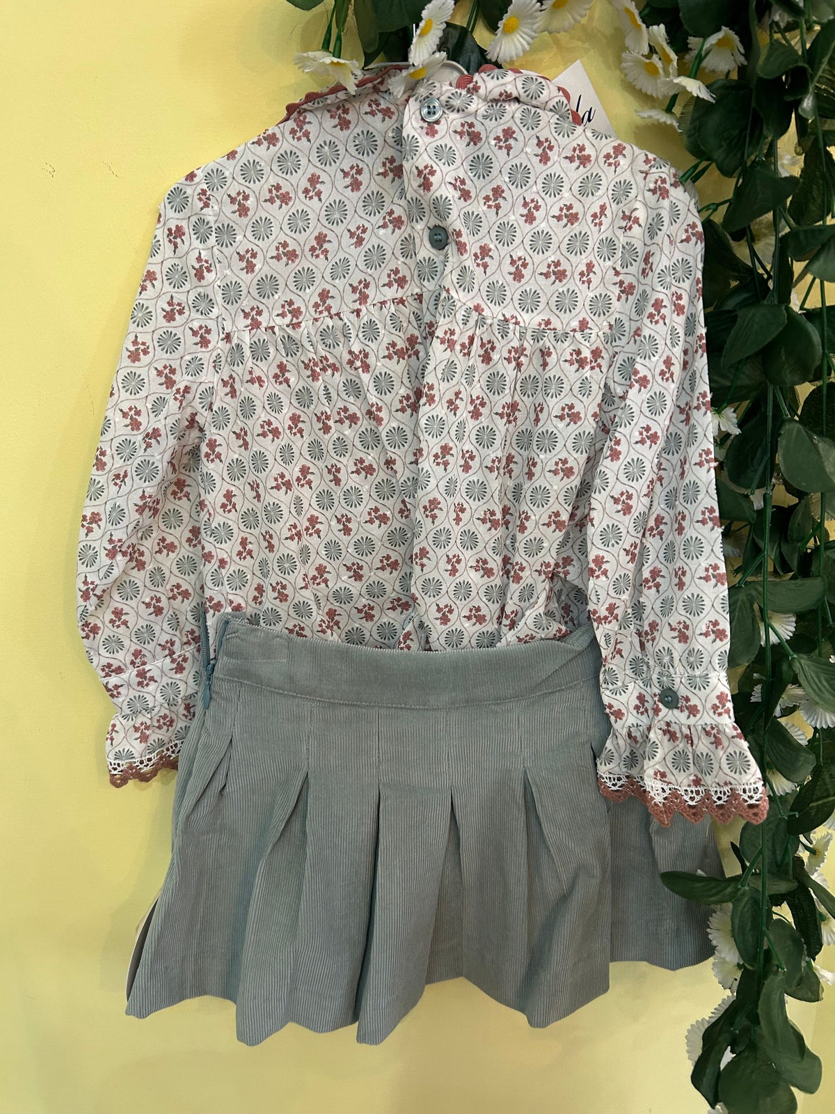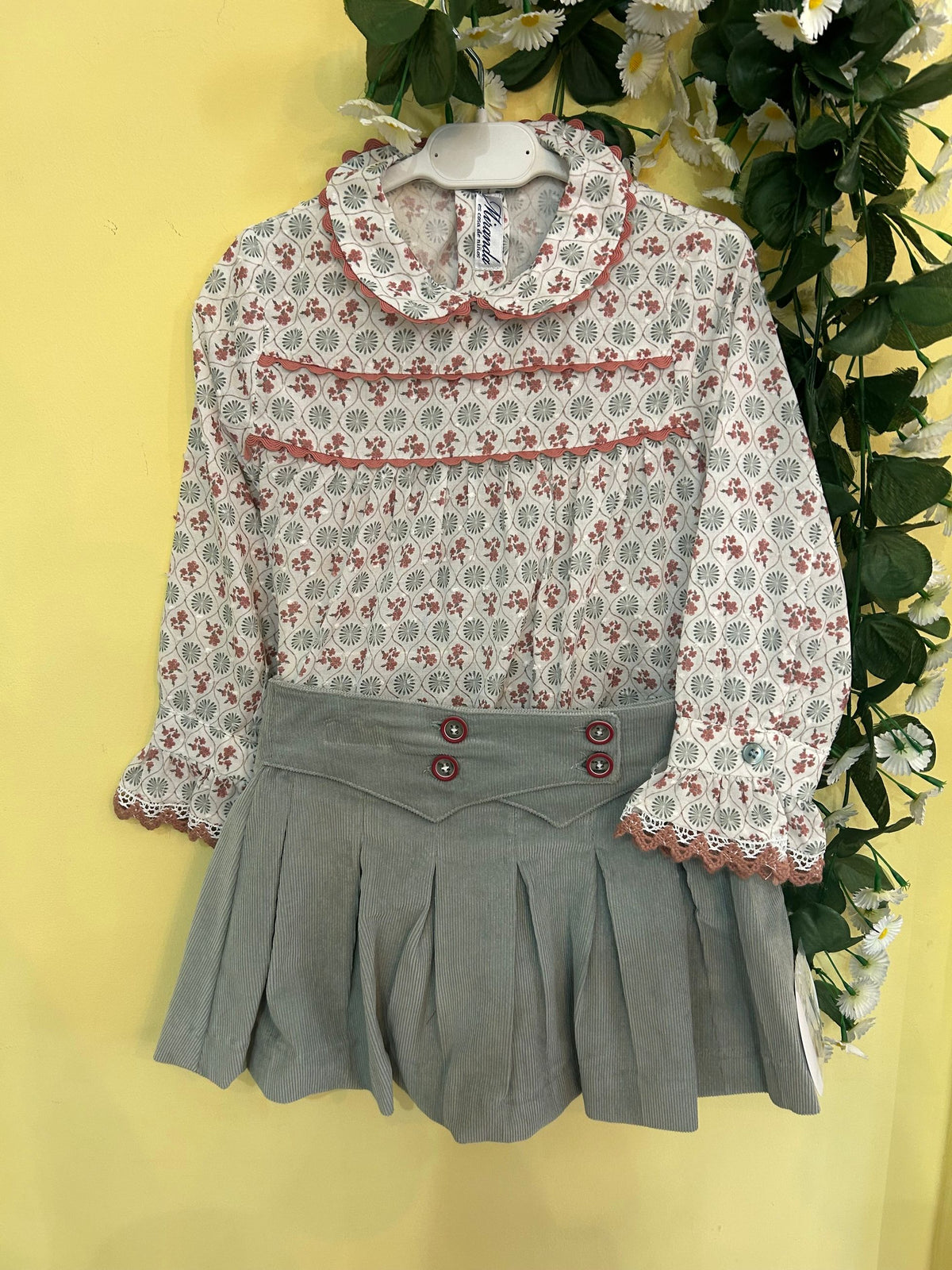 completo con blusa collo tondo con bordino e gonna in velluto a costine dai colori molto tenui adatti anche ai periodi autunnali