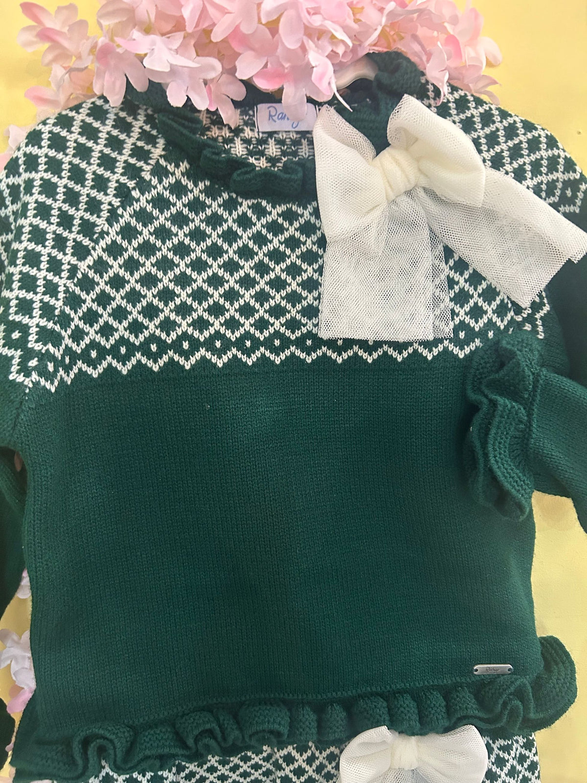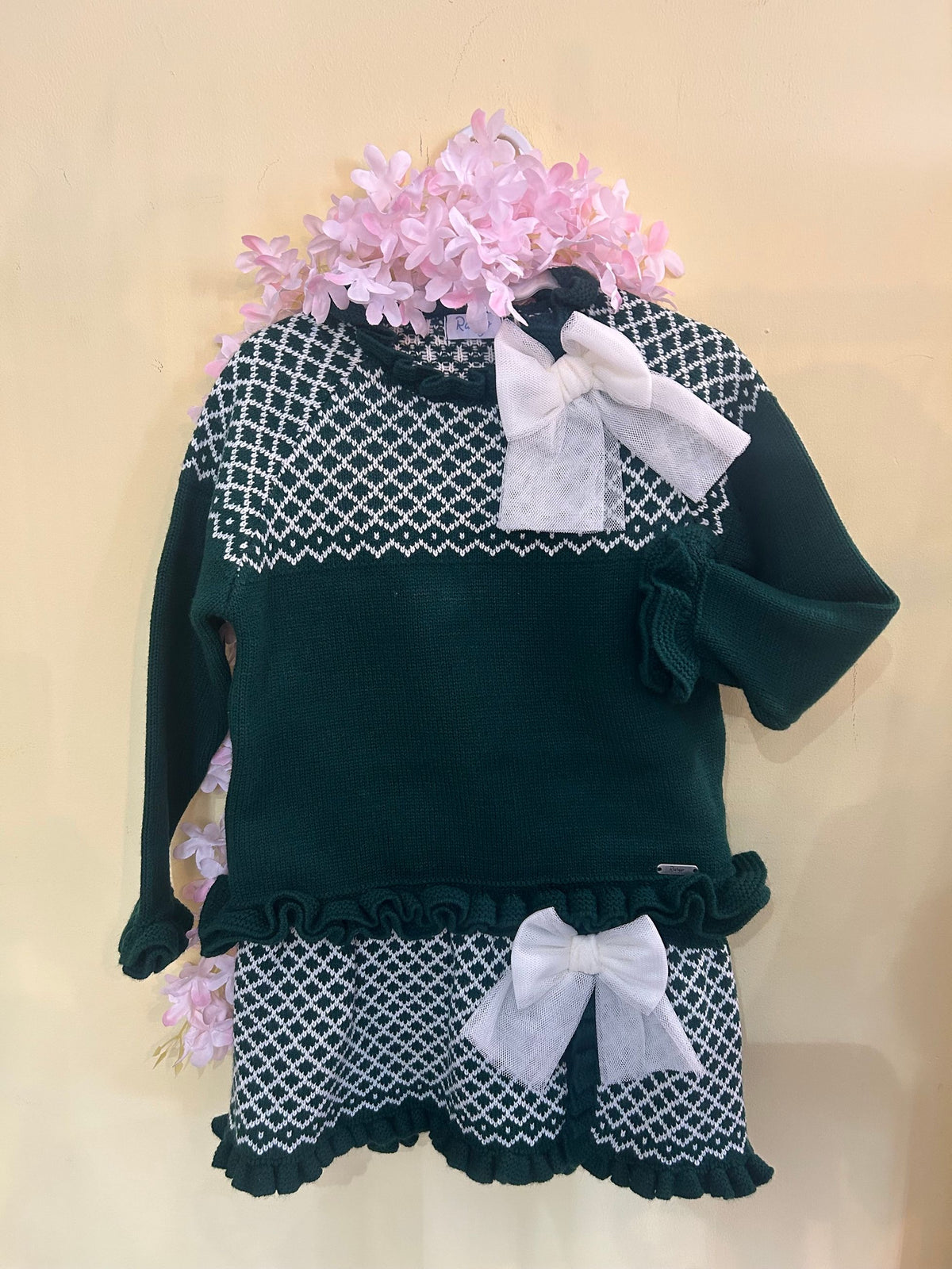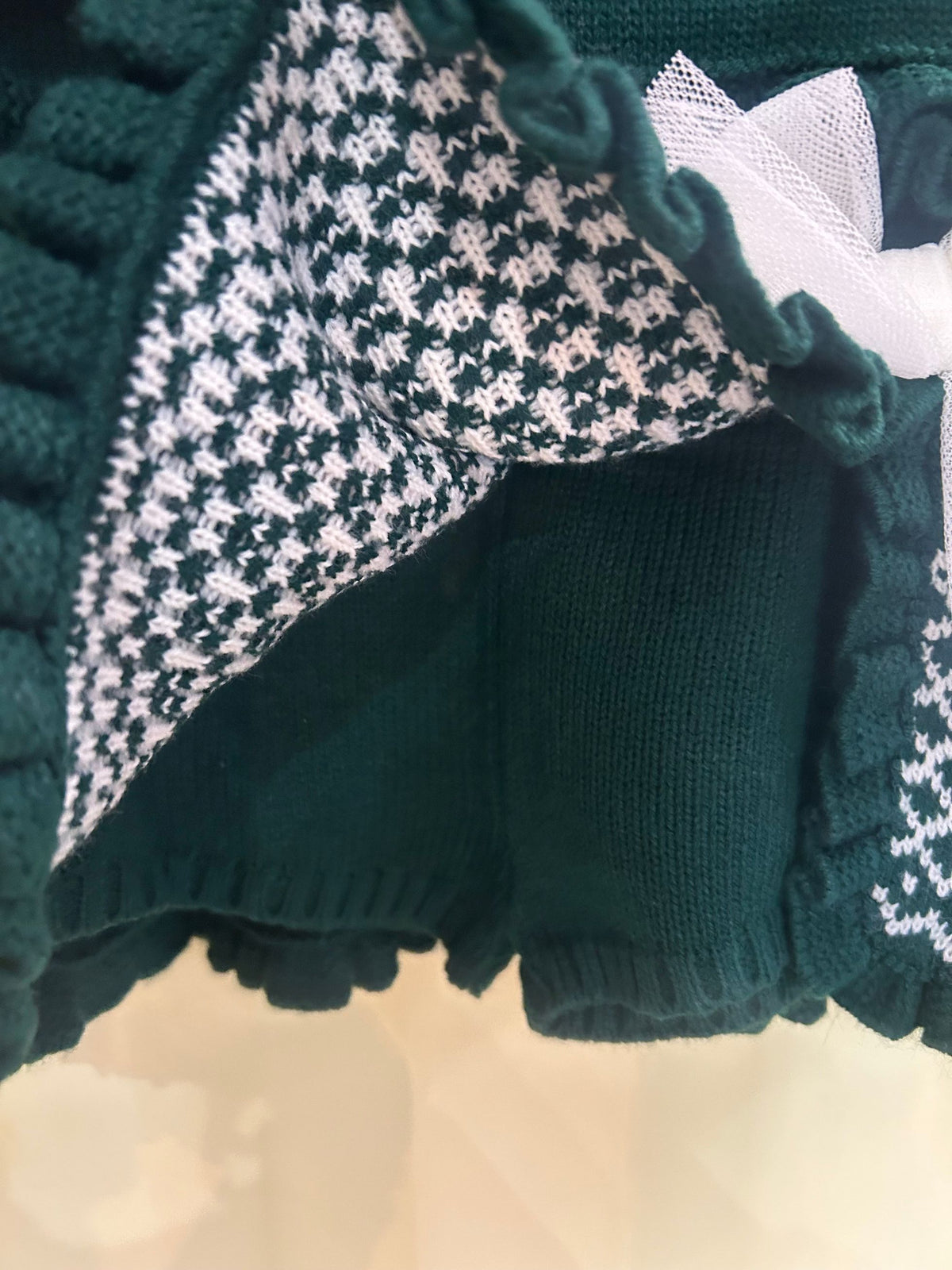 completo in maglia con rouches sulle estremita,i bottoni sul laterale sinistro permettono una comoda vestibilita e il fiocco in tulle a contrasto e puramente decorativo,la gonnellina porta un comodo shorts sotto ,che ermette movimenti comodi pur restando chic
