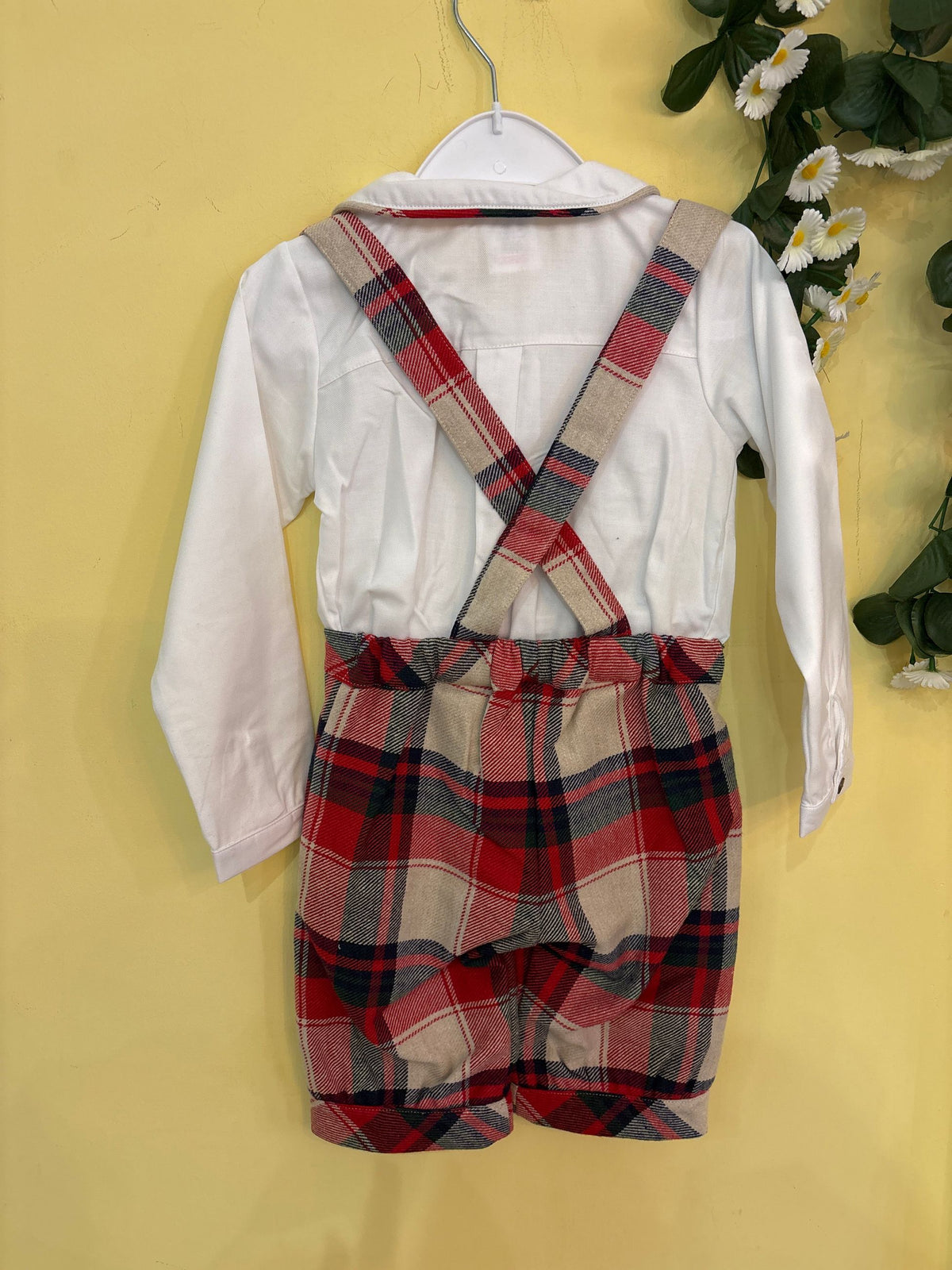 completo con camicia in cotone e collo a contrasto in flanella tartan,e salopette in flanella tartan modello alla zuawa, con bretelle regolabili e bottoni in legno
