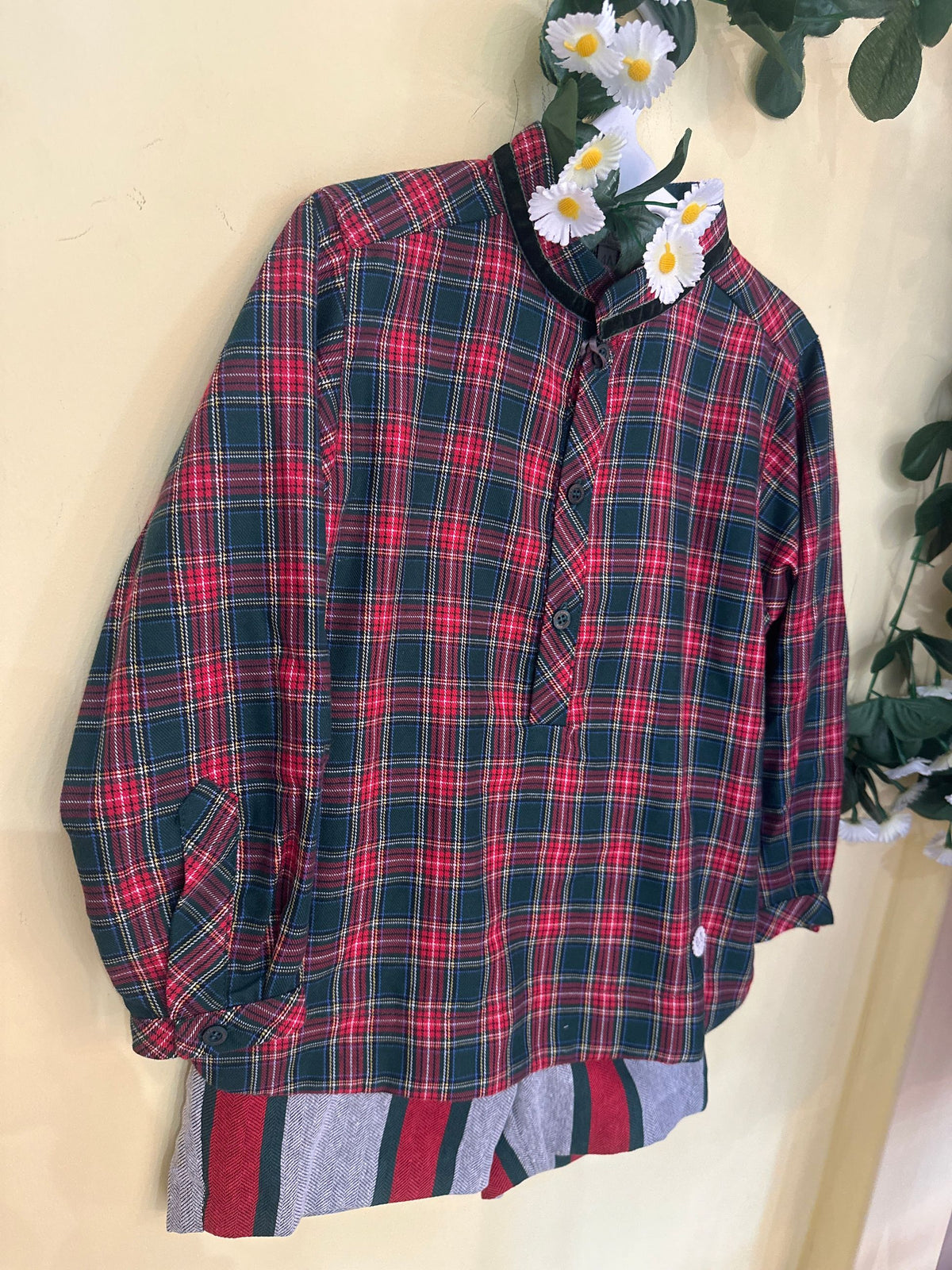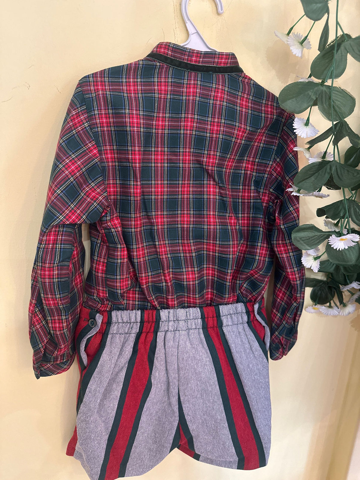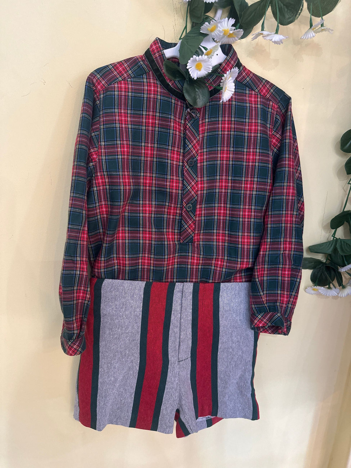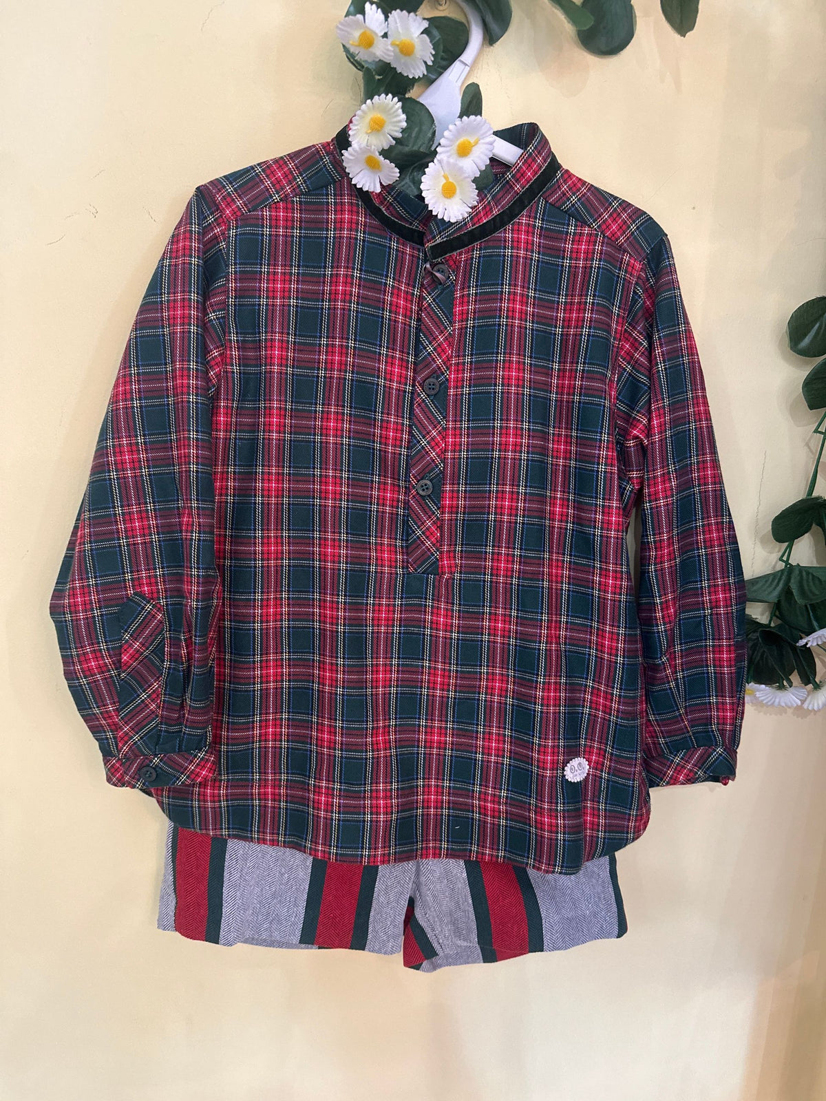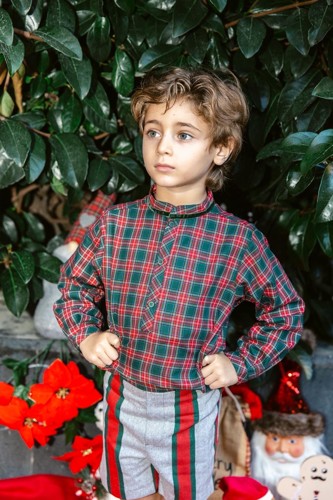 completo bermuda a righe su fondo grigio e camicia tartan, perfetto anche per il periodo natalizio