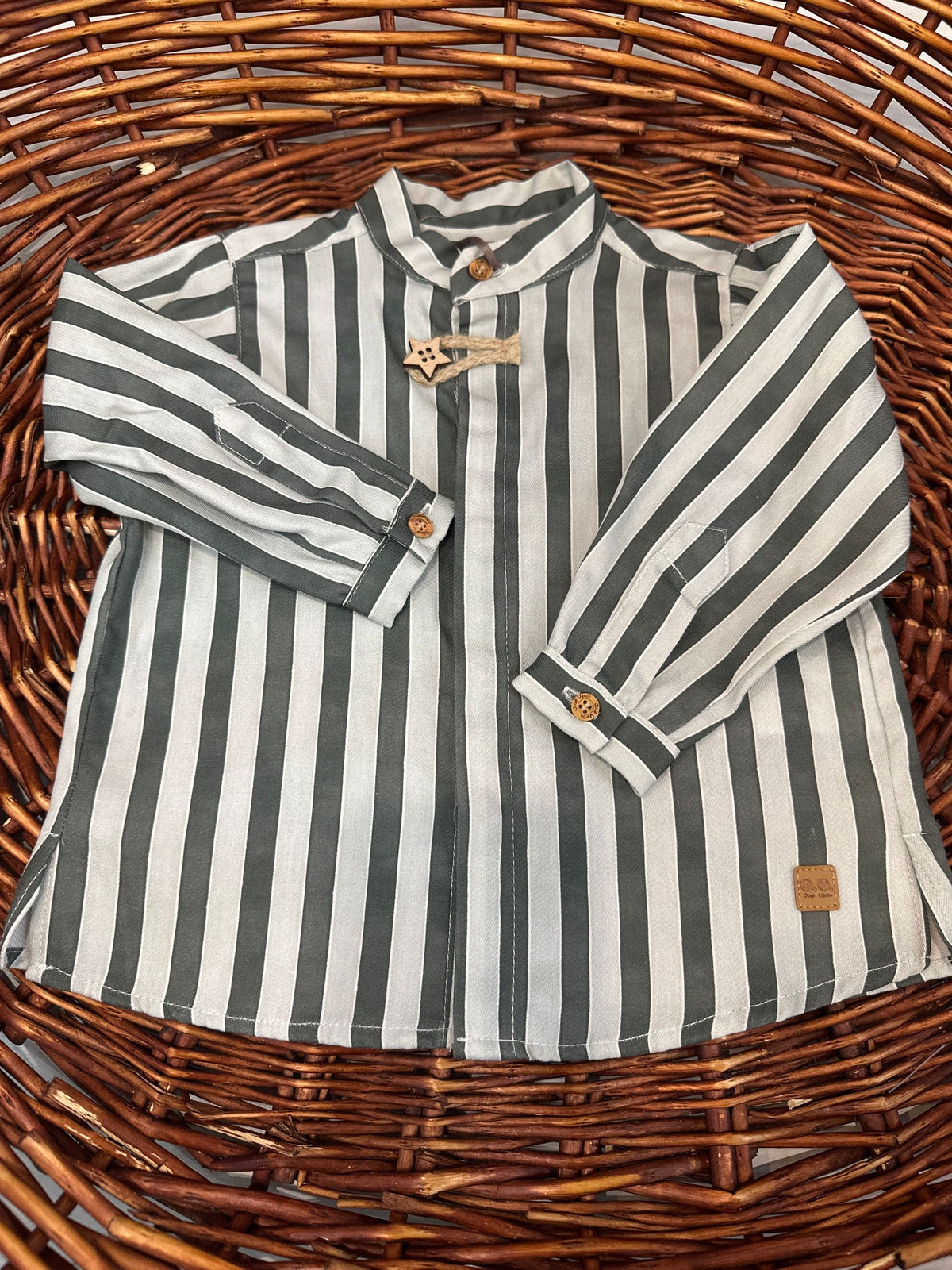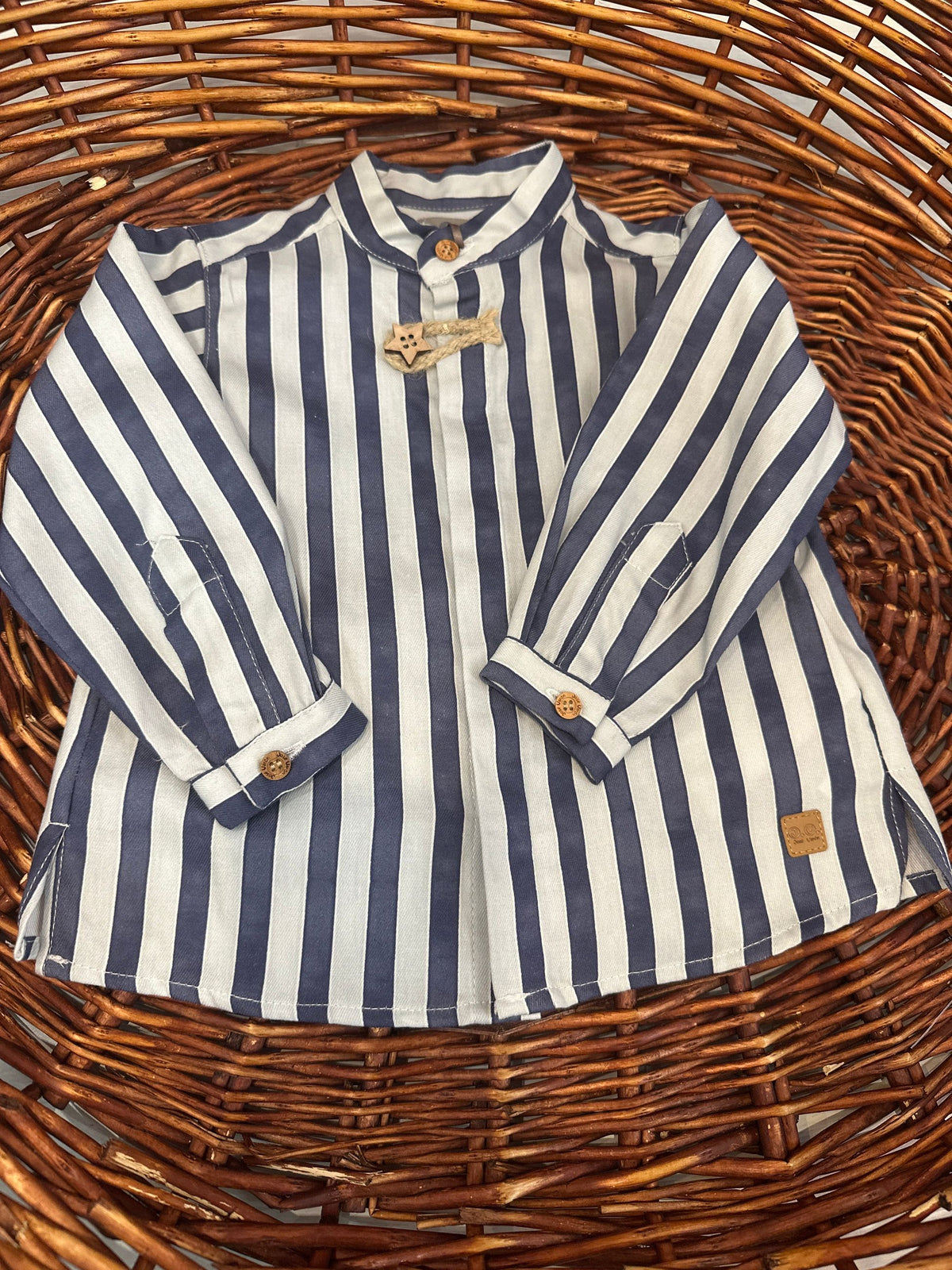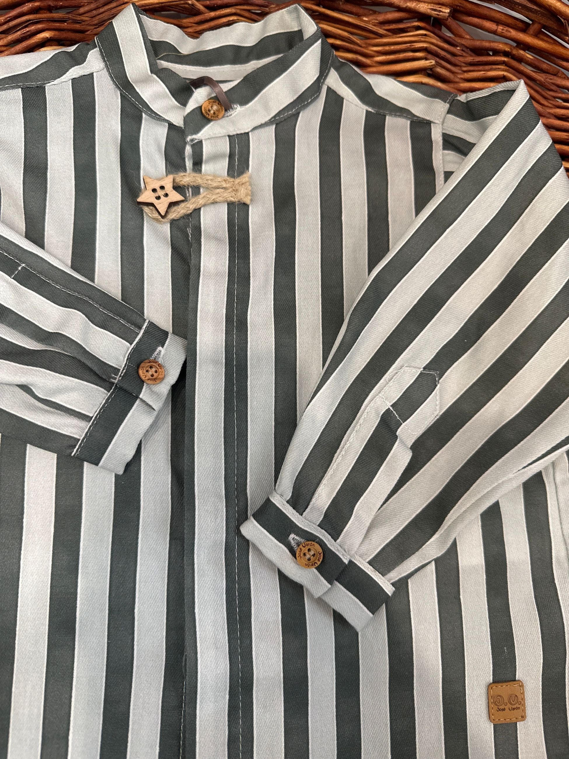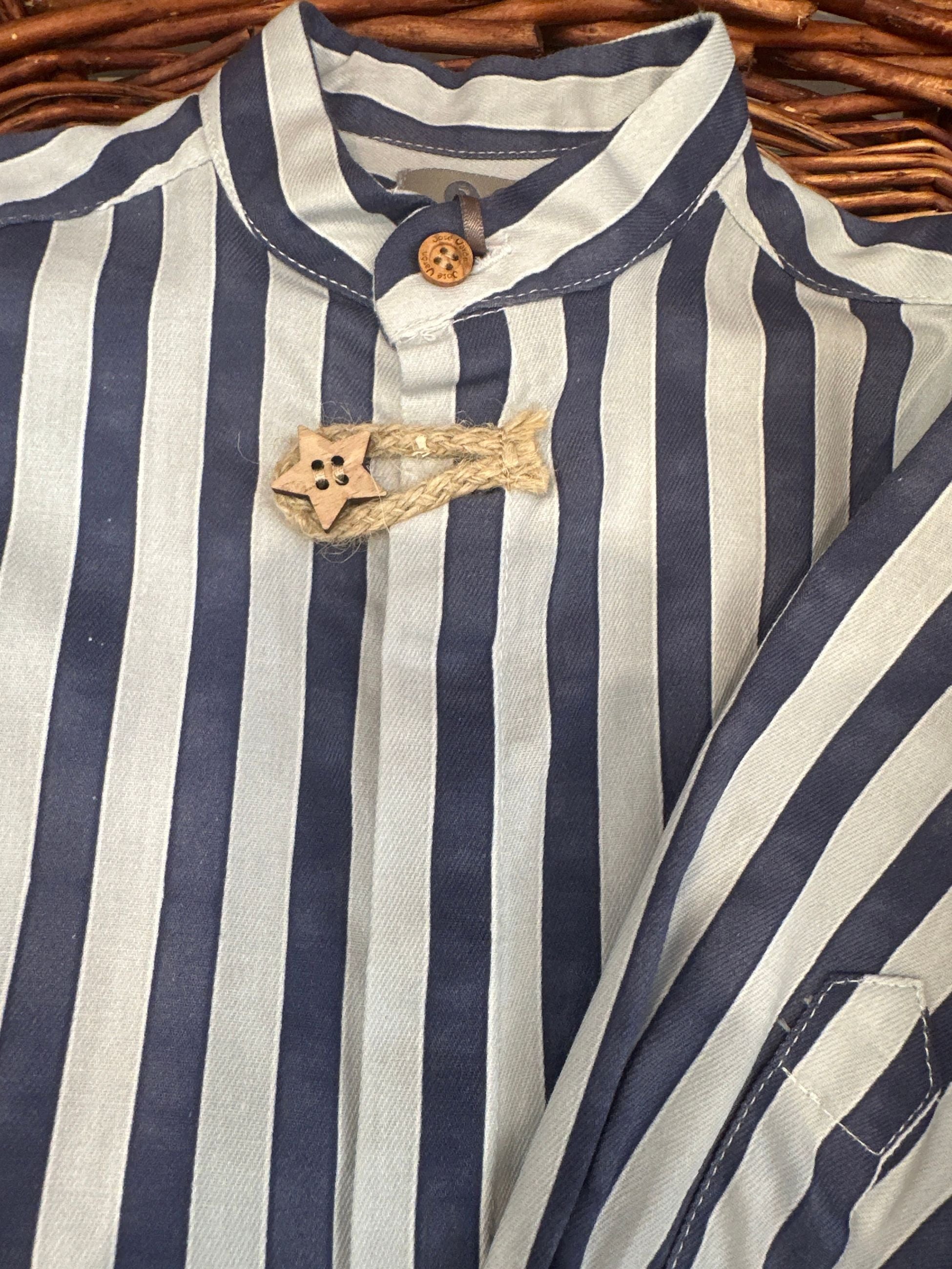 camicia in cotone fantasia a righe con collo coreano e manica lunga.la camicia porta l'abbottonatura a scomparsa sul davanti e i bottoni in legno,uno avanti a forma di stella che si chiude con alamaro in corda,è una camicia casual chic