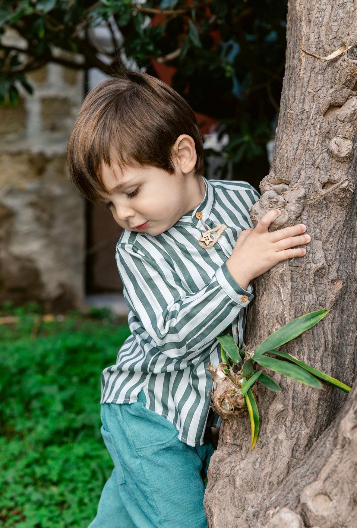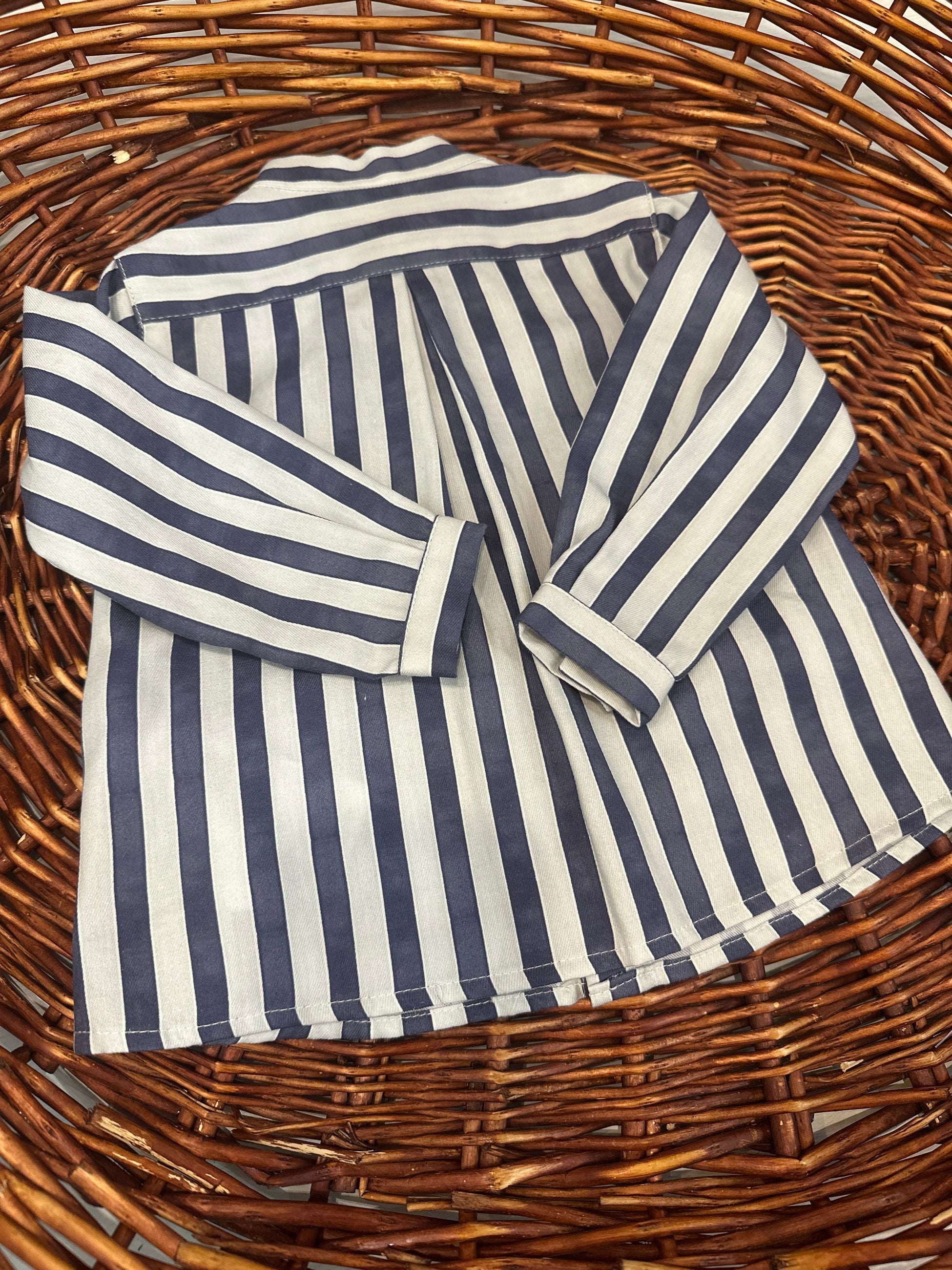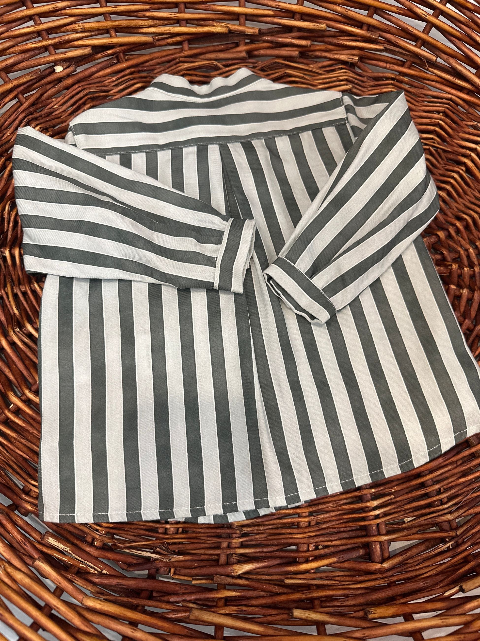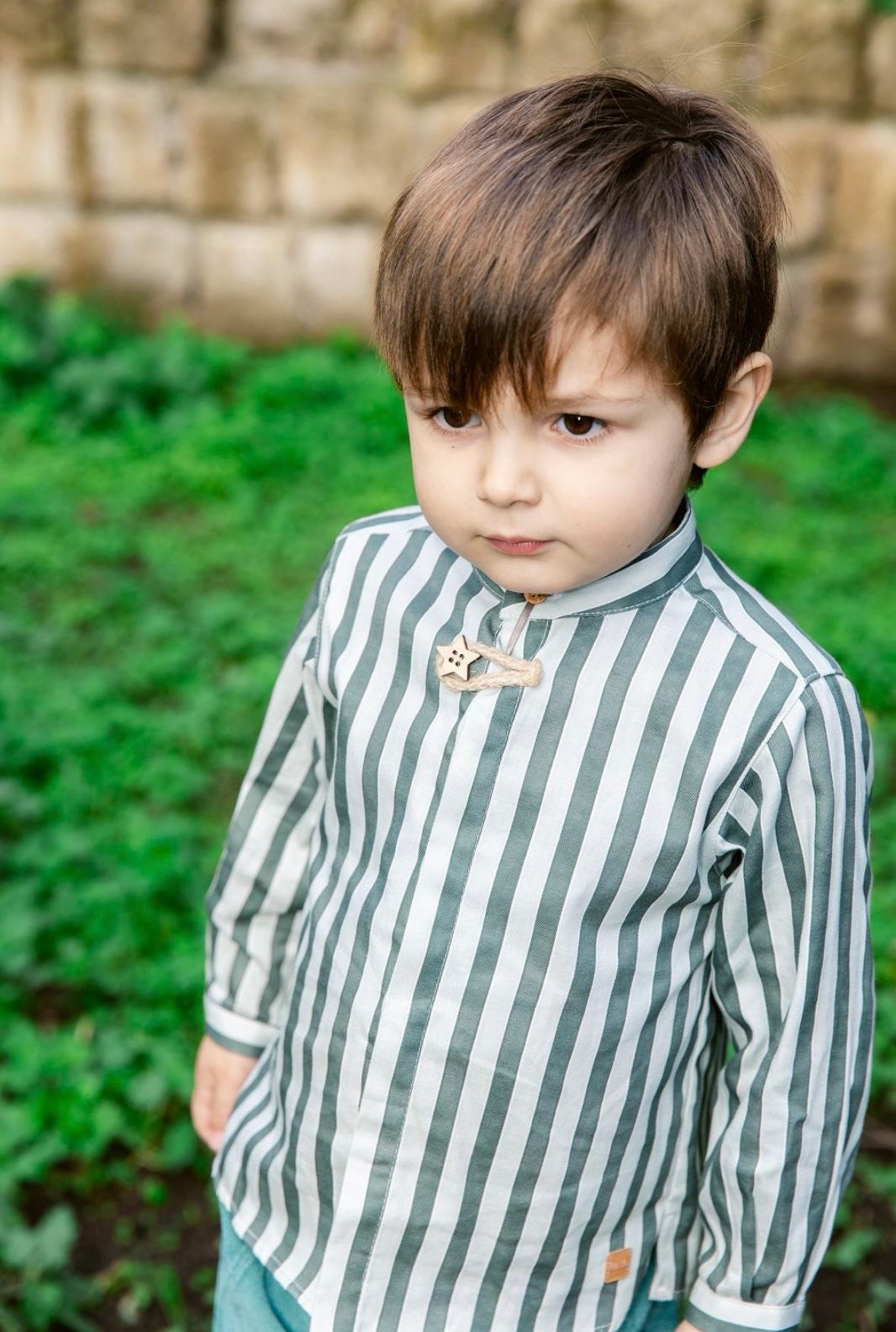 camicia in cotone fantasia a righe con collo coreano e manica lunga.la camicia porta l'abbottonatura a scomparsa sul davanti e i bottoni in legno,uno avanti a forma di stella che si chiude con alamaro in corda,è una camicia casual chic