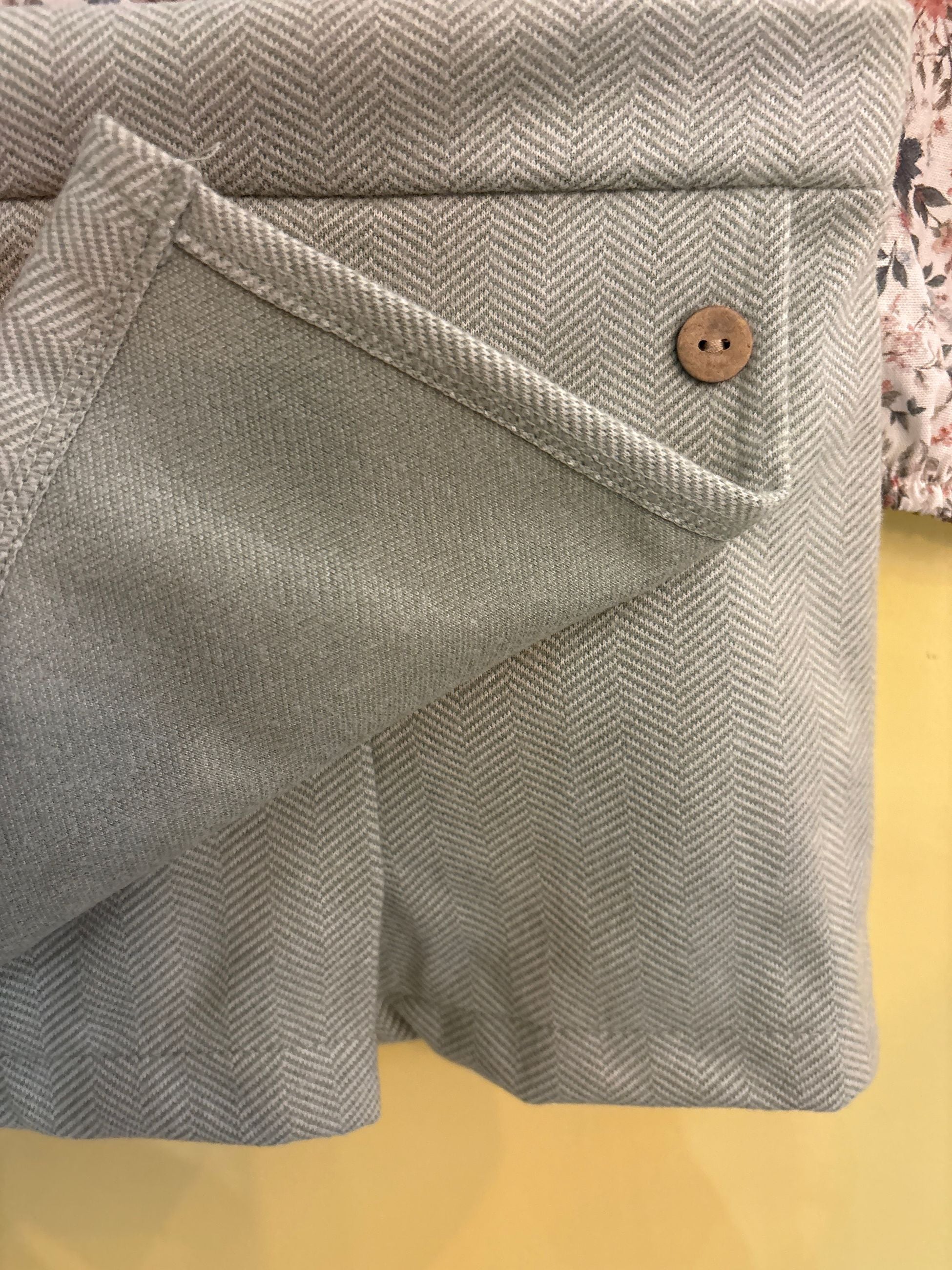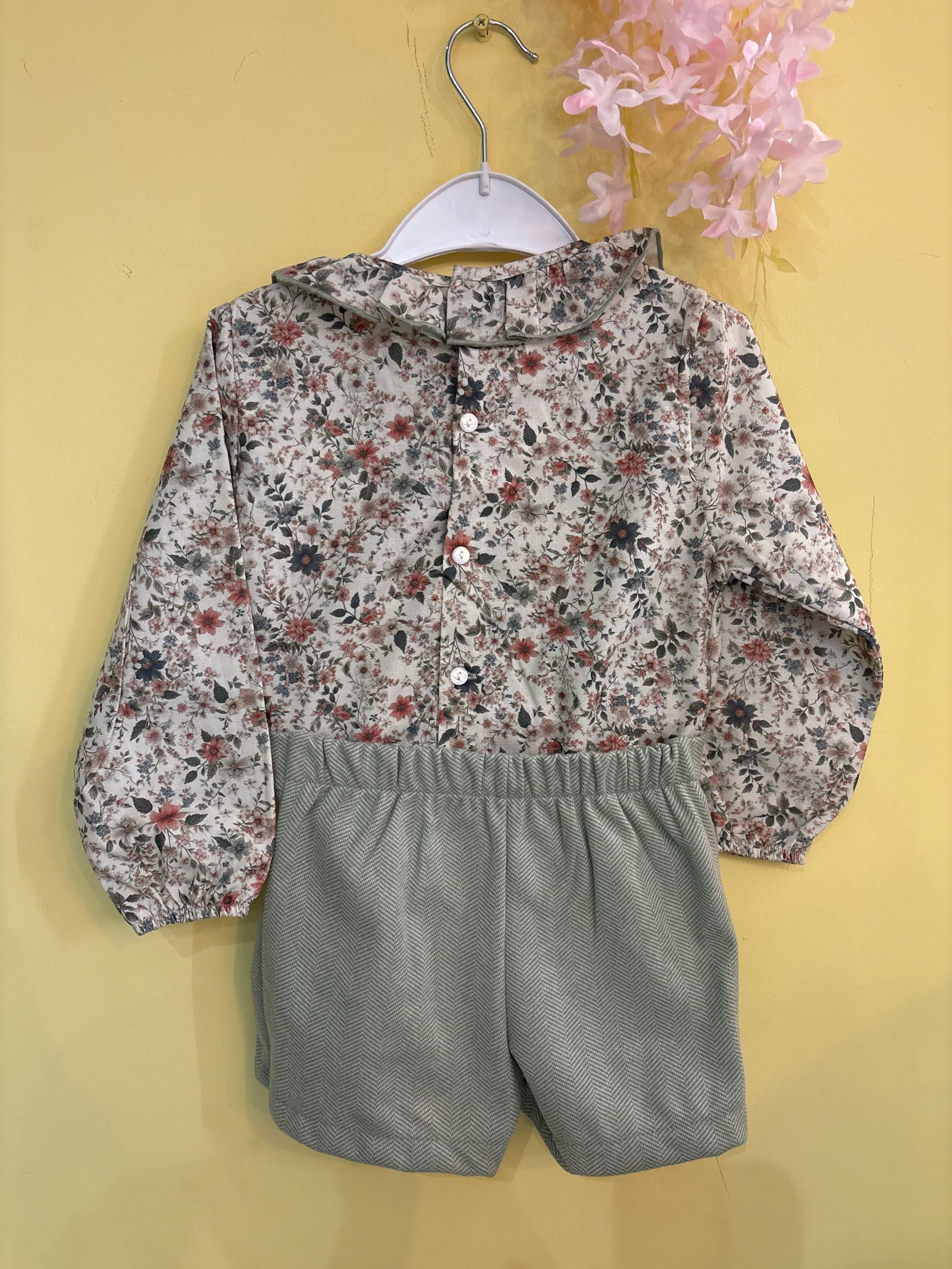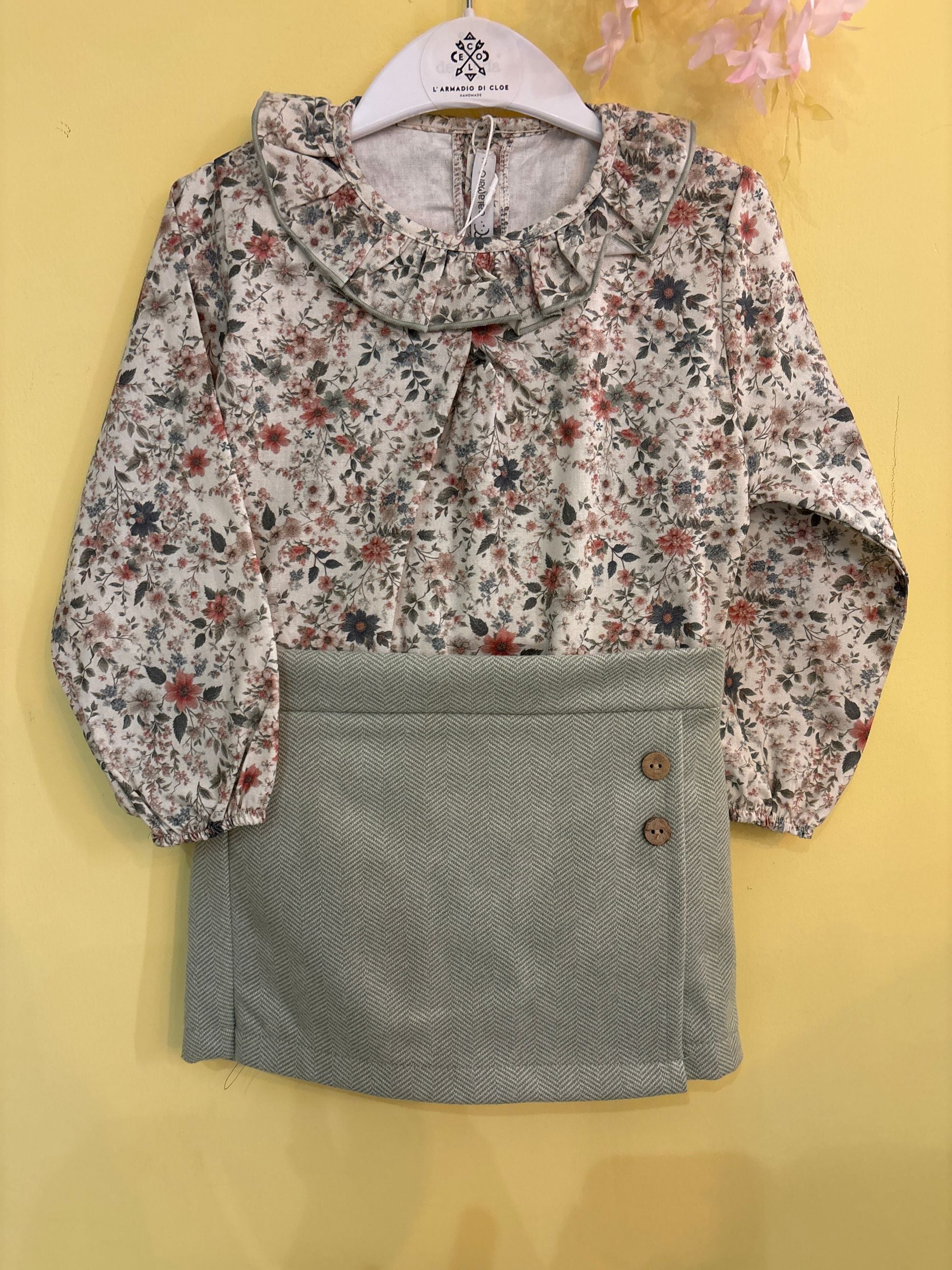 completo con camicia in fantasia a fiori provenzali e gonna pantalone in tessuto spigato verde,il completo risulta facile da indossare,comodo e versatile per tutte le occasioni