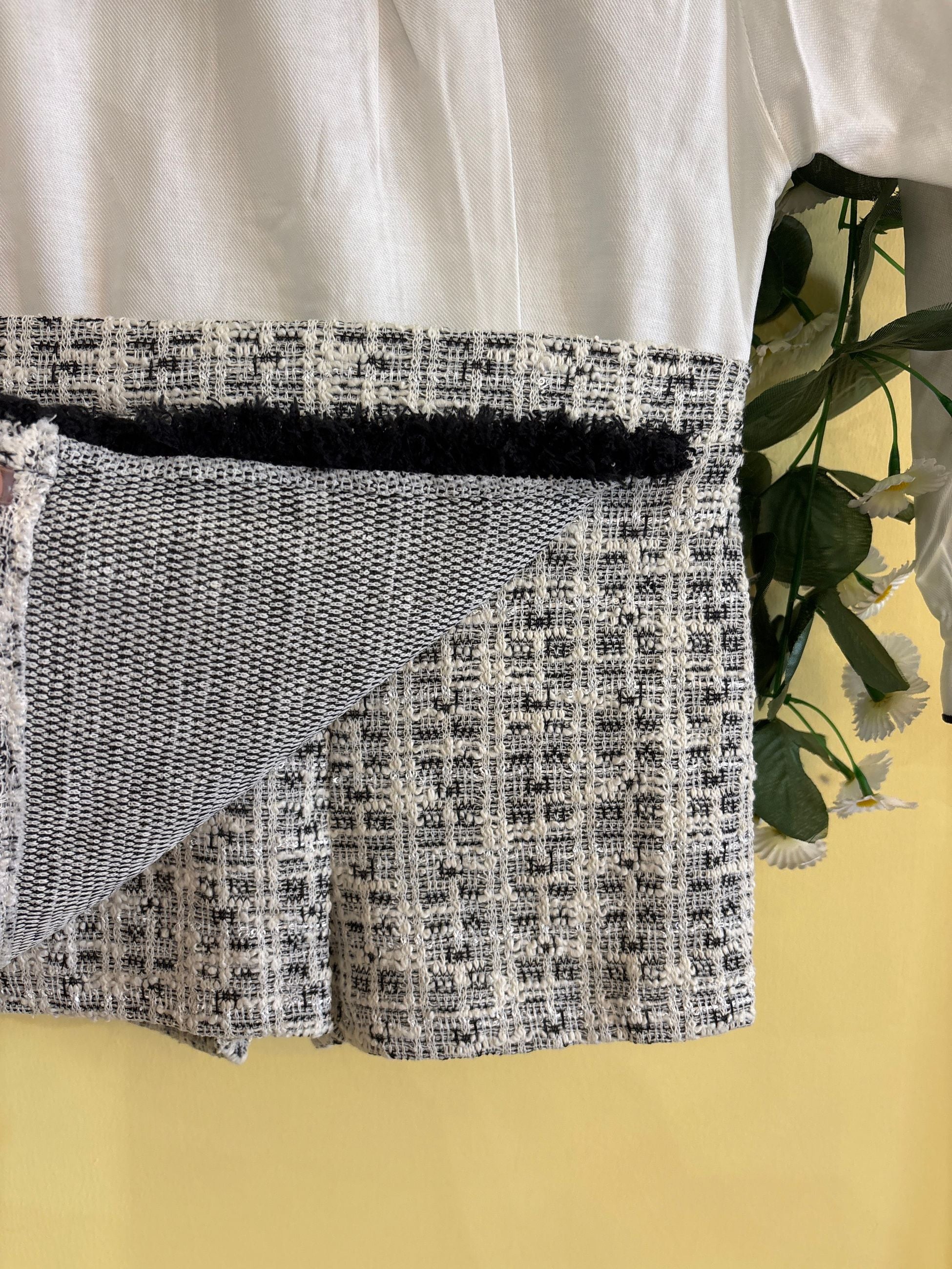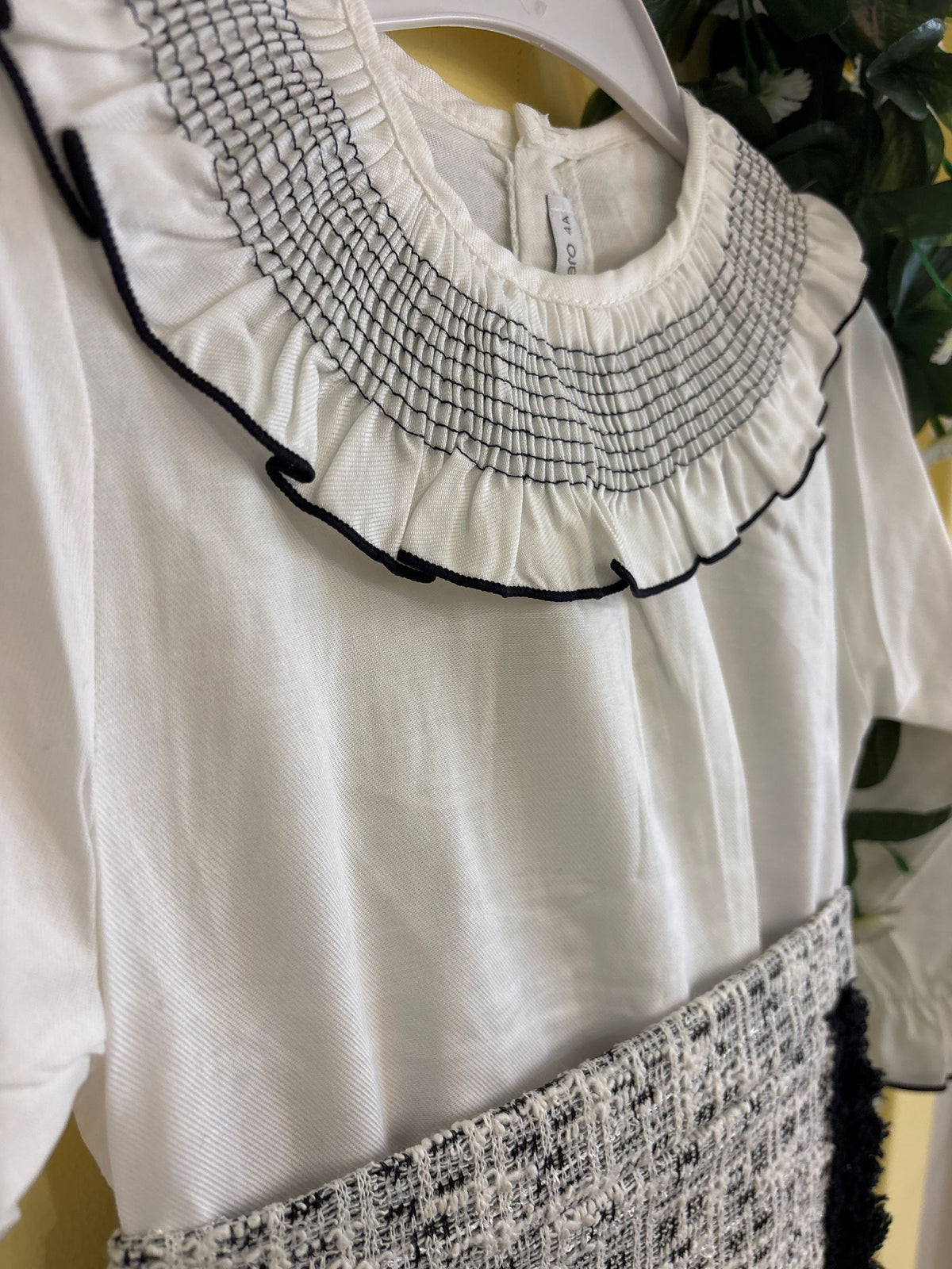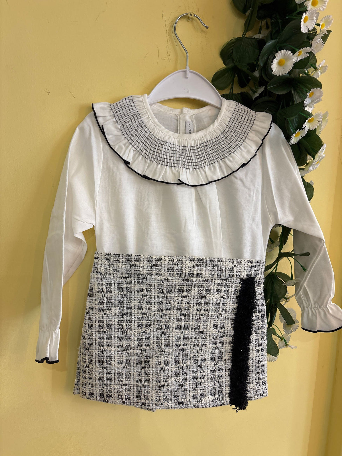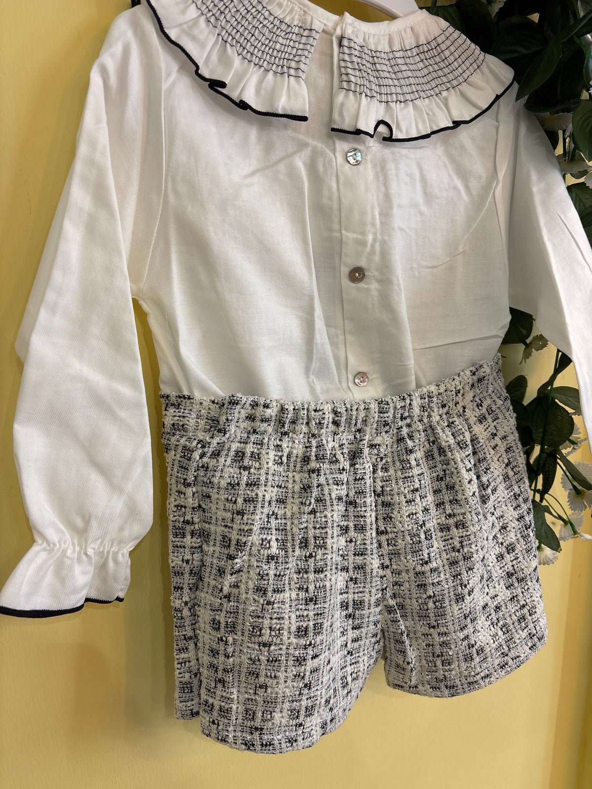 completo con camicia con collo tondocon punto smock bordato in nero per richiamare lo short a cuiè abbinata che fa un effetto finta gonna. comodissima ma anche esclusivo per le occasioni anche più esclusive grazie allo short