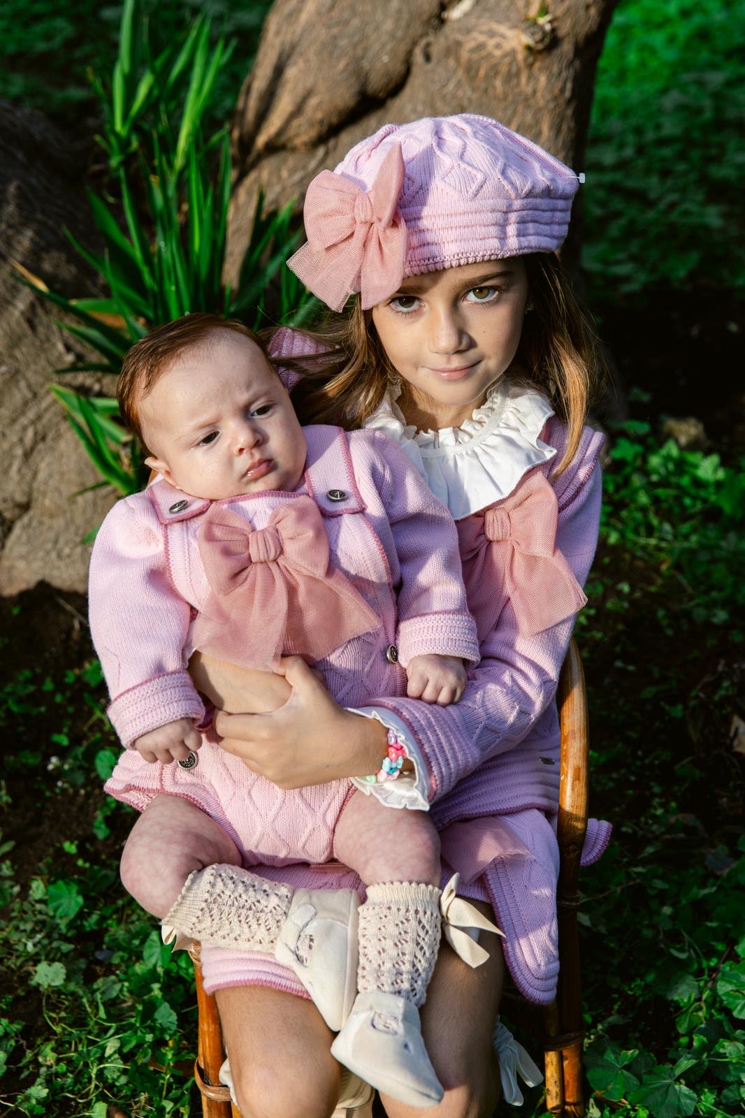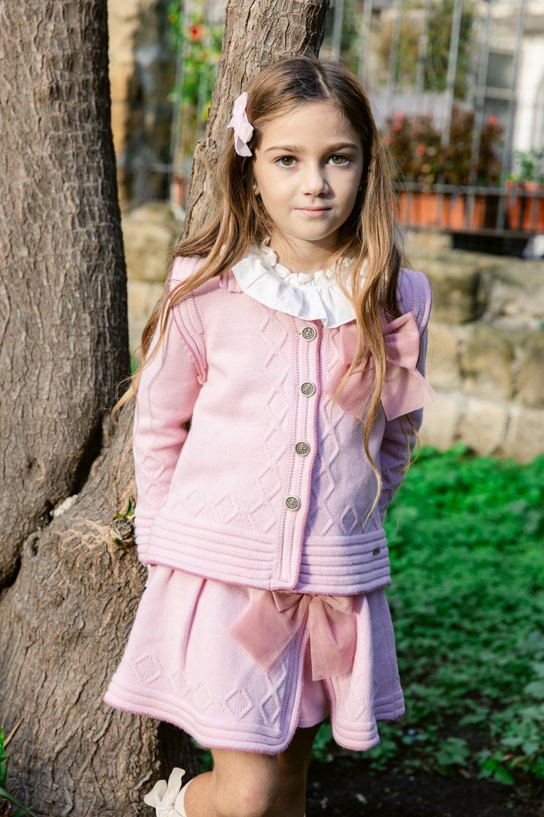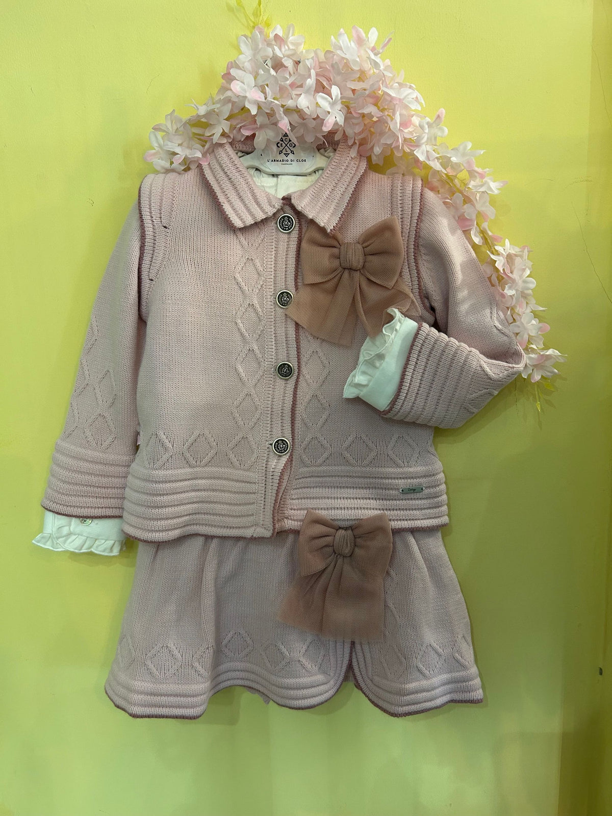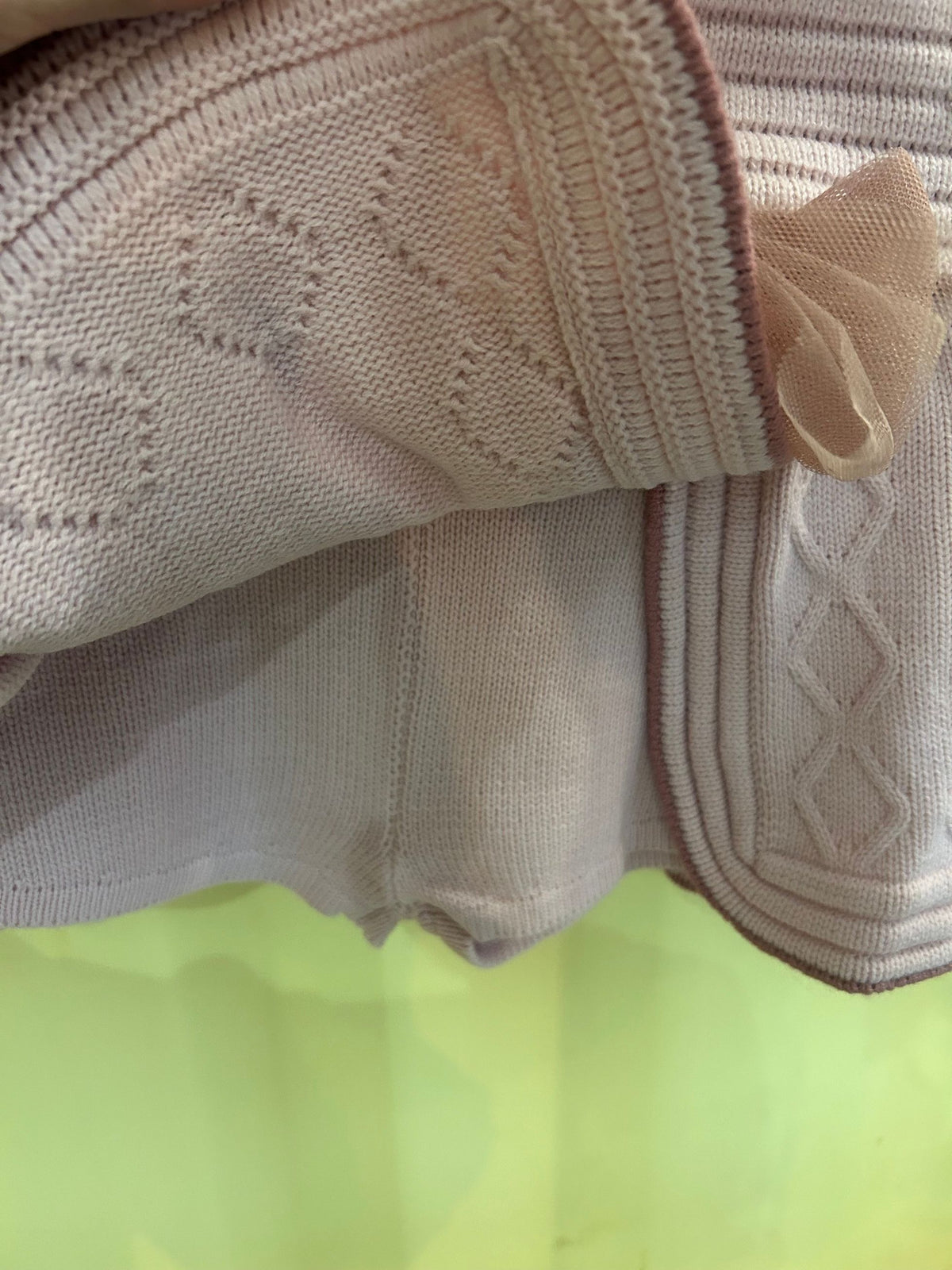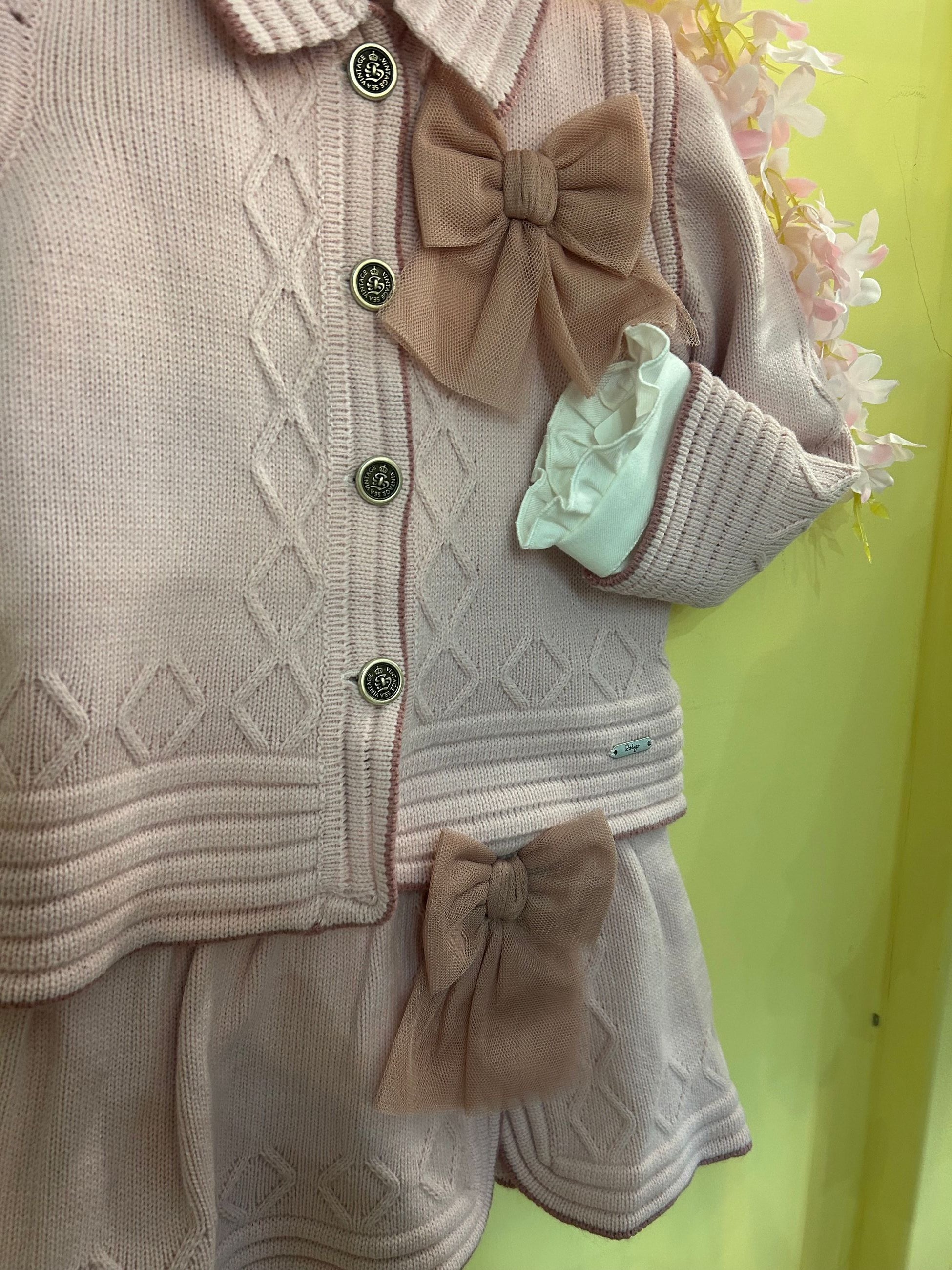 completo in maglia tre pezzi con cardigan sui toni del rosa modello giacca con bottoni effetto vintage e fiocco in tulle, la camiciacon collo rouches porta i bottoni sul retro, lo shorts porta una gonnellina con spacco sul lato ,elastico in vita e fiocco in tulle