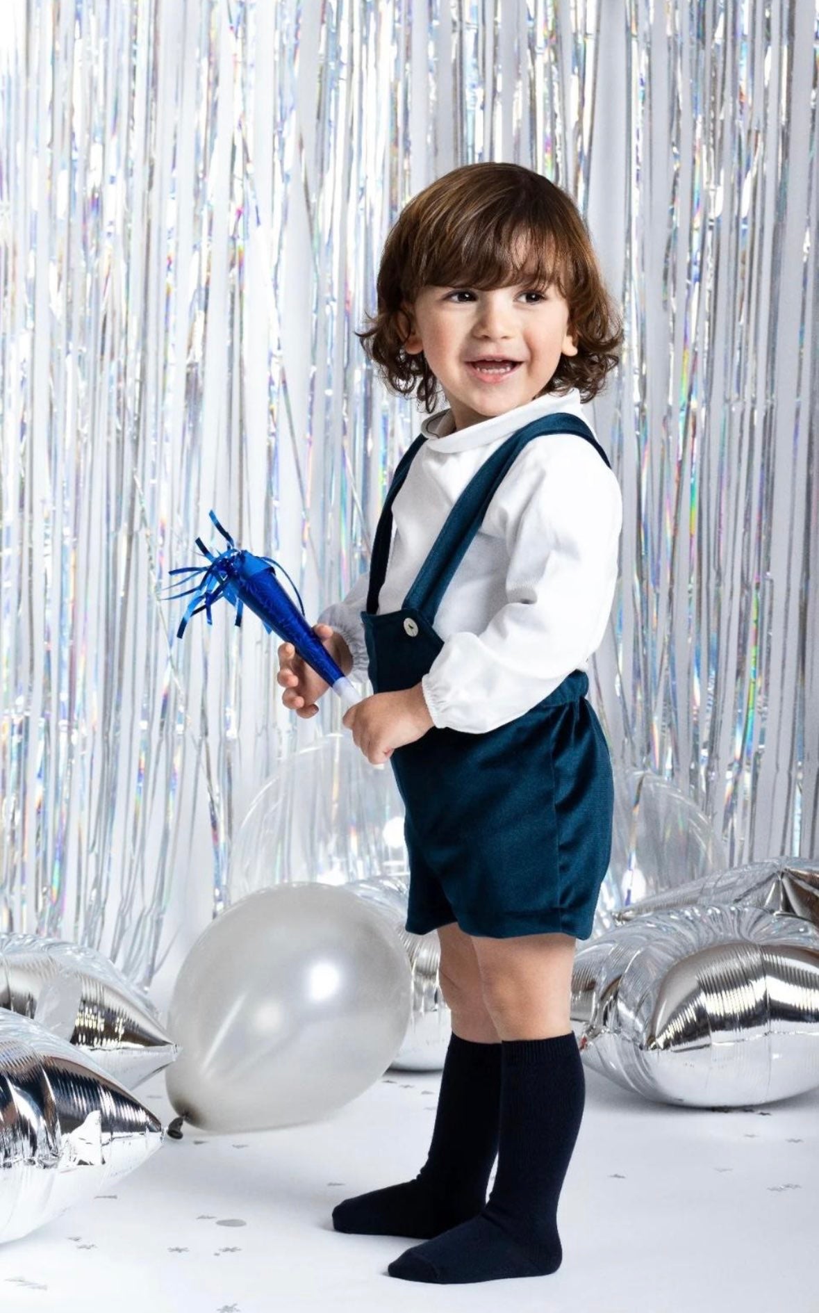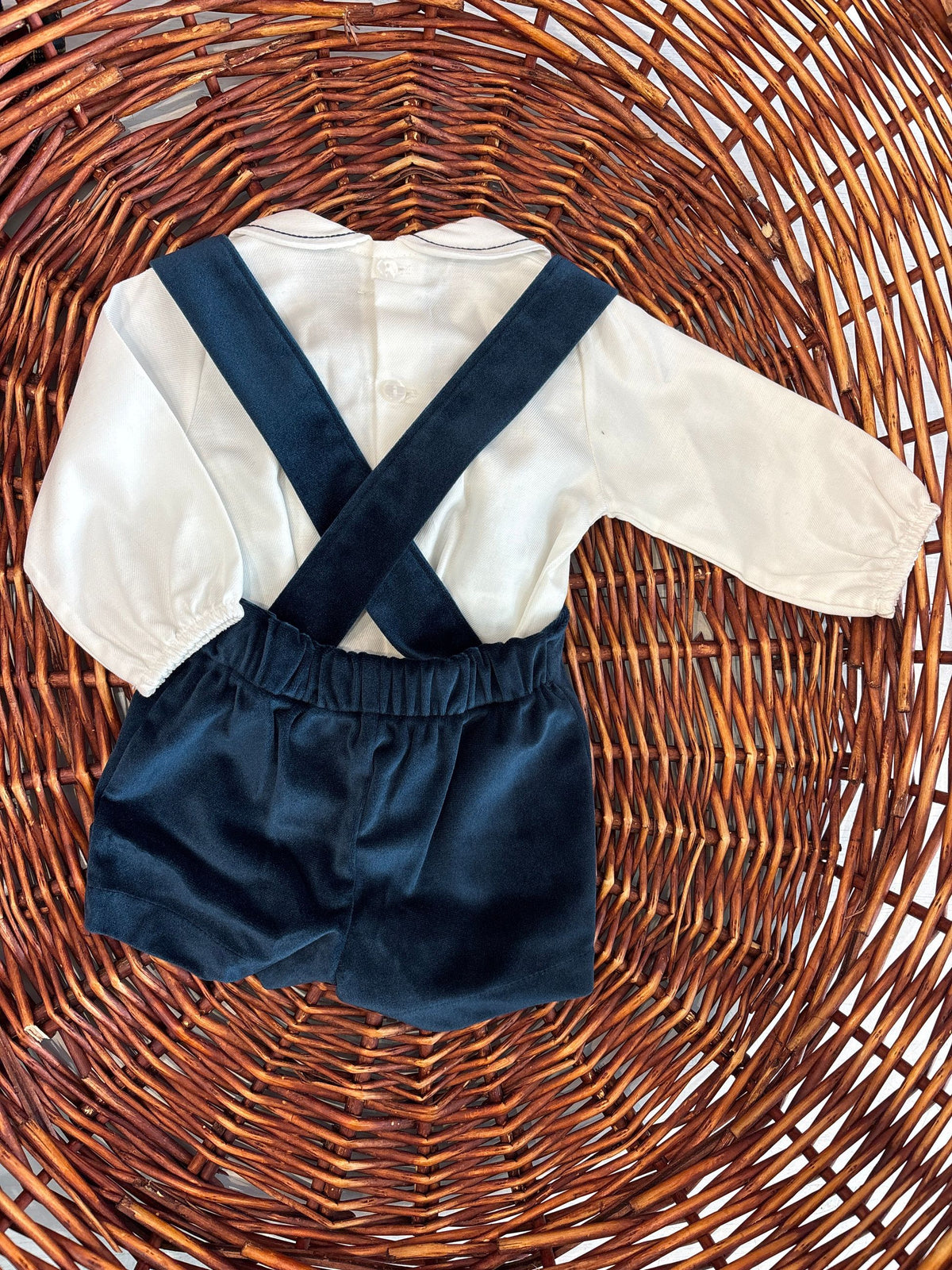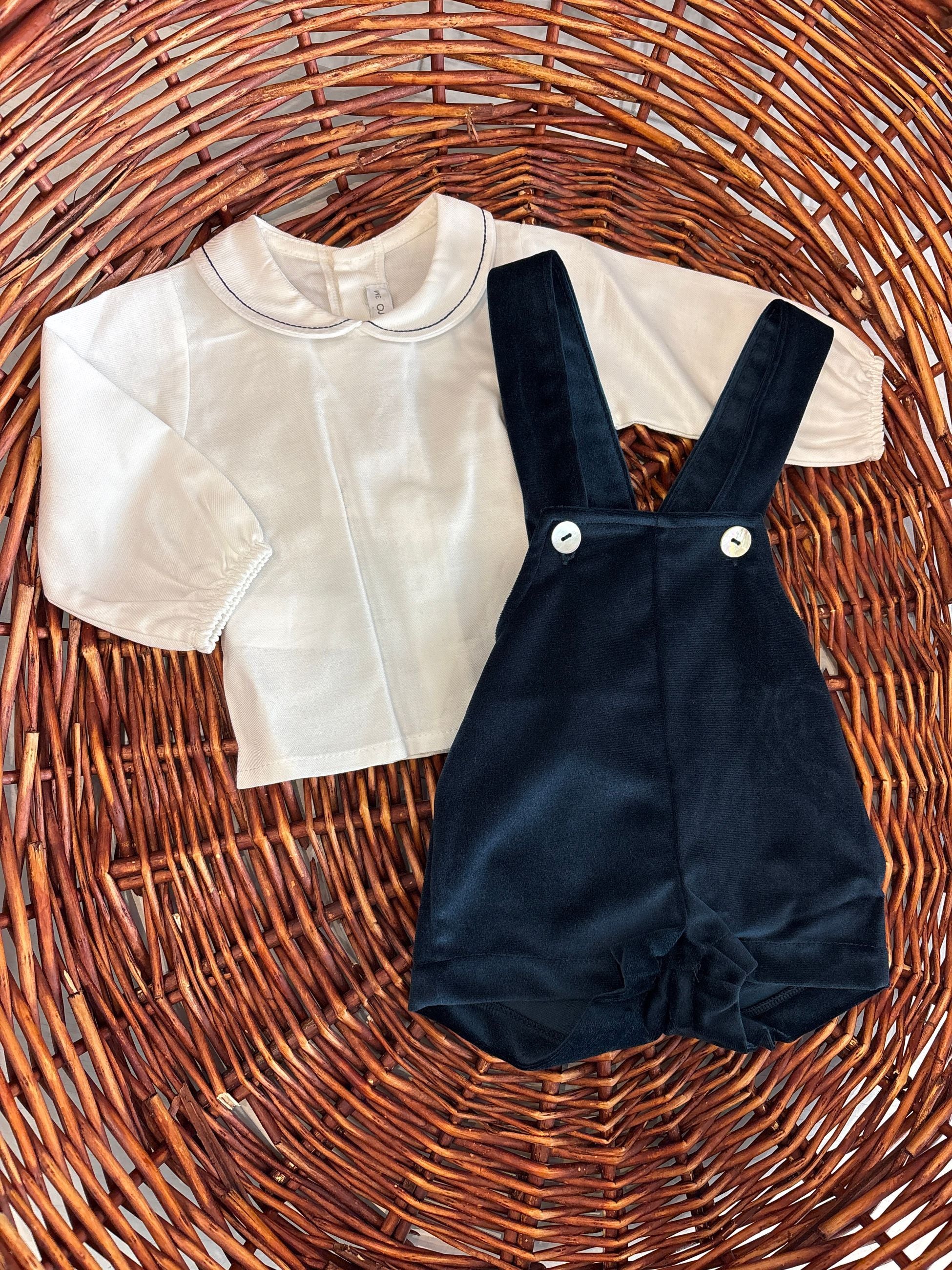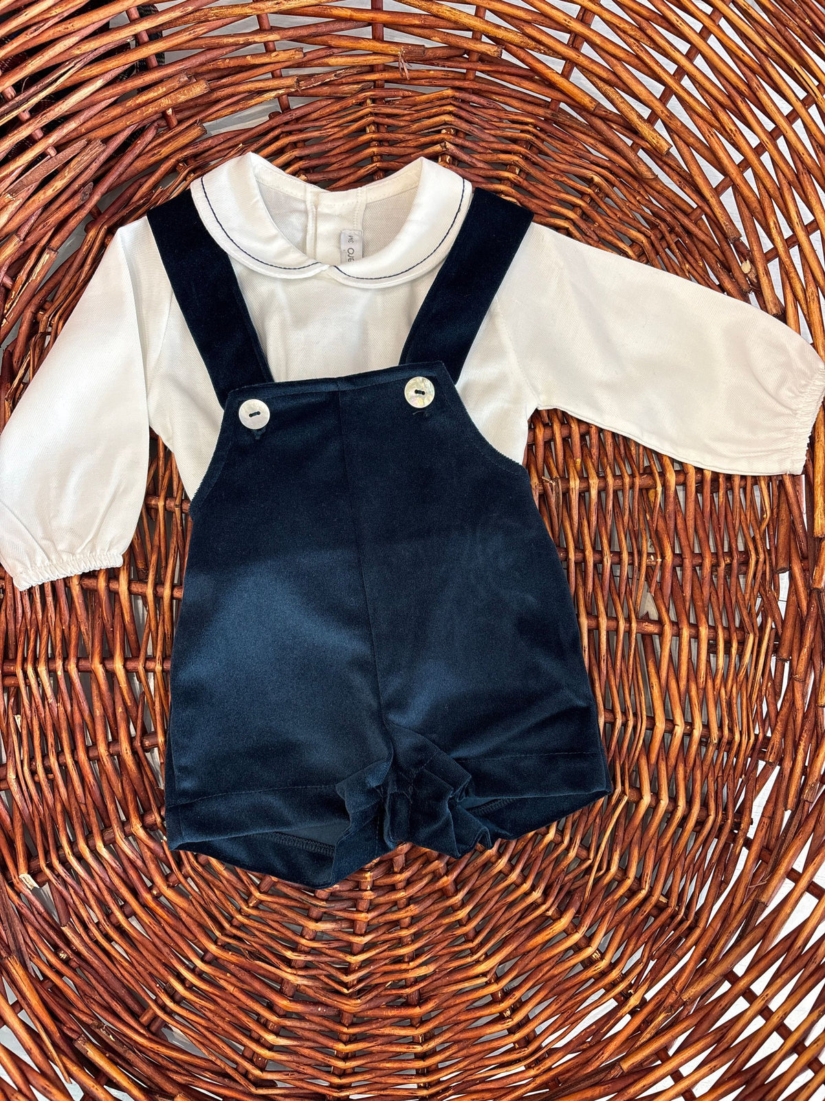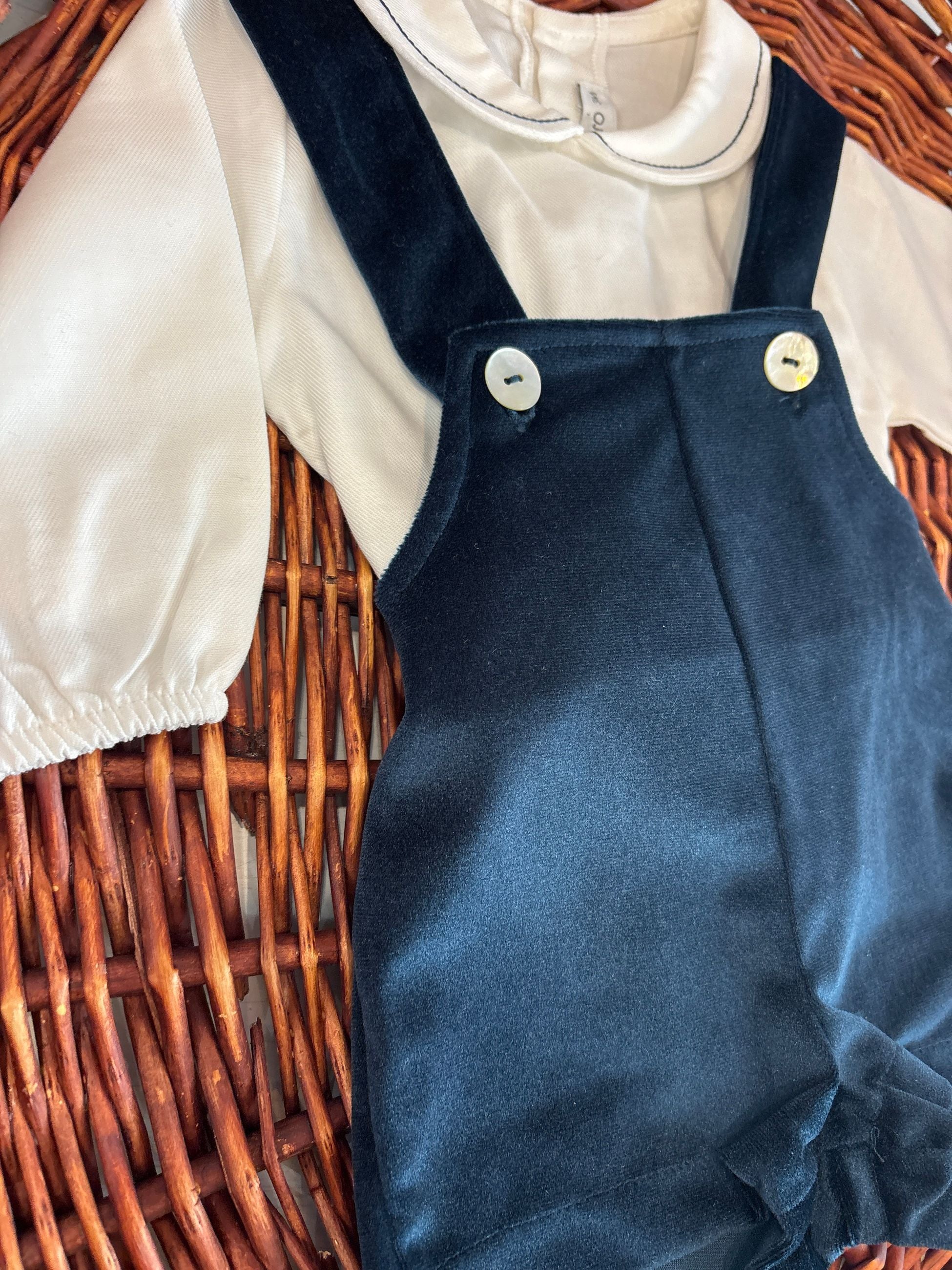 completo con camicia con collo tondo con impunture petrolio che richiamano la salopette in morbidissimo velluto con bretella regolabile