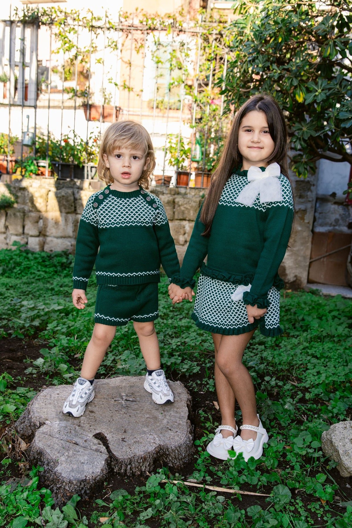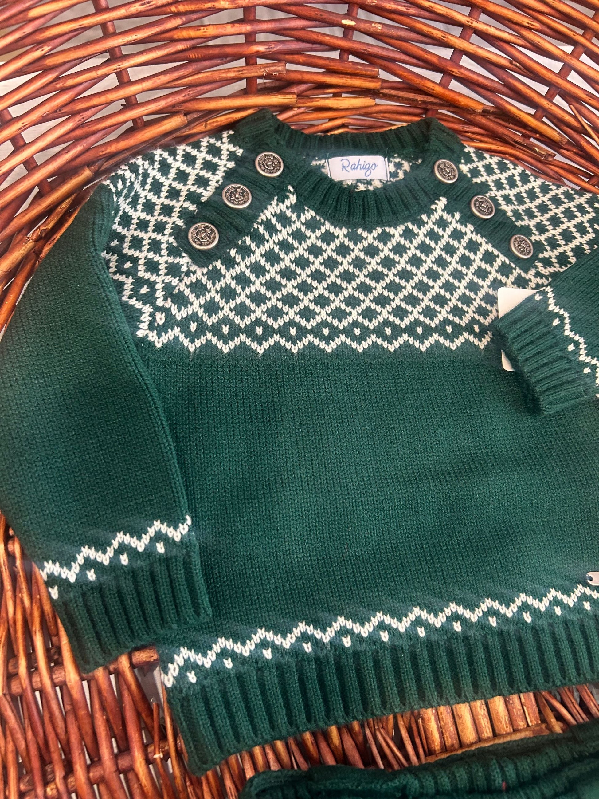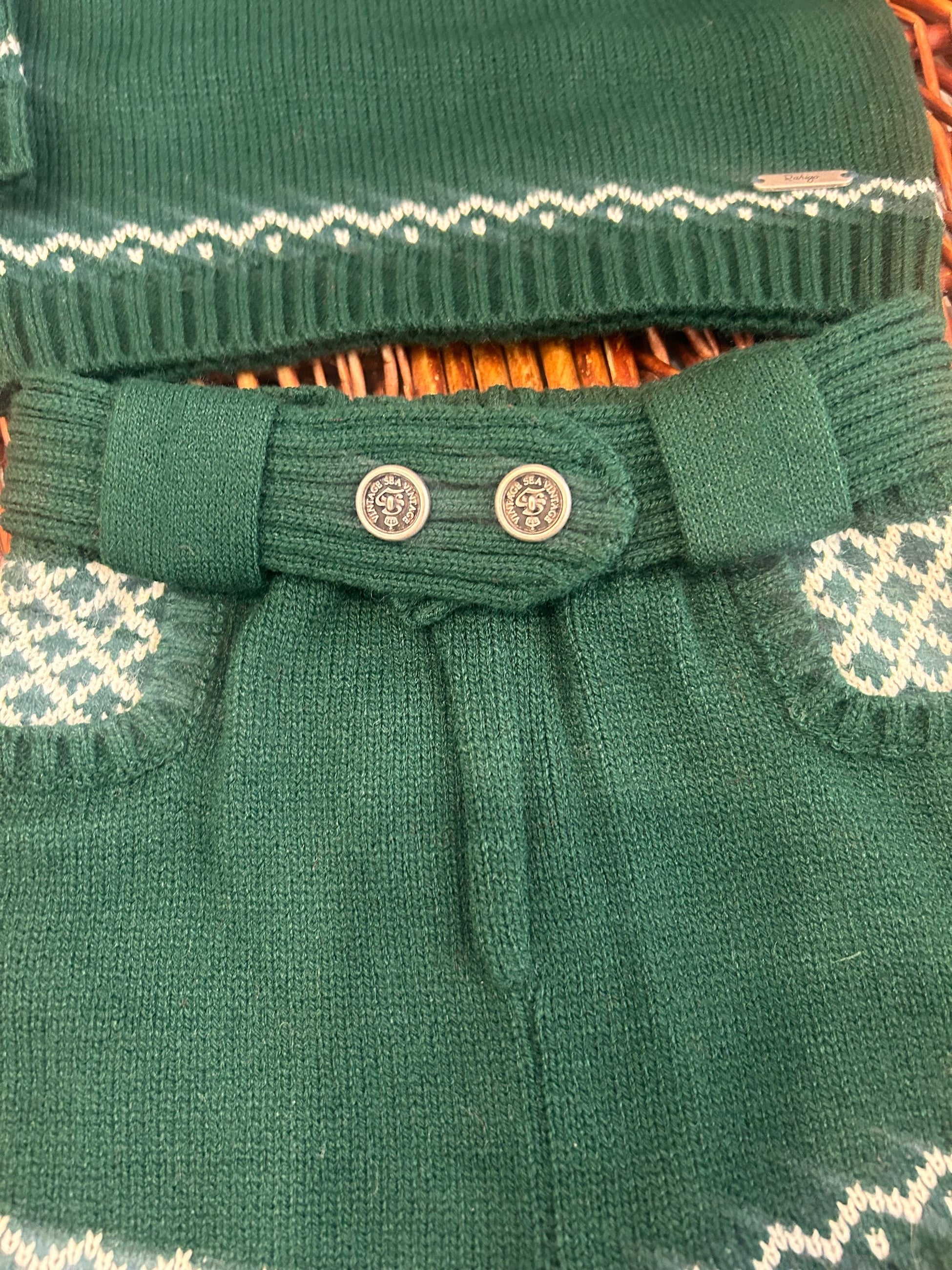 completo in maglia bicoloore verde con intarsi bianchi,il maglioncino porta i bottoni sul laterale sinistro che permettono un ottima vestibilita e il leggins risulta praticoe chic ,un completo perfetto per le giornate piu fredde