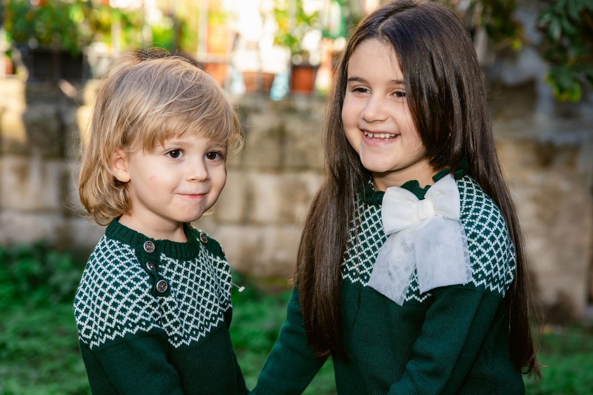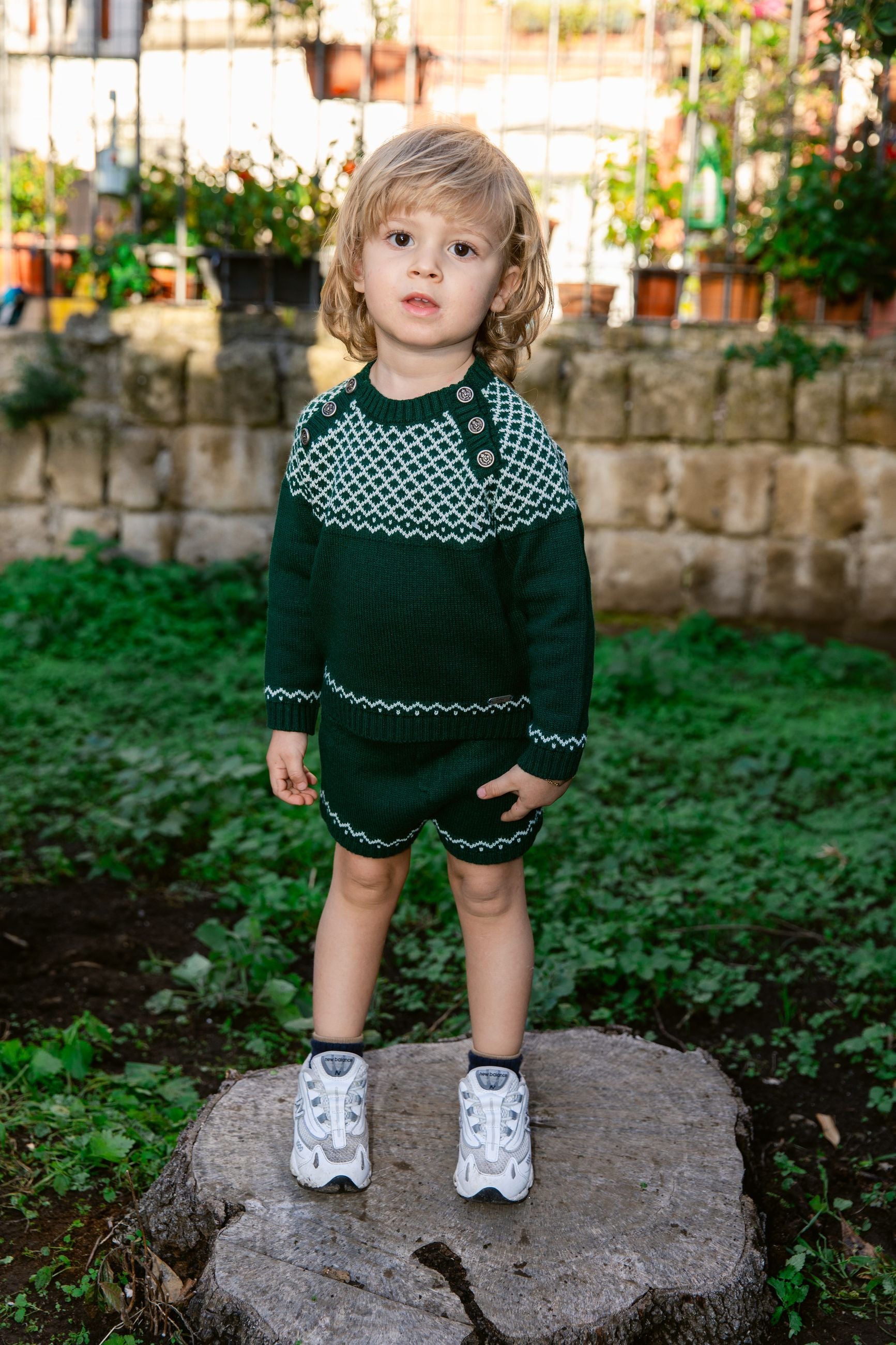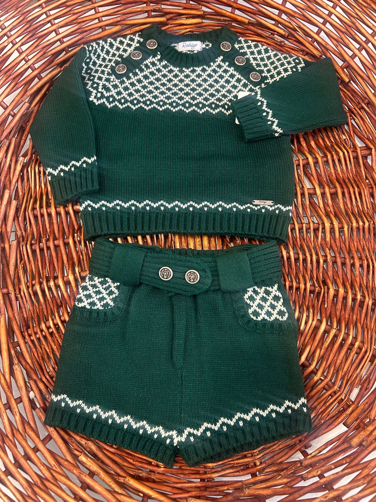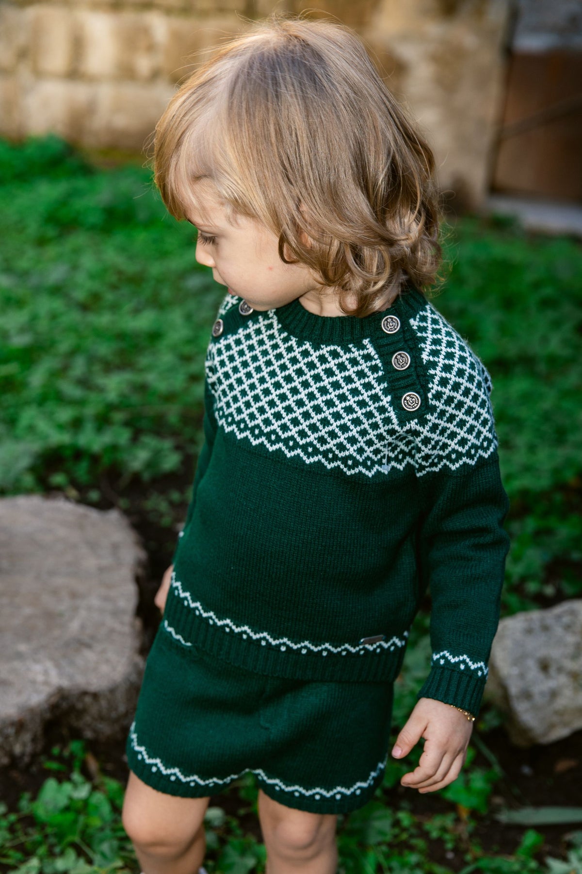 completo in maglia bicoloore verde con intarsi bianchi,il maglioncino porta i bottoni sul laterale sinistro che permettono un ottima vestibilita e il leggins risulta praticoe chic ,un completo perfetto per le giornate piu fredde