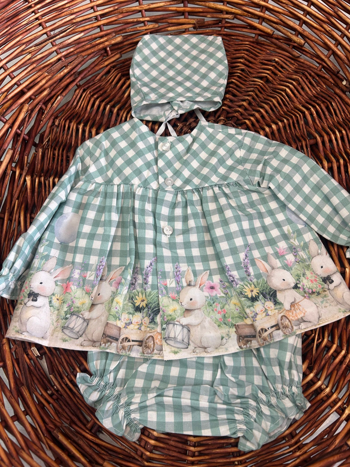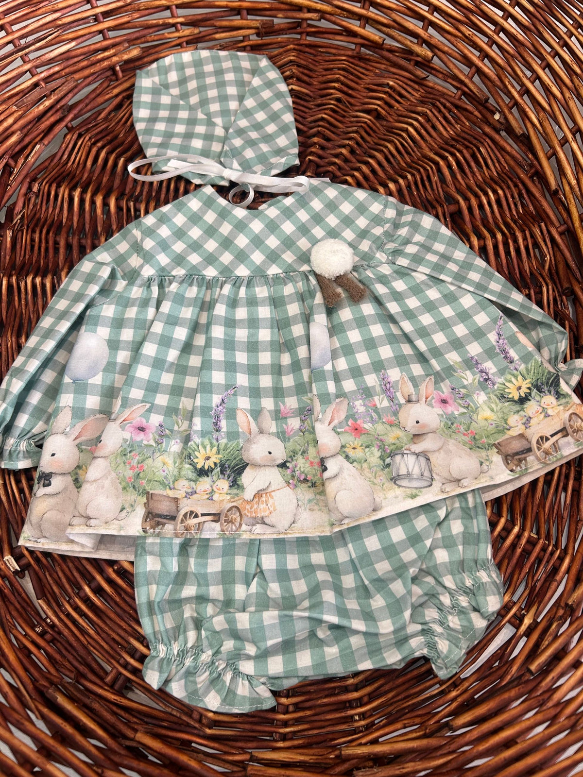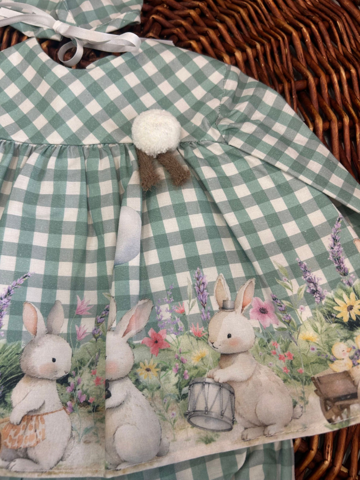 abito girocollo fantasia vichy con coniglietti stampati sul fondo e pon pon bianco laterale, porta coulotte e cuffietta della stessa fantasia per completare un look perfetto anche per il periodo pasquale