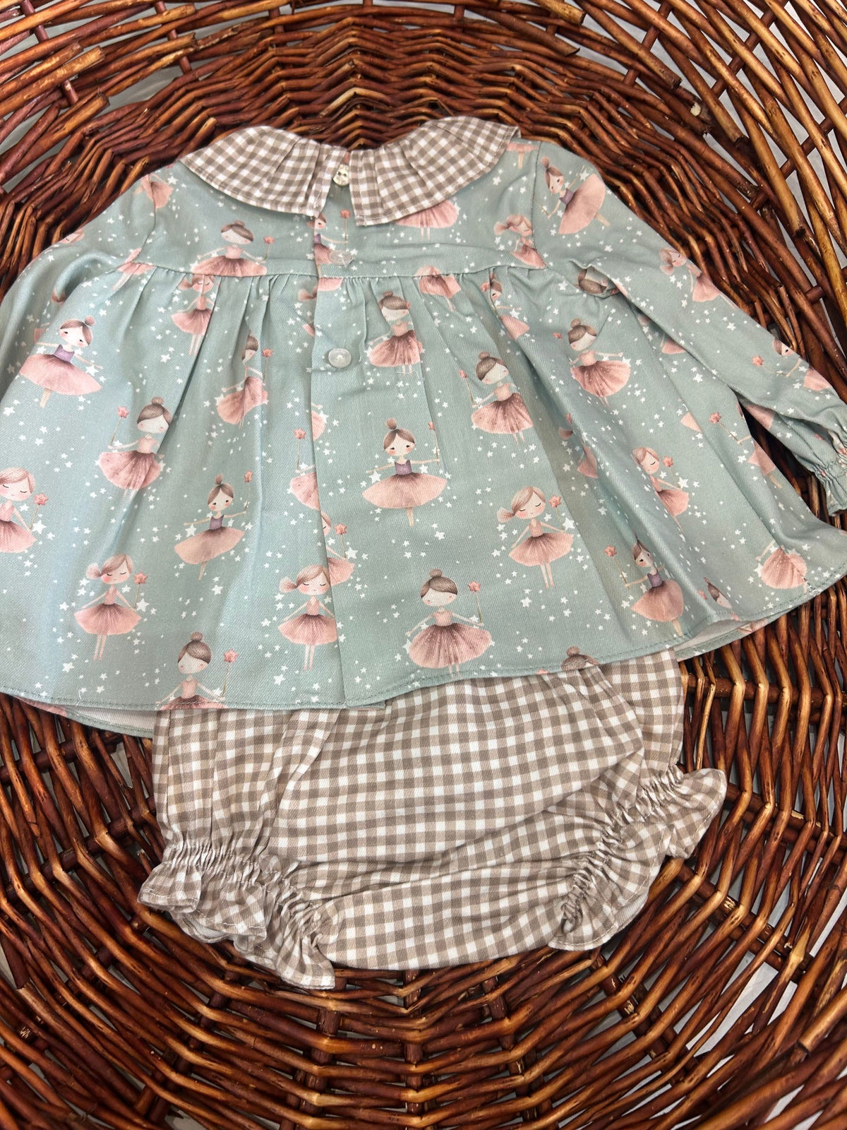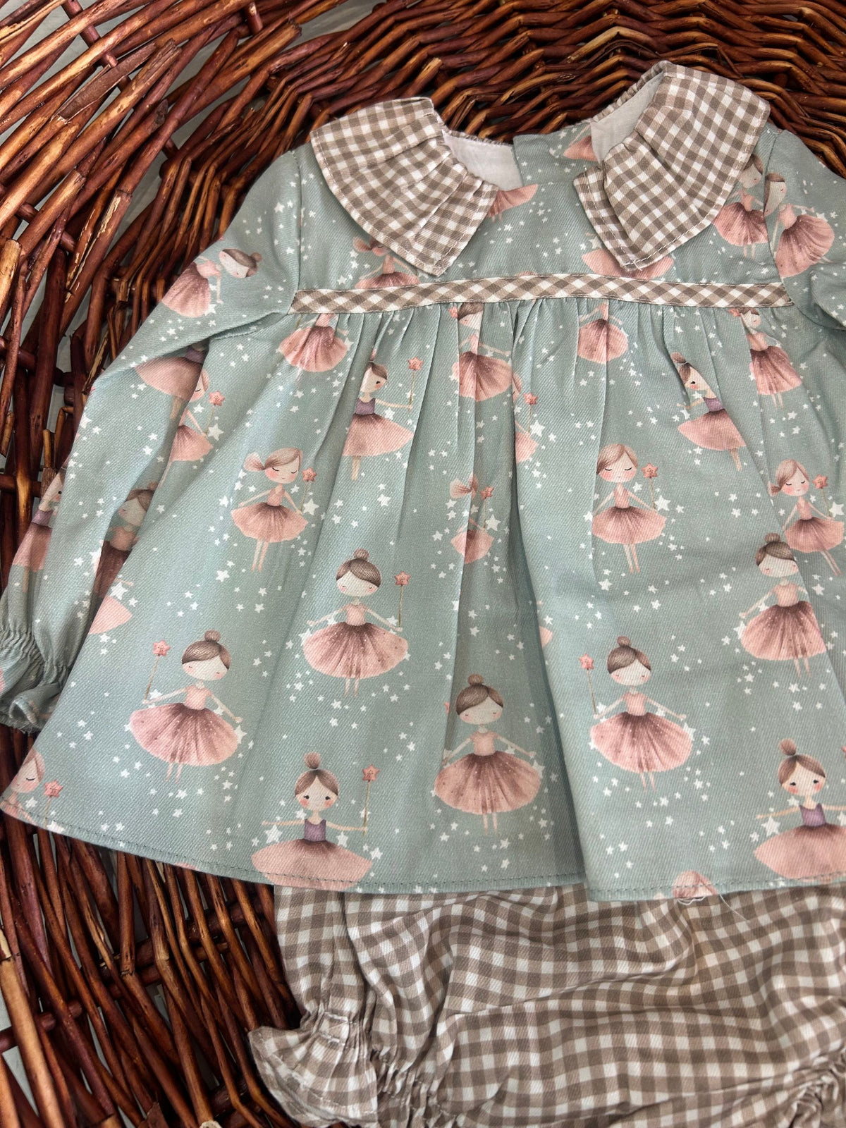 abito scampanato in cotone fantasia con ballerine e bordo a quadri marrone, collo rouches a quadri che richiama la coulotte