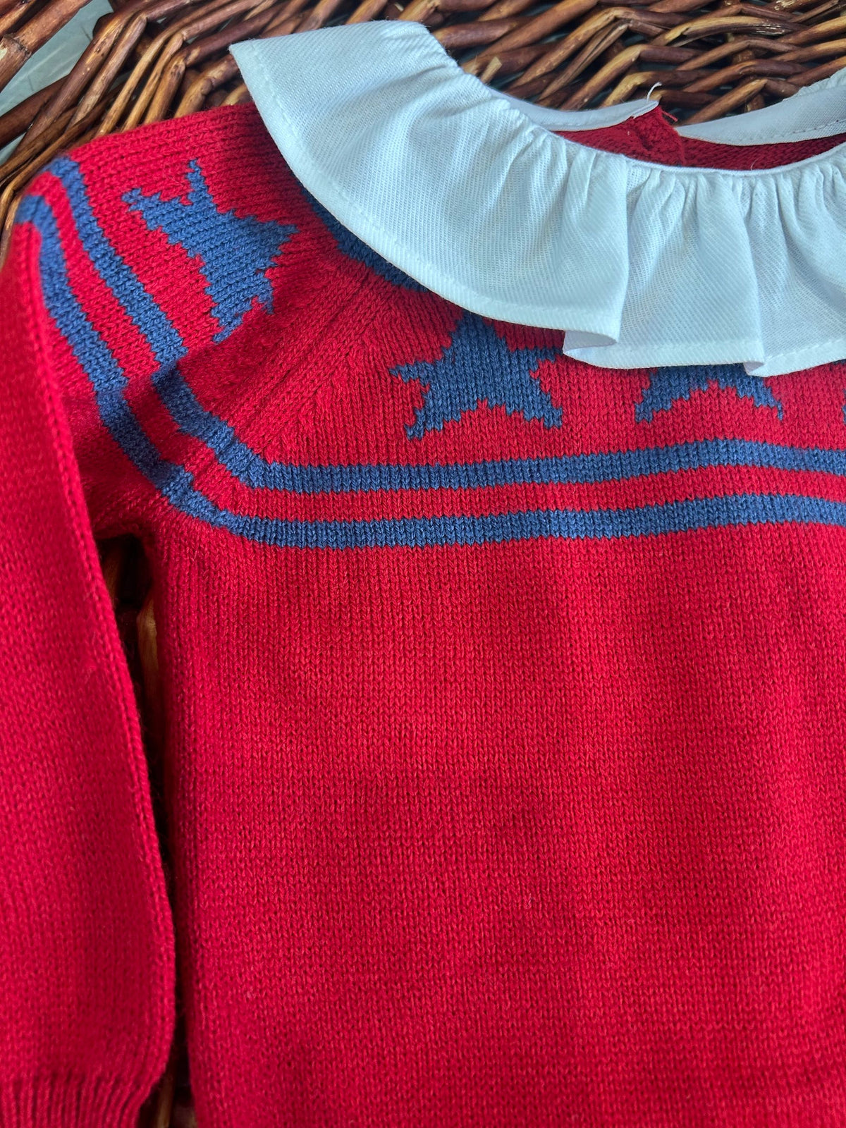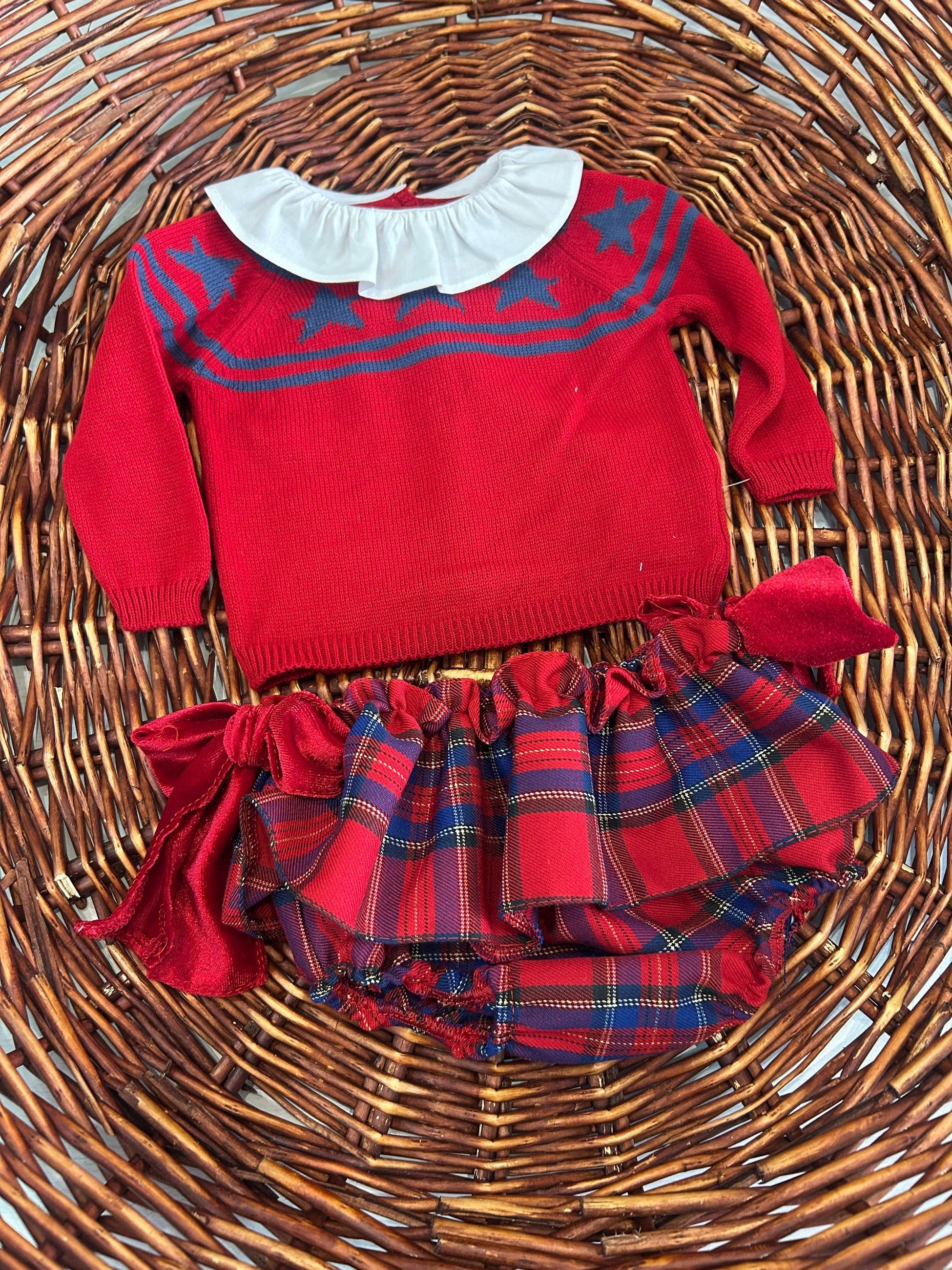 completo maglioncino rosso con collo rouches bianco e stelle blu ricamate abbinato ad una coulotte tartan con rouches effetto gonnellina