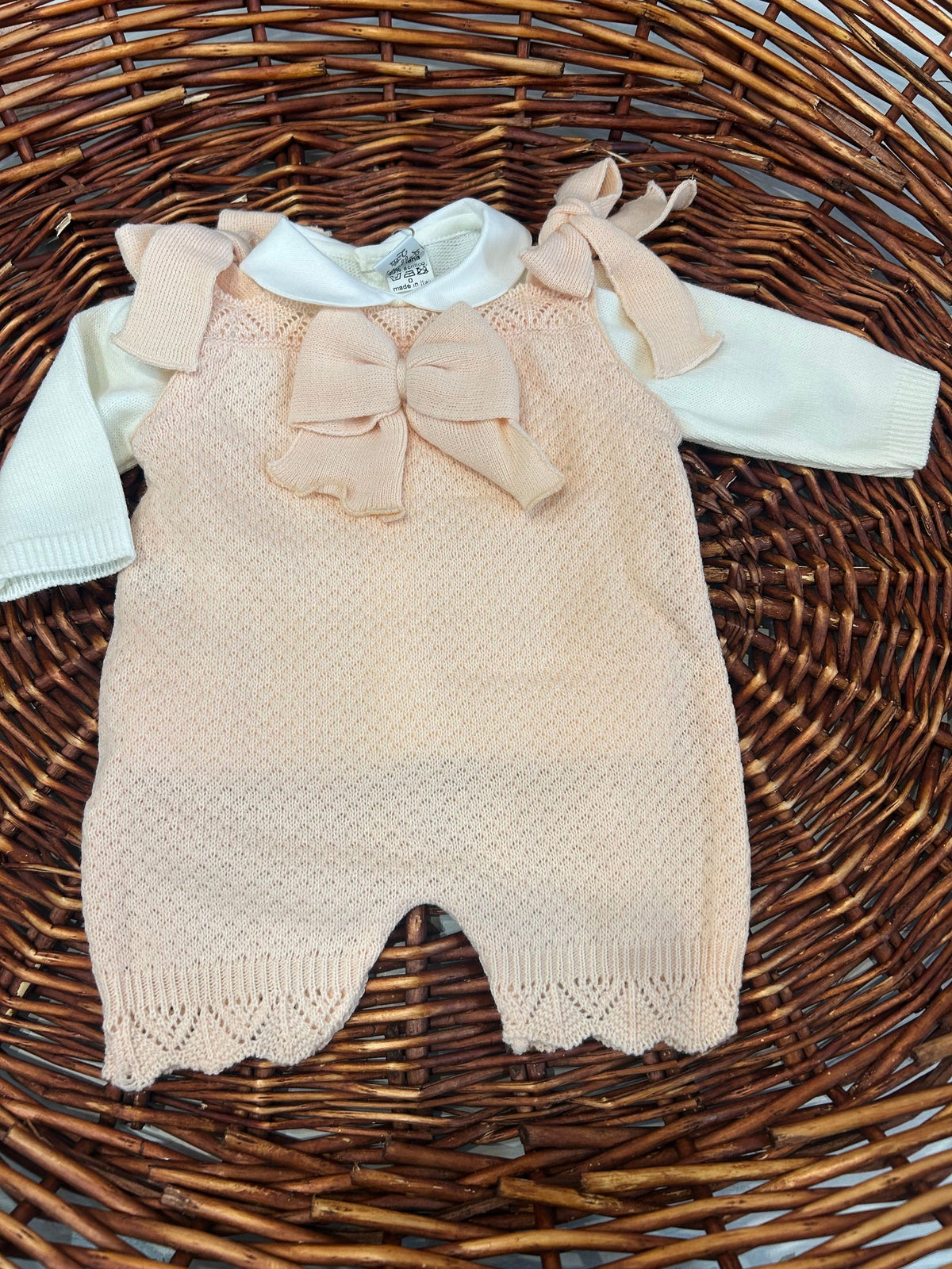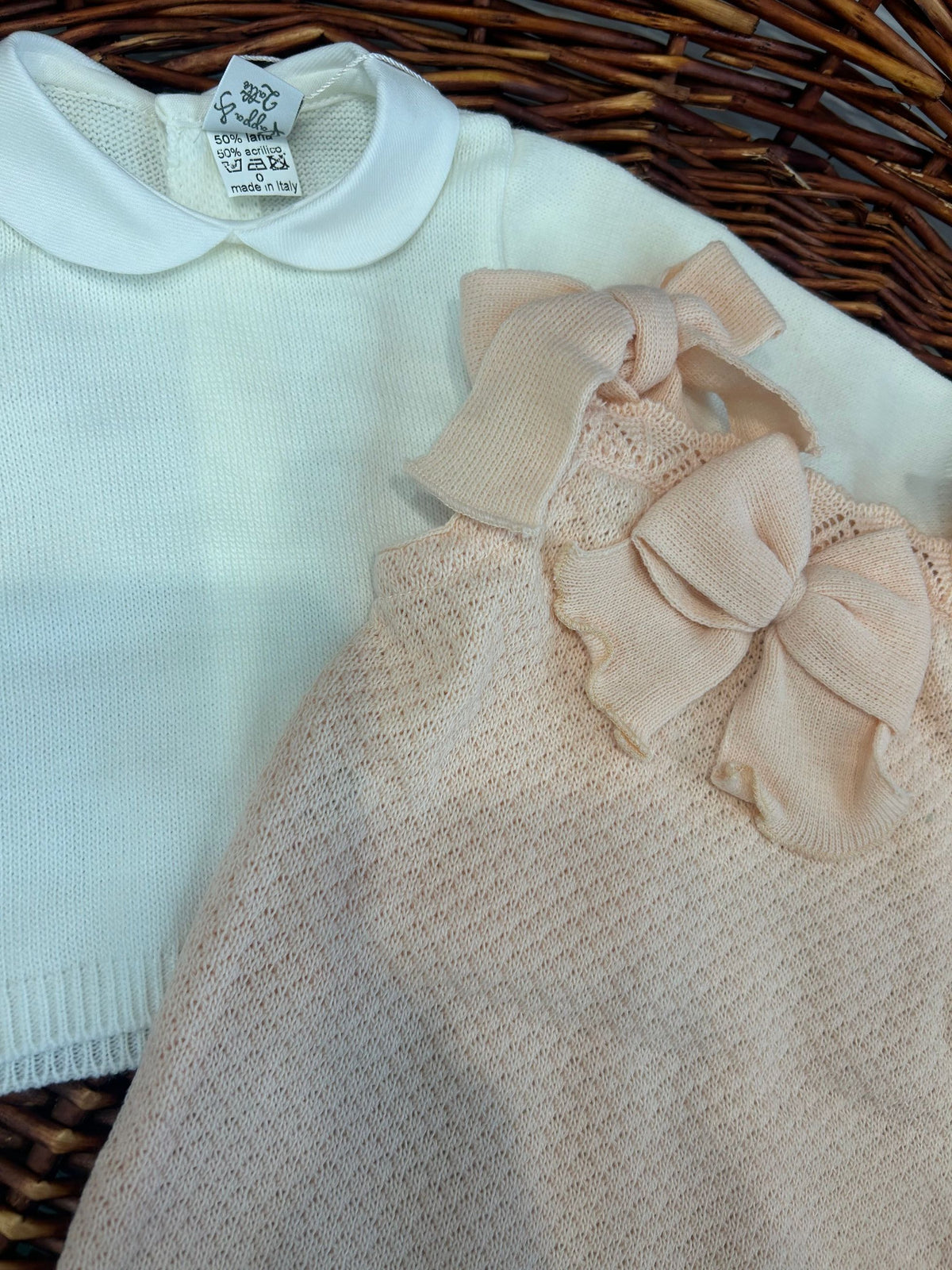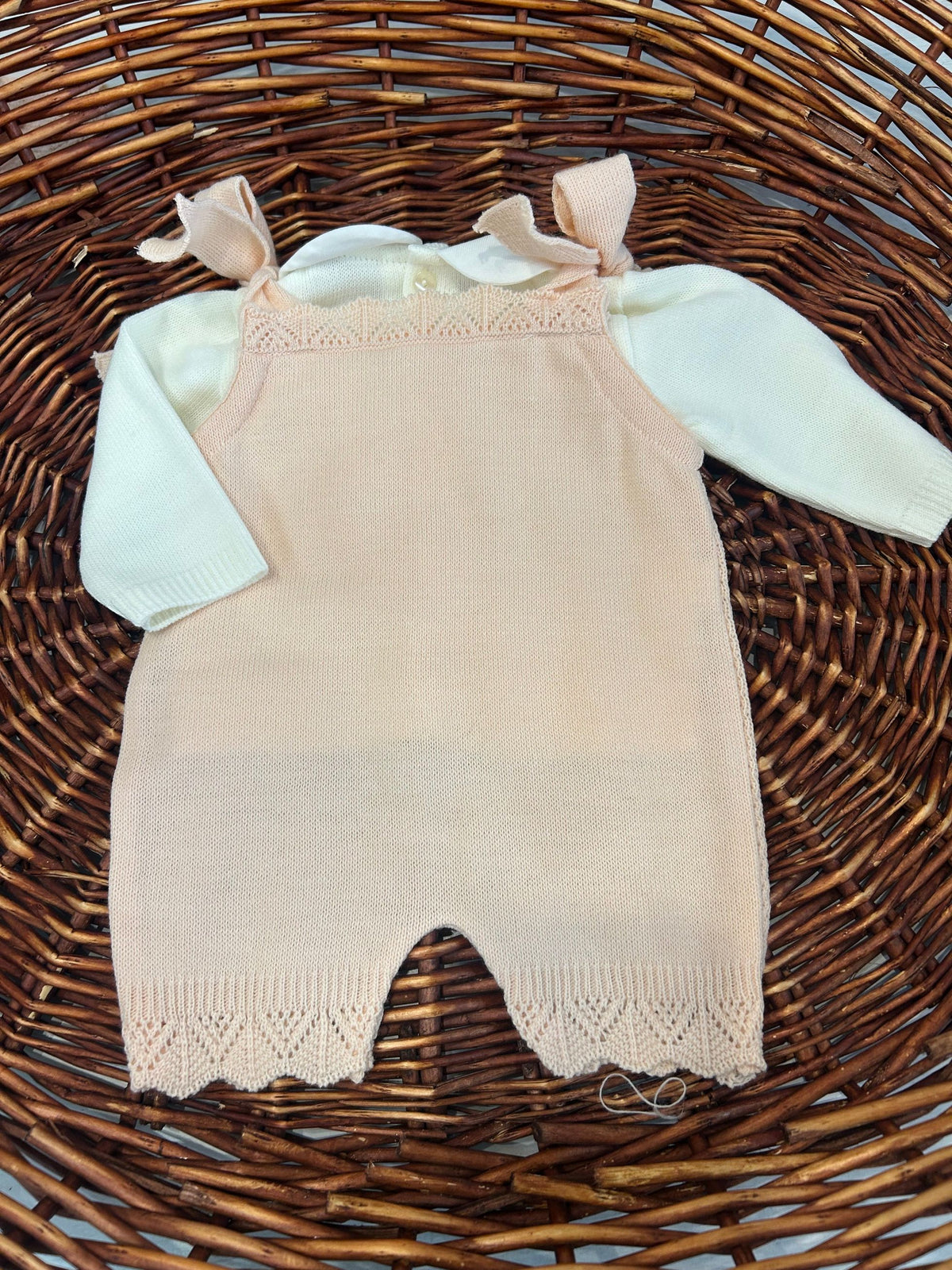 completo in calda e morbida lana ,composto da pagliaccettoin bouclè con bretelle regolabili e maglia a contrasto con colletto in piquet