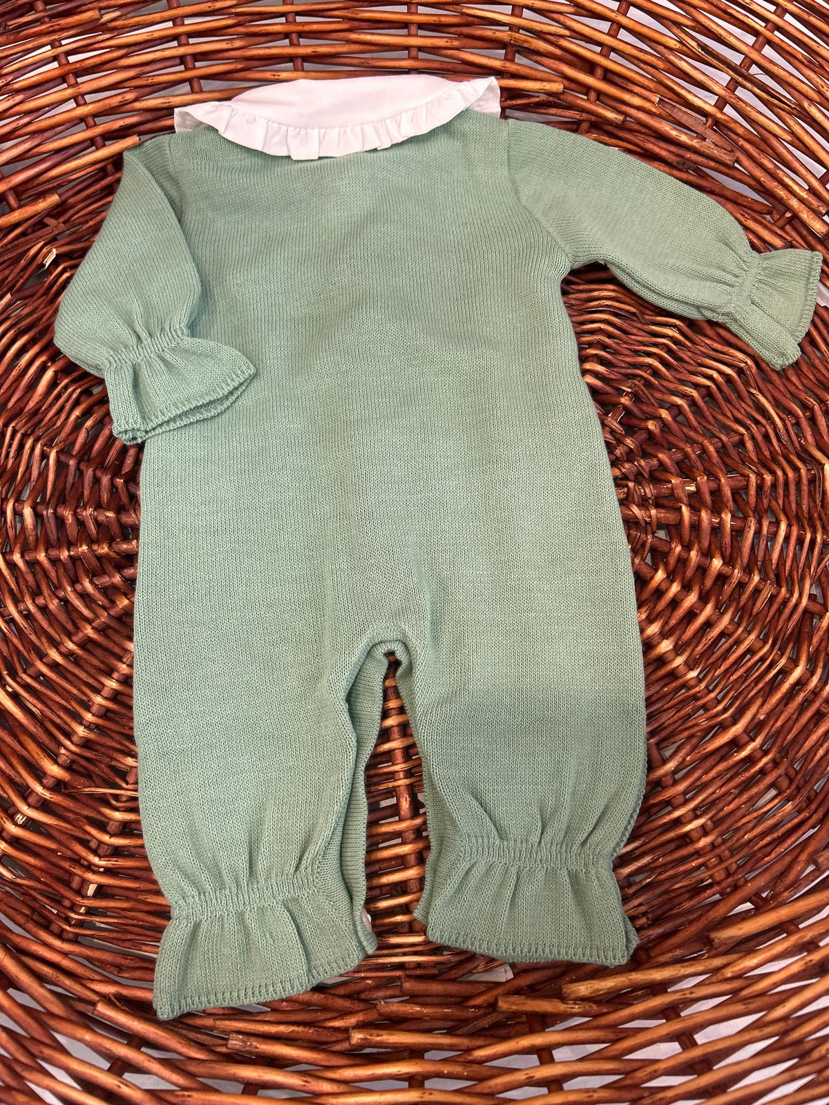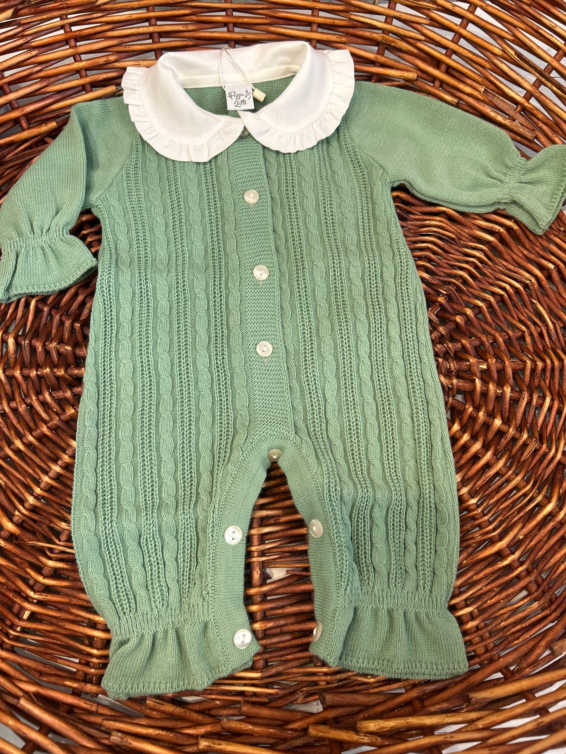 tutina in calda e morbida lana lavorata a trecce con bottoni avantiin madreperla e colletto in piquet bianco con rouches,l'apertira fino al fondo risulta comoda e i morbidi elastici alle estremità rendono il capo ancora piu chic
