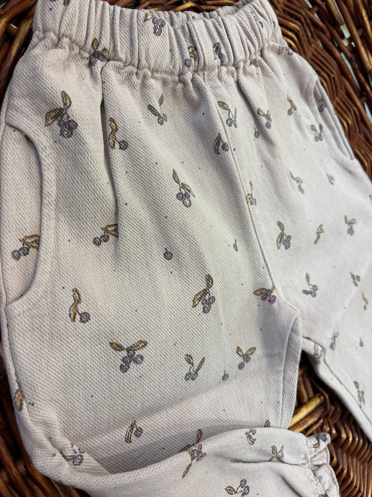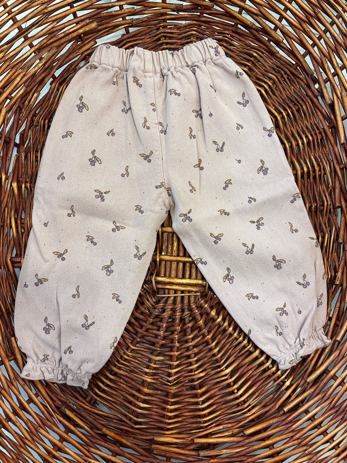 pantalone in denim fondo cipria con disegni fantasia, elastico in vita e tasche laterali