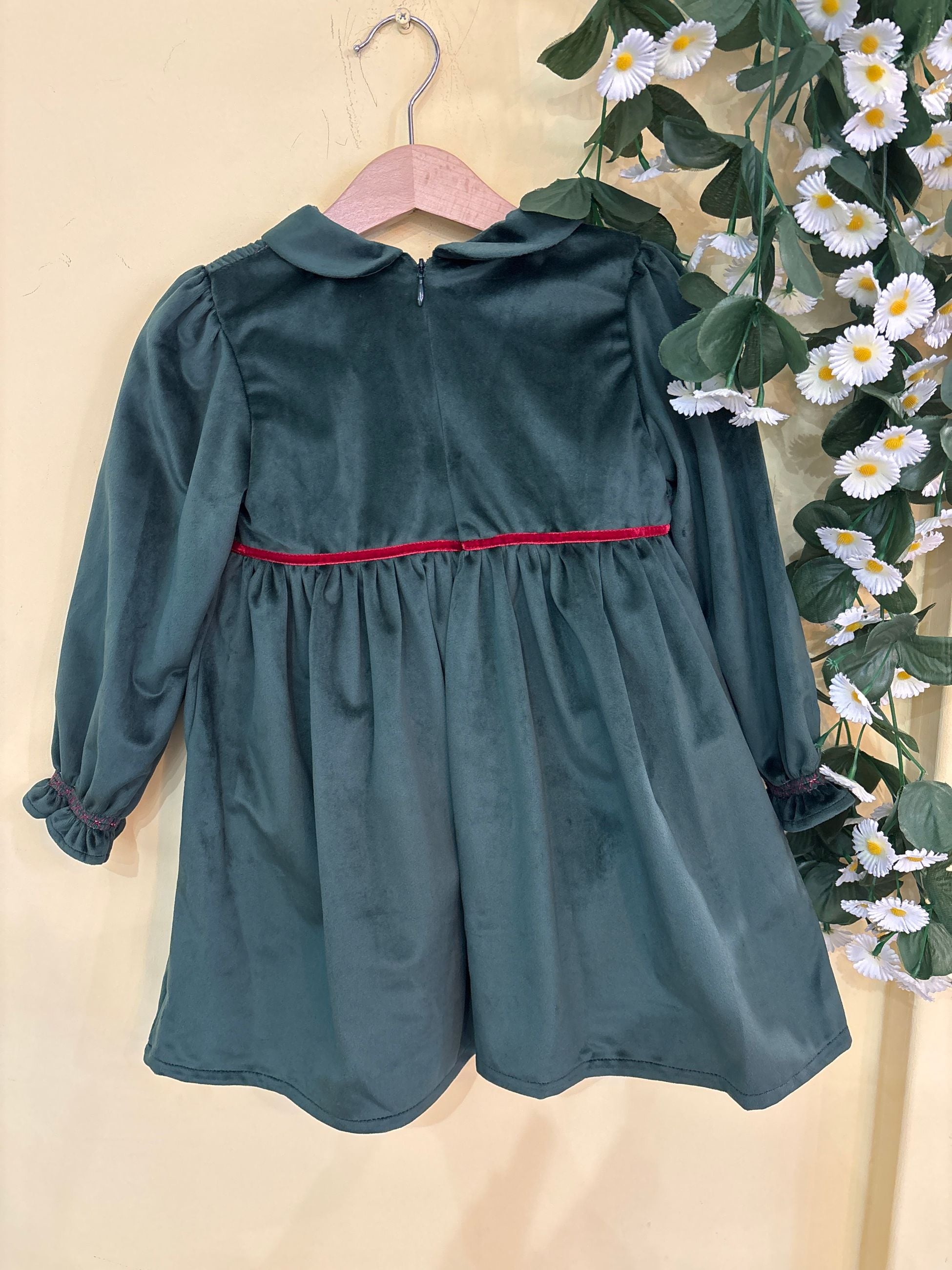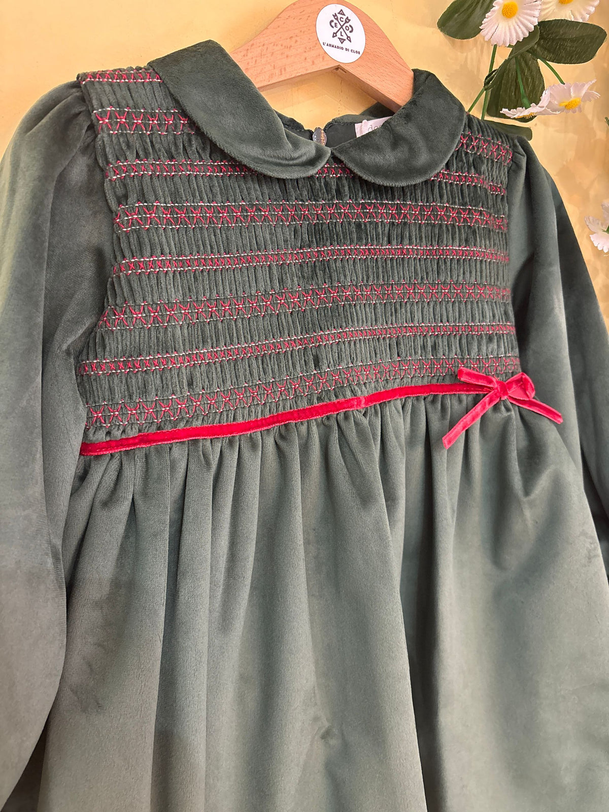 abito in velluto liscio , manica lunga e collo camicia rouches ricamato,l'abito porta una decorazione al petto effetto punto smoke e la zip sul retro