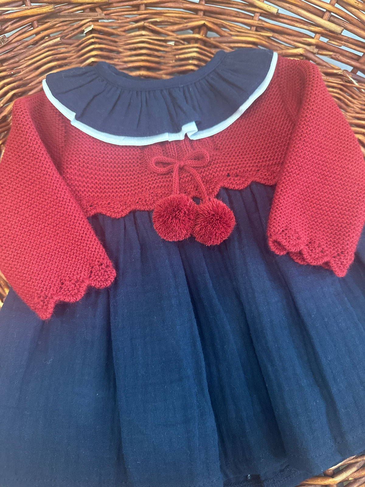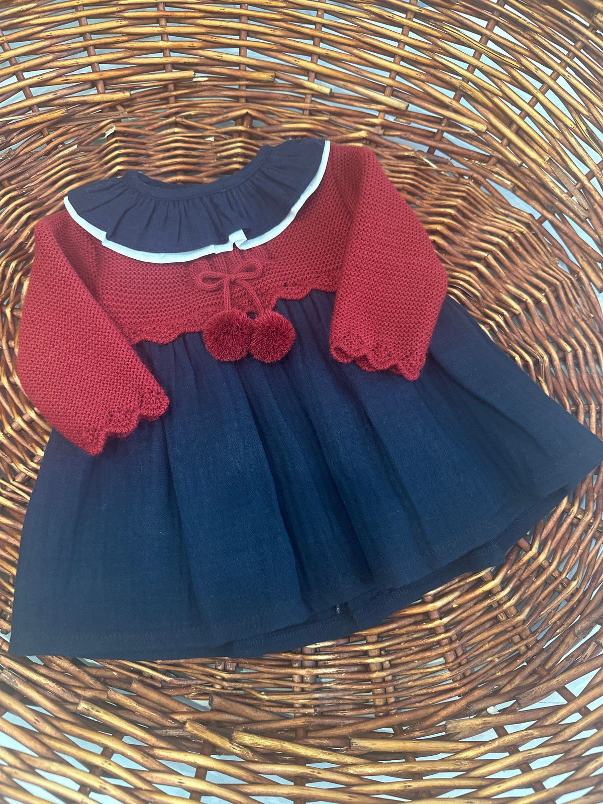abito bicolore blu e bordeaux con corpetto in maglia e decorazione pon pon, ad impreziosire l'abito un colletto rouches in garza,sul retro presenta bottoni trasparenti che permettono l'apertura totale del capo