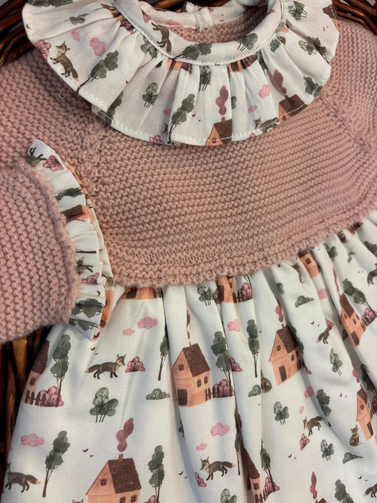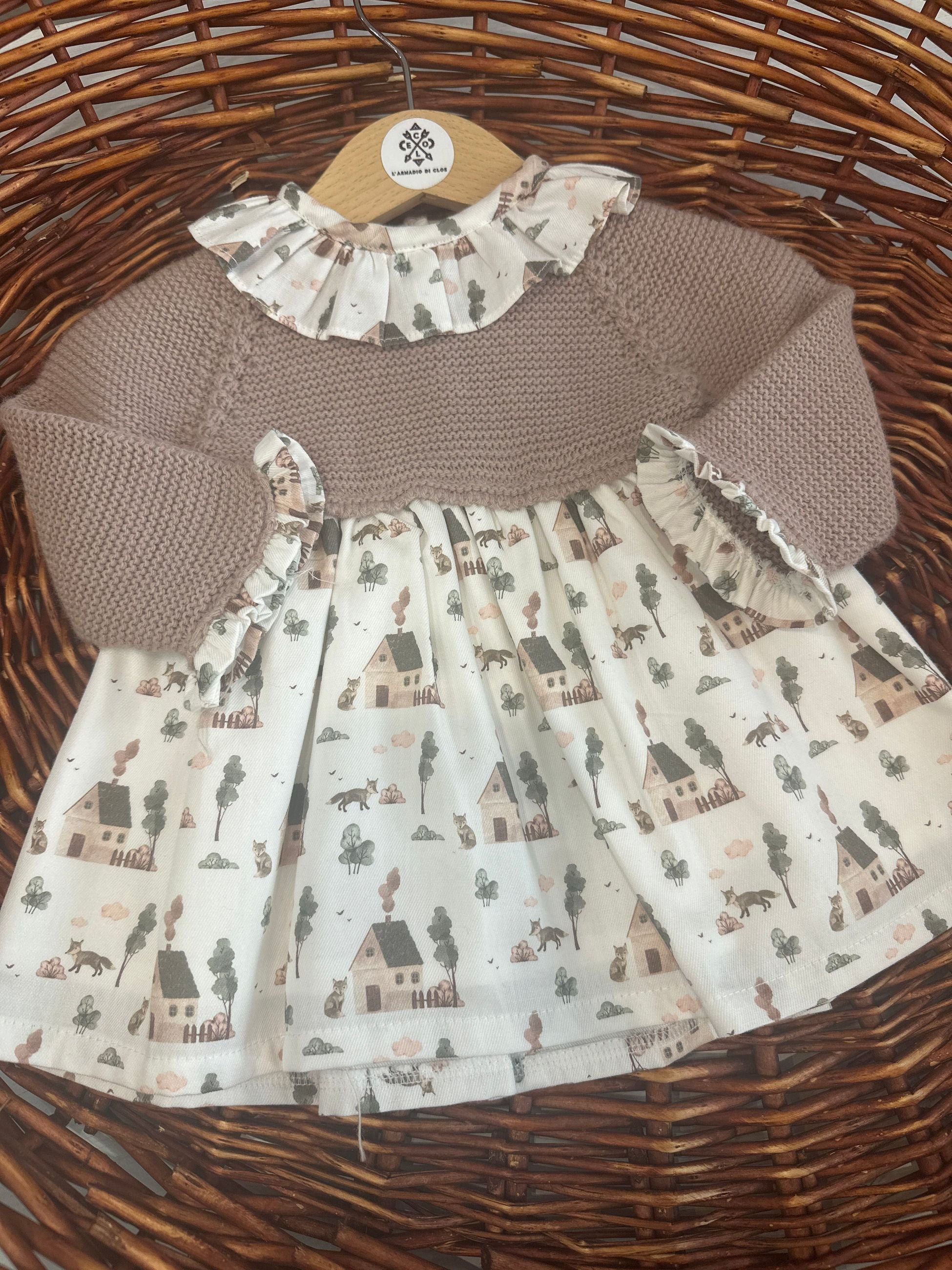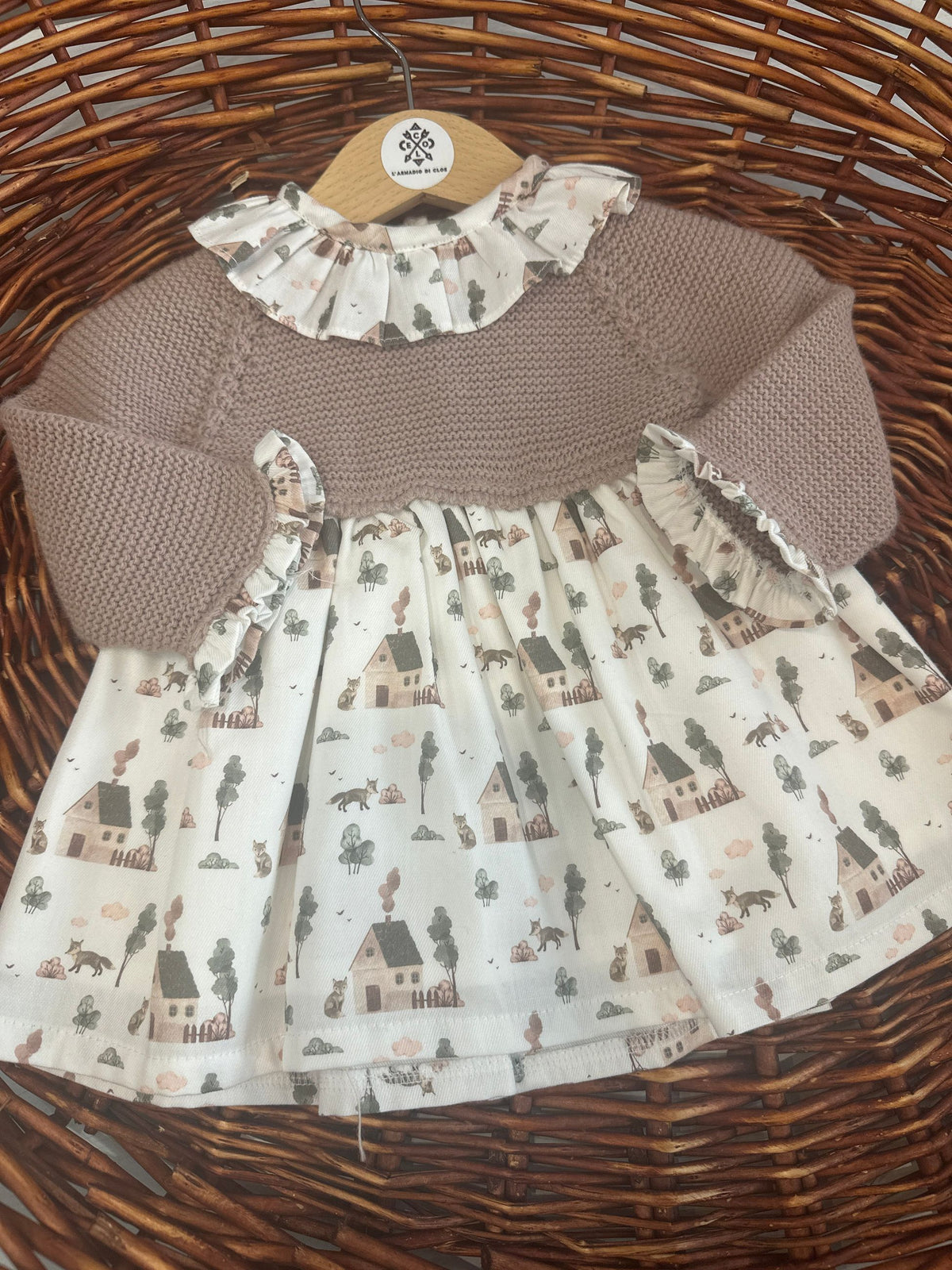 abito con corpetto in maglia e gonna fantasia tema prateria con casette e volpi,ad impreziosire il capo un colletto rouches a contrasto,l'abito presenta i bottoni sul retro per permettere l'apertura totale