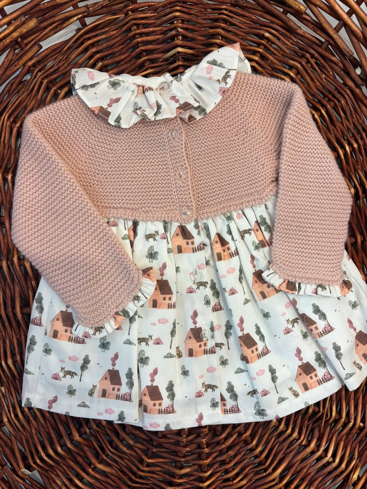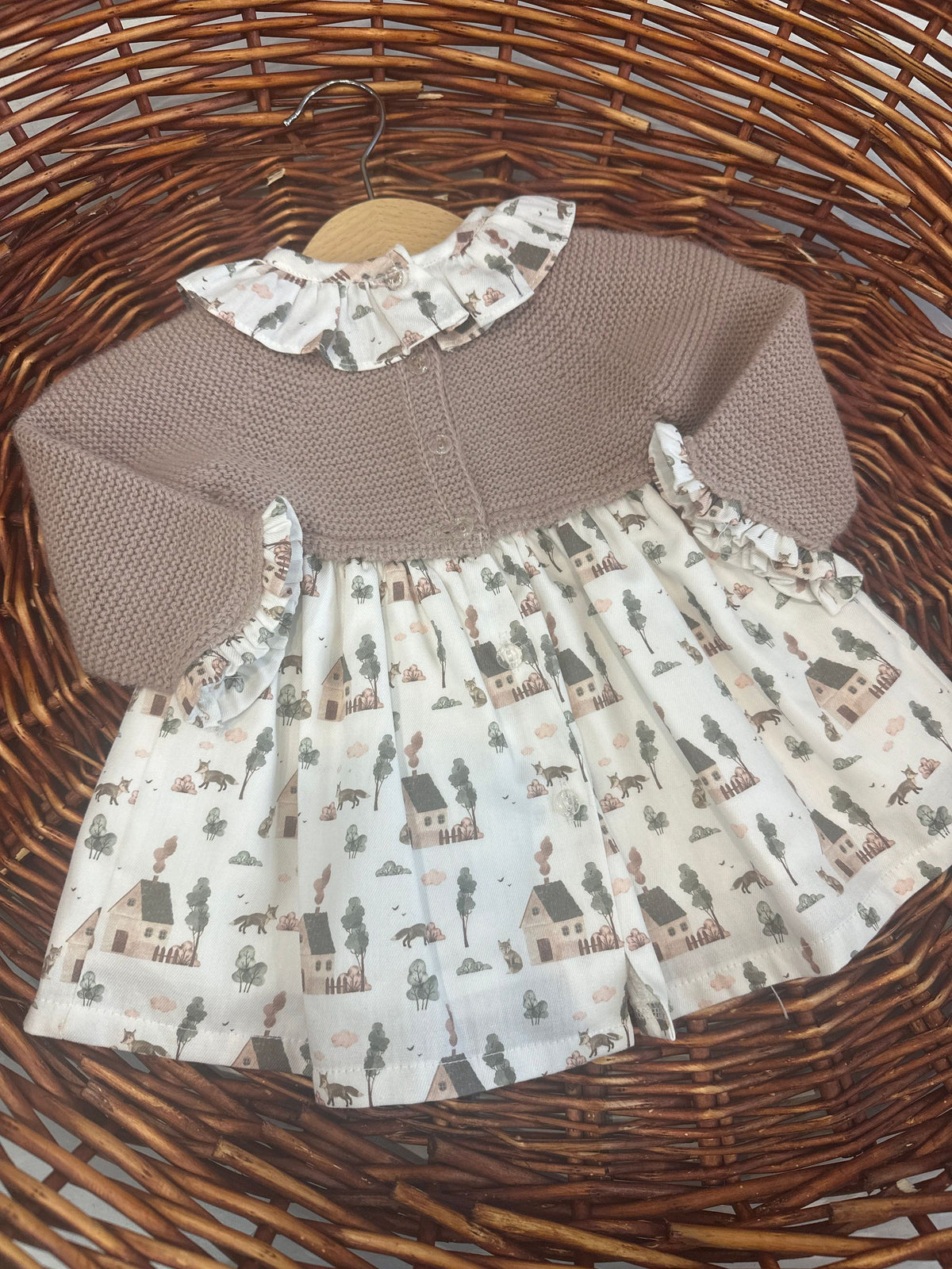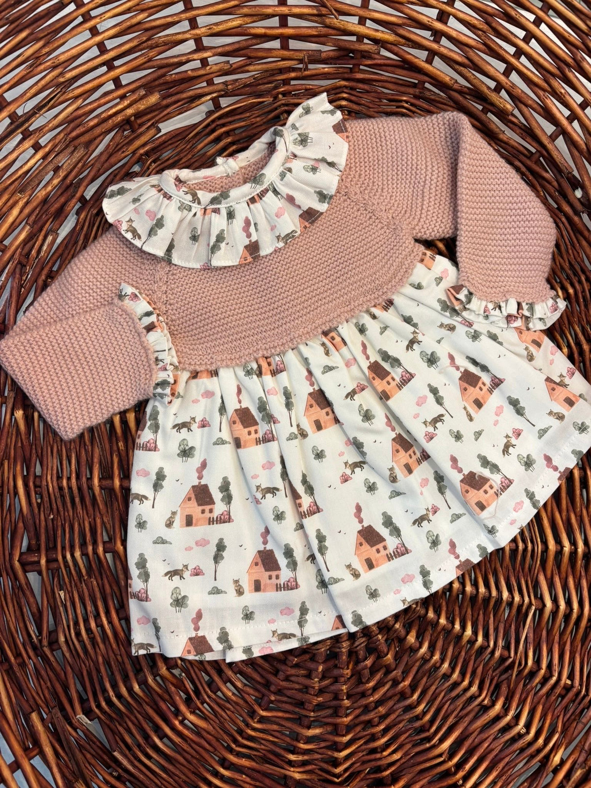 abito con corpetto in maglia e gonna fantasia tema prateria con casette e volpi,ad impreziosire il capo un colletto rouches a contrasto,l'abito presenta i bottoni sul retro per permettere l'apertura totale