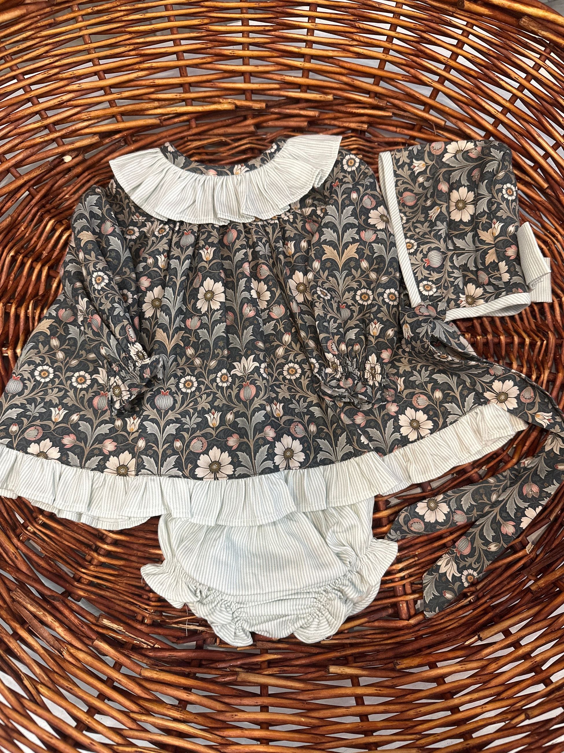 abito completo di cuffia con fiocco a contrasto e coulotte a contrasto,in cotone fantasia vintage a fiori con manica lunga e inserti fantasia righe a contrasto sempre sui toni del verde,l'apertura sul retro lo rendono0elegante e chic