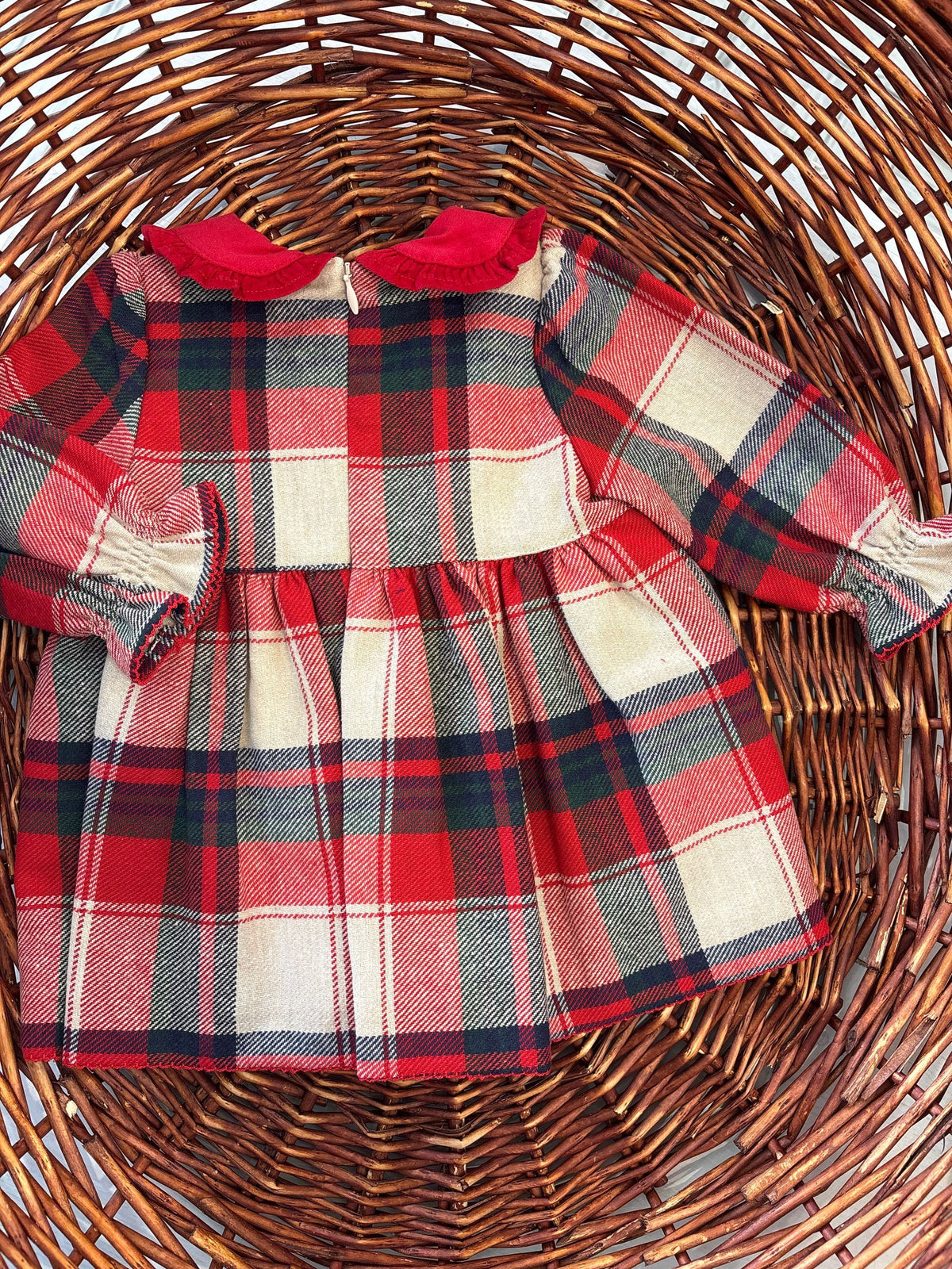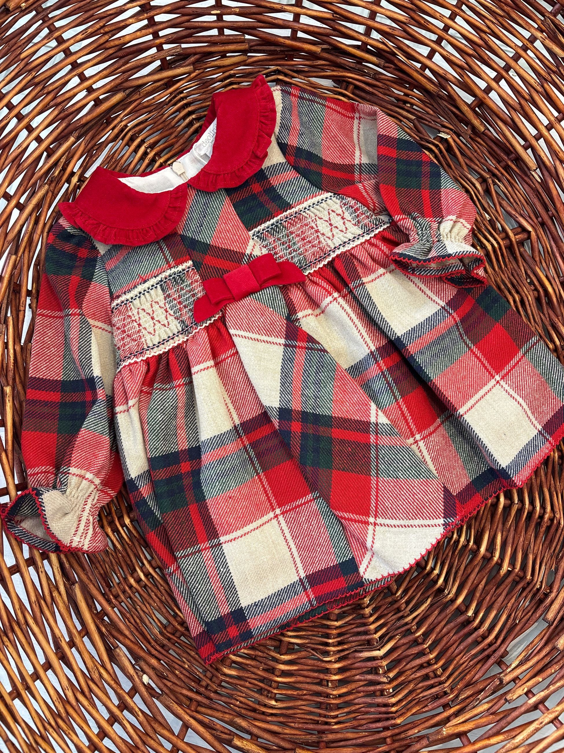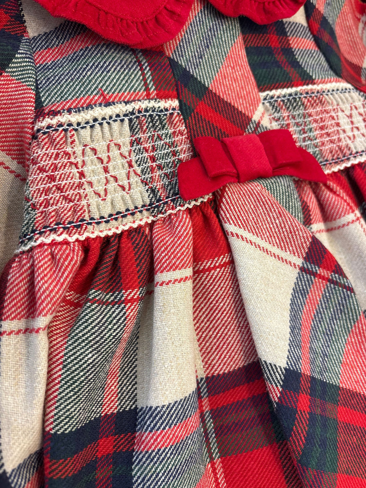 abito in tessuto quadro rosso e beije , manica lunga e collo camicia a contrasto,l'abito porta una decorazione effetto punto smoke e chiusura con la zip sul retro