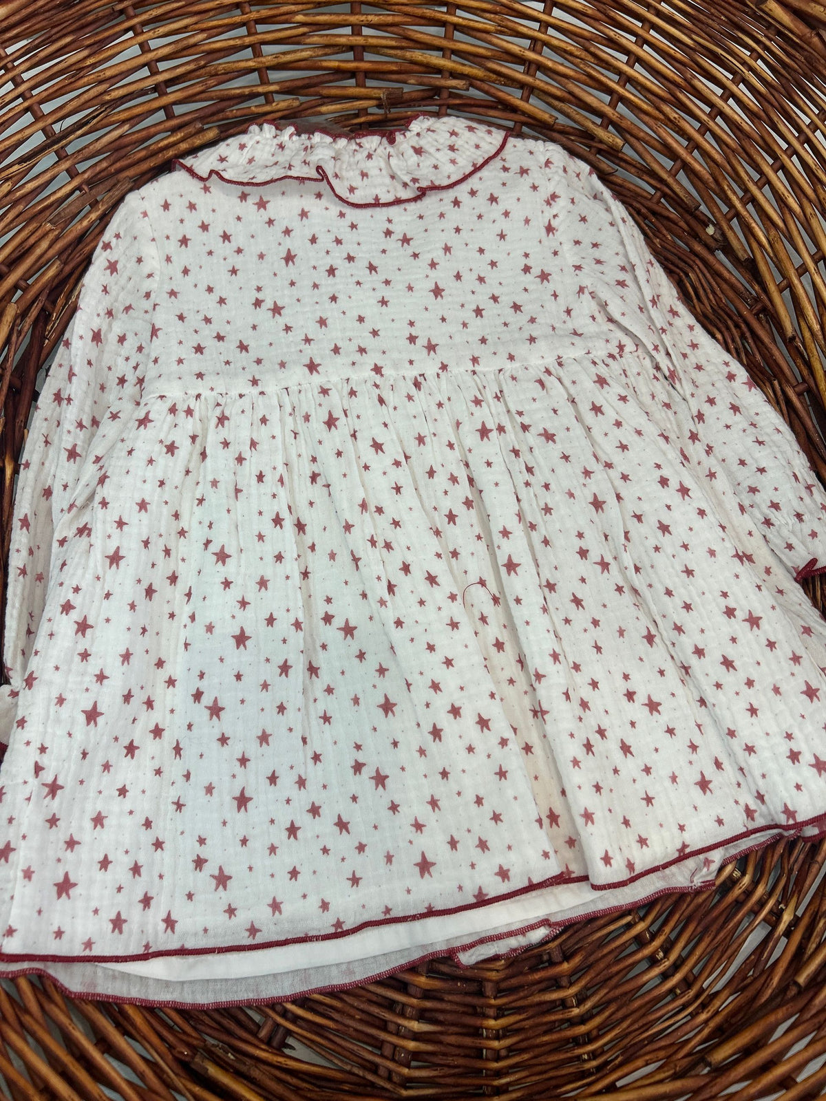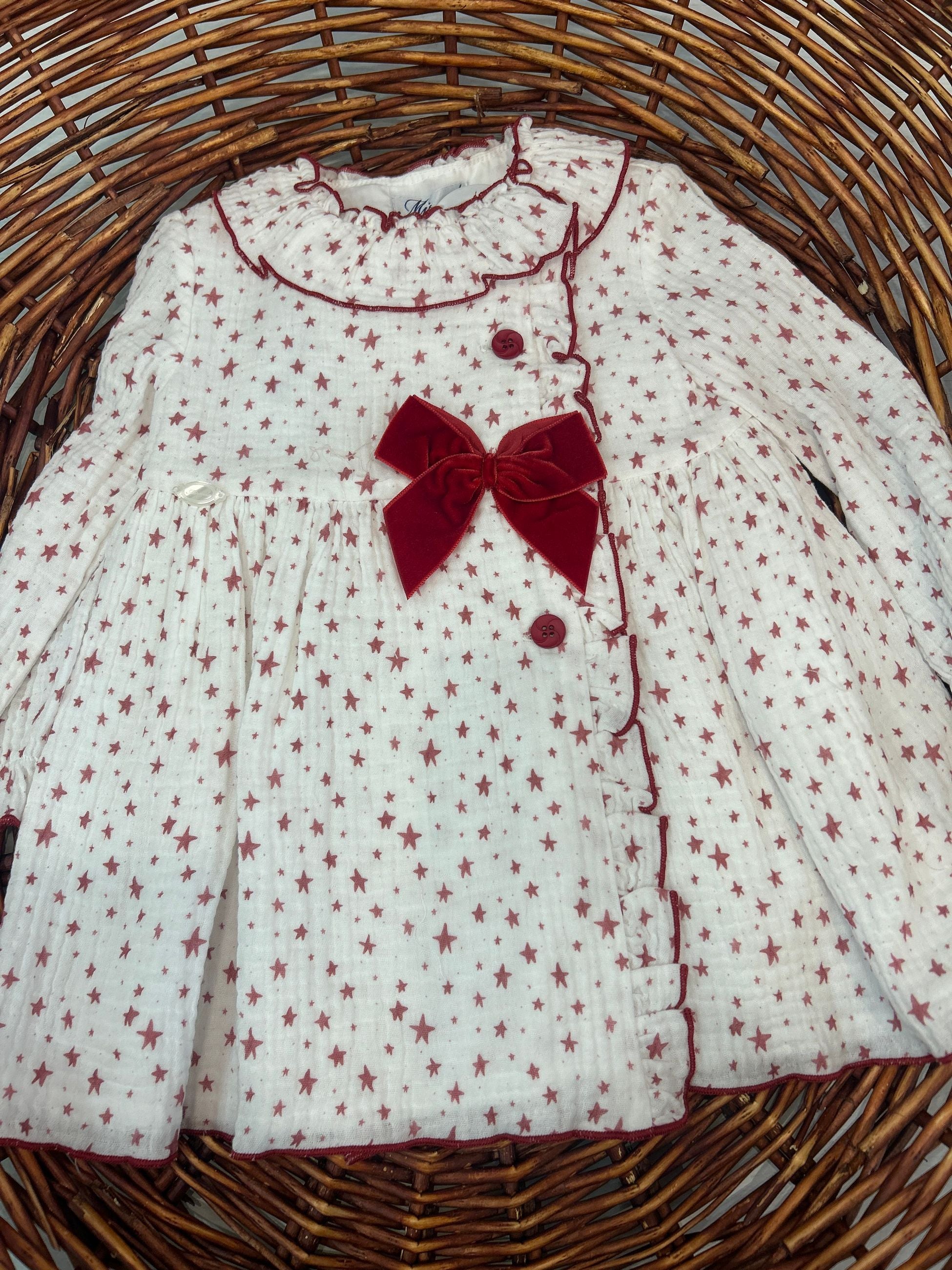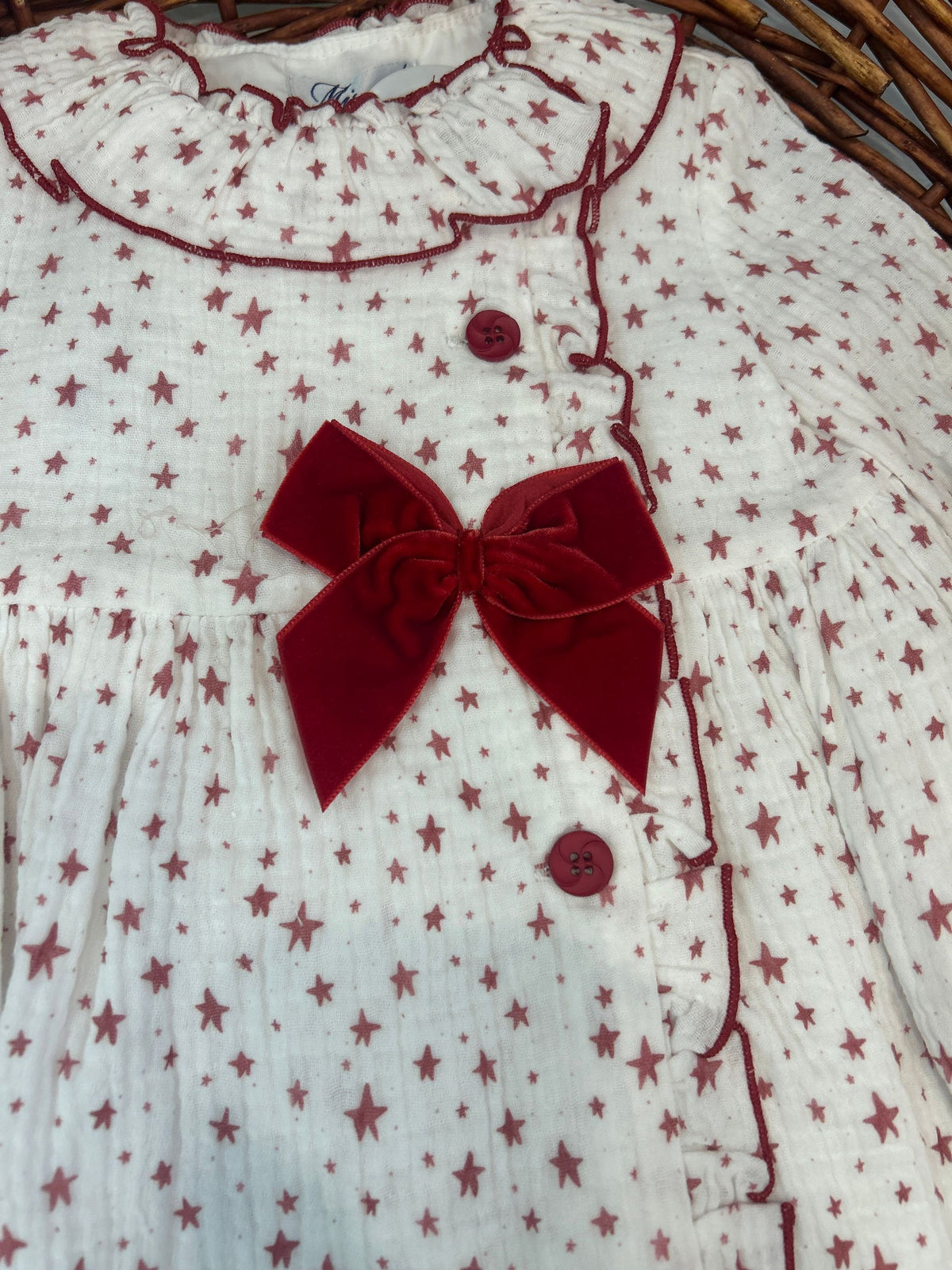 abito collo rouches con abbottonatura sul davanti e fiocco in velluto. la fantasia con le stelline rosse lo rende adatto anche al periodo natalizio ma non solo