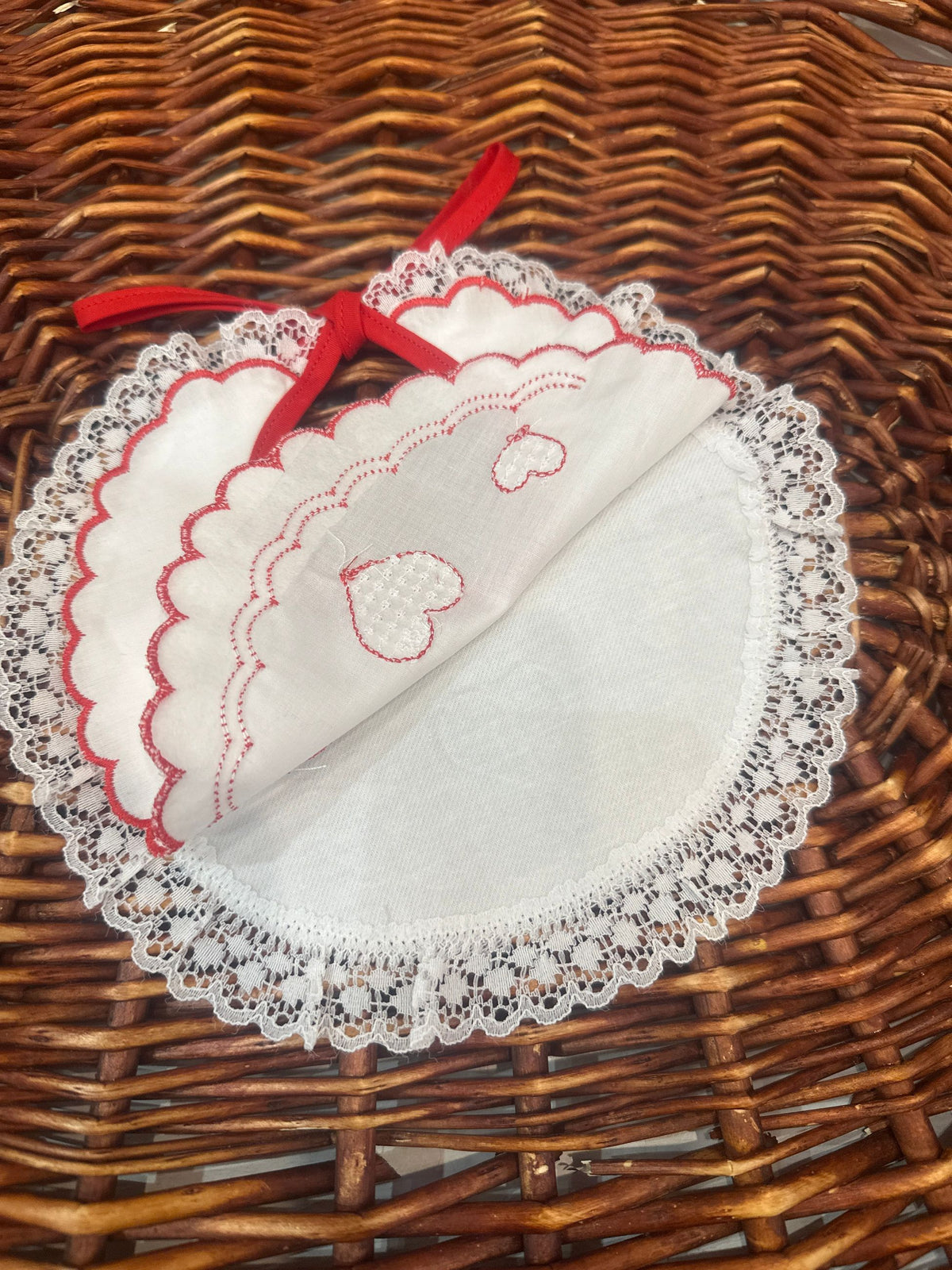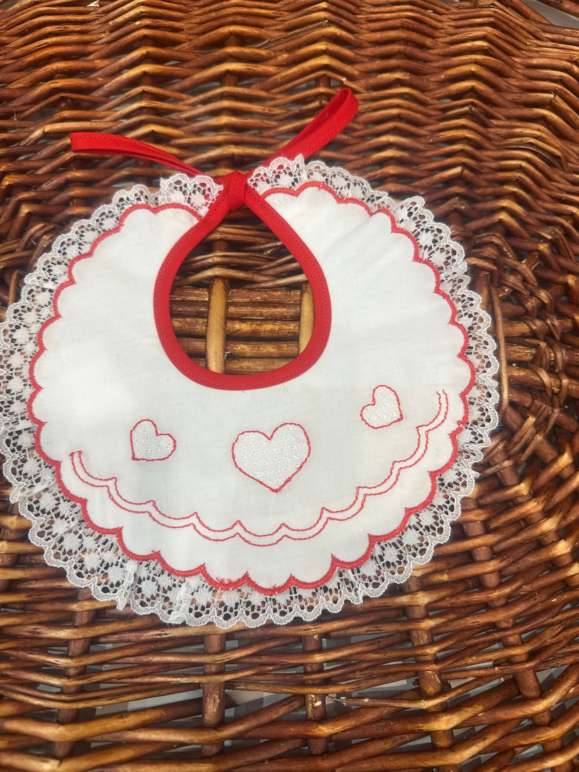 bavaglino con merletto sull'orlo e ricami cuori, allacciabile con fiocco